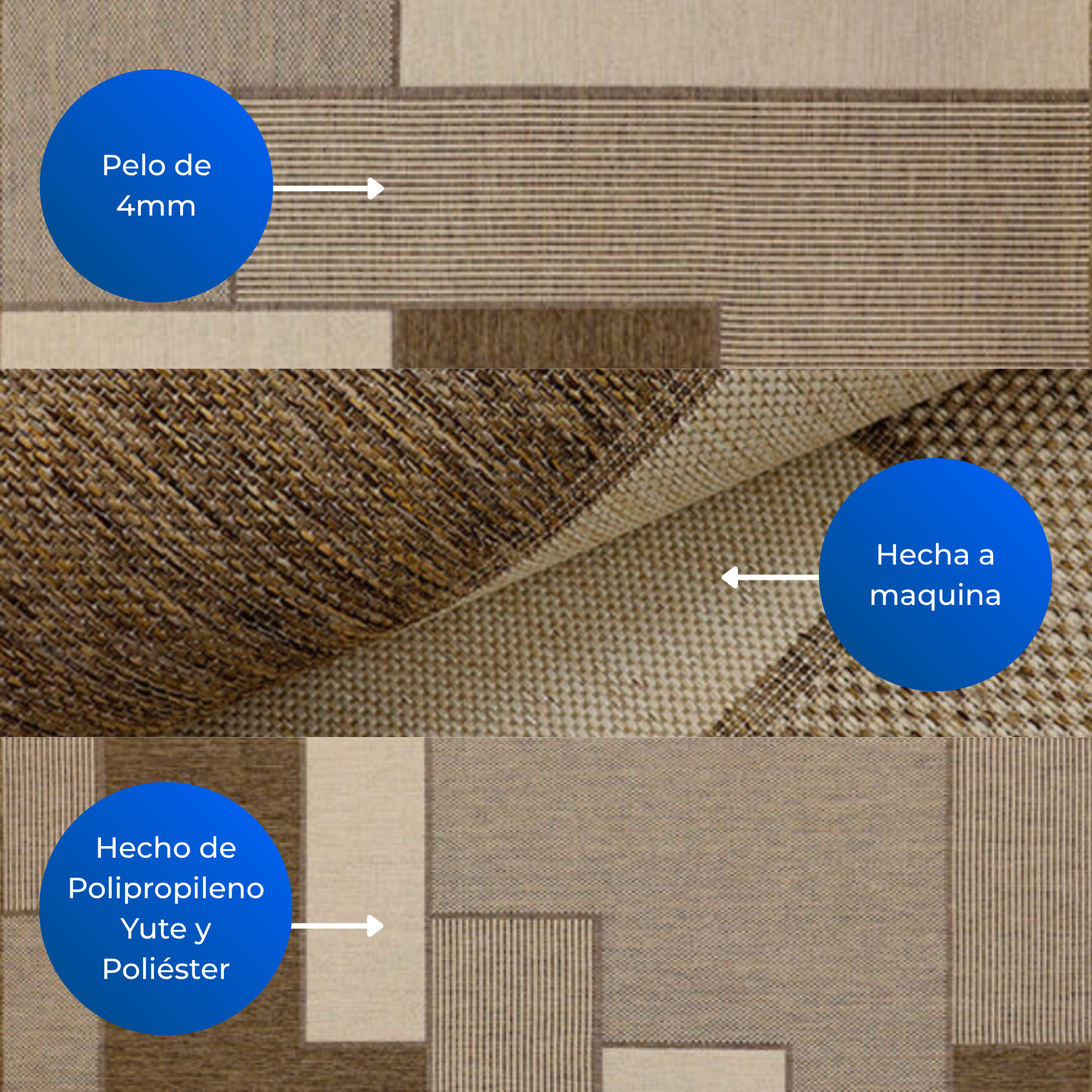 La alfombra Dover es el complemento ideal para aportar elegancia y sutileza al espacio en el que se ubique gracias a su diseño boucle de pelo corto de 4mm. Su base primaria esta compuesta de yute en 88% y 12% poliéster con puntos en PVC antideslizante su base secundaria de 50% poliéster 50% polipropileno y fibra de polipropileno en un 100% hecha a máquina y con un sistema SDR lo que garantiza durabilidad de sus colores ya que se tiñe el hilo durante su fabricación y no solo es su superficie.