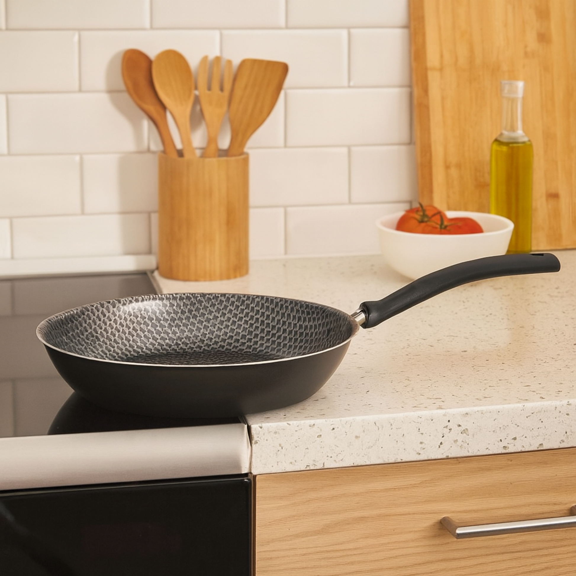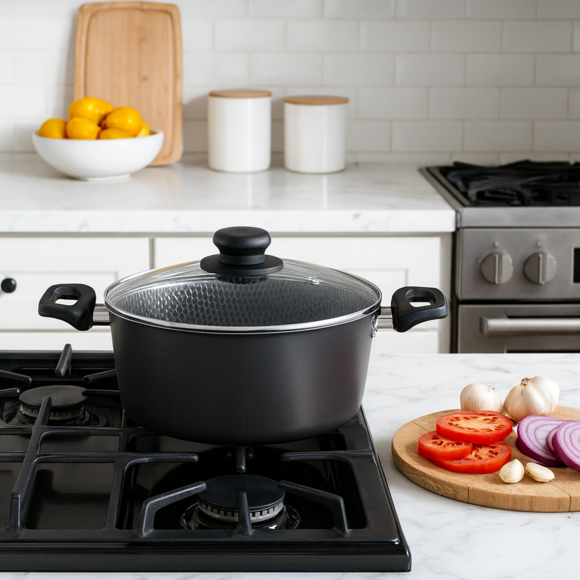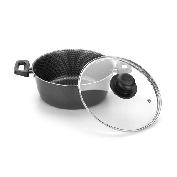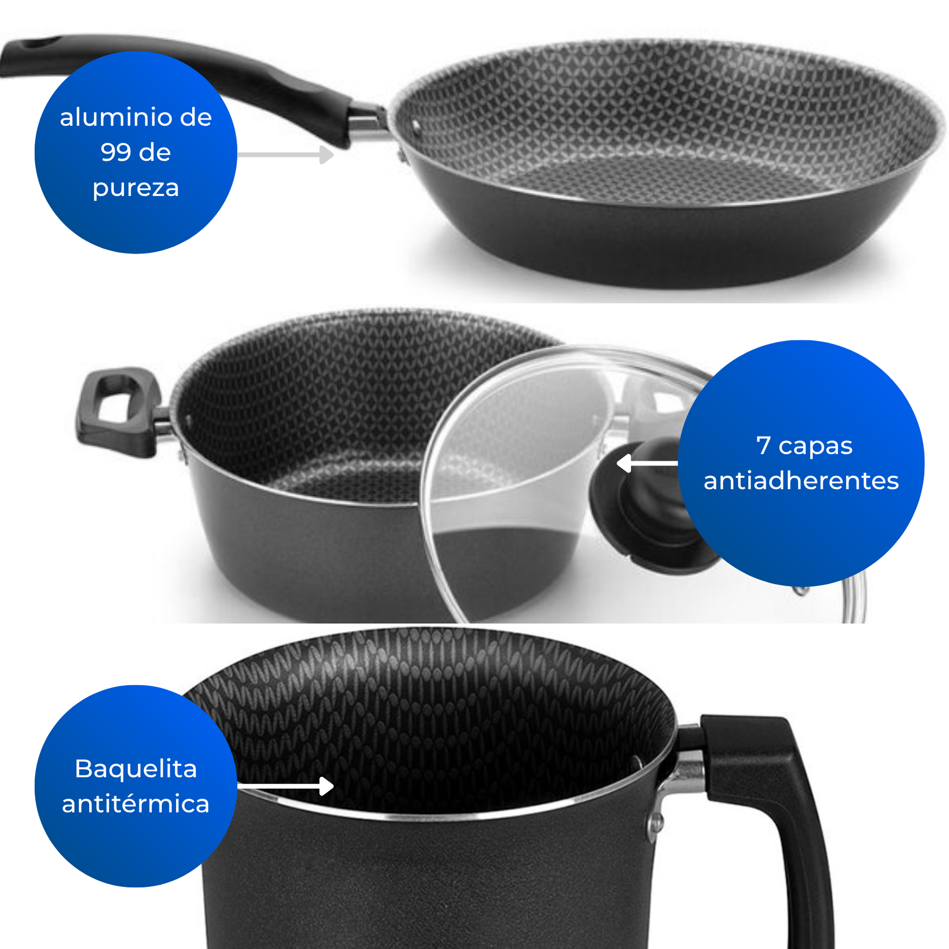 Su revestimiento interno de 7 capas antiadherentes evita que los alimentos se peguen y permite cocinar con menos aceite, mientras que las asas de baquelita antitérmica brindan un agarre seguro y cómodo.