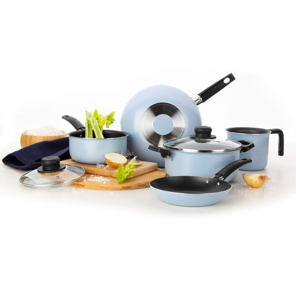 La batería de 5 piezas Blue está compuesta con aluminio de 99 7 de pureza revestimiento interno con 7 capas antiadherentes y baquelita antitérmica de 20 16 18 12 y 22 cm de diámetro y 3 tapas de vidrio templado. Cuenta con capacidad de 1 2 litros en el hervidor 1 litro en el sartén 2 7 litros en la cacerola y 1 4 y 2 00 litros en cada olla.