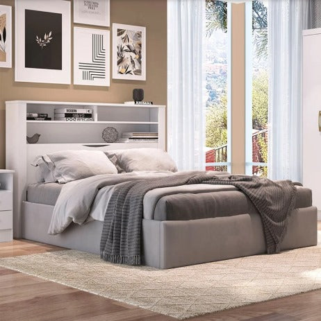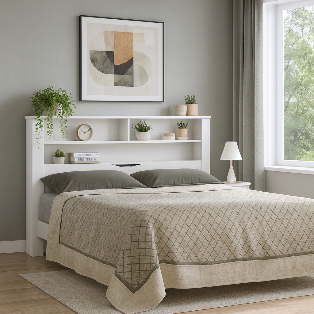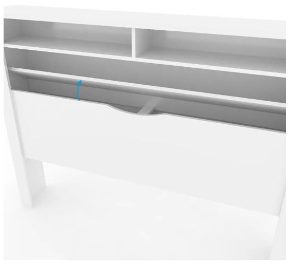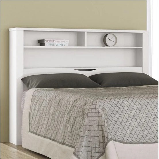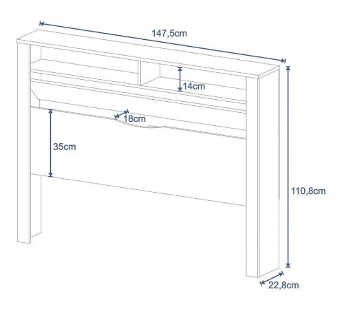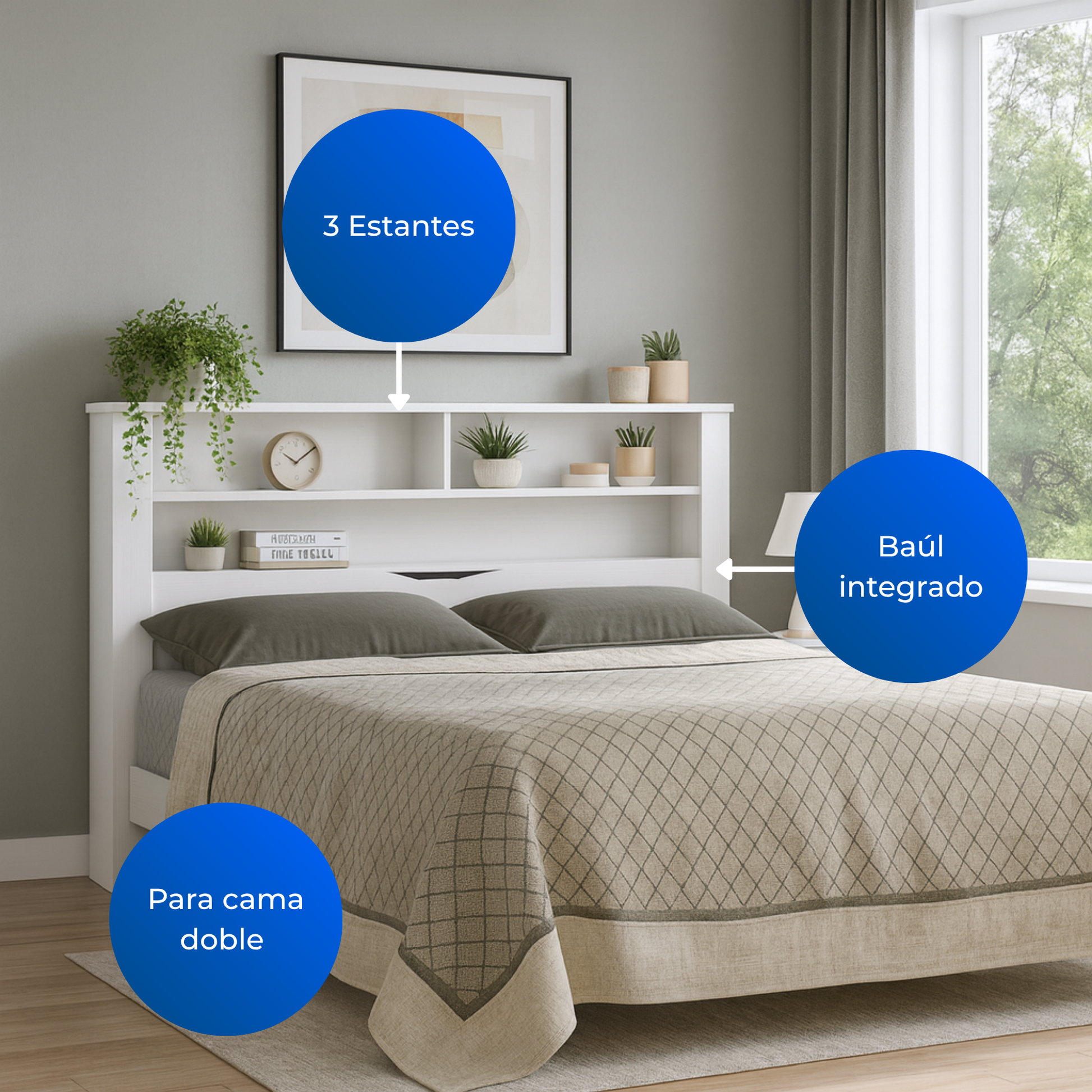 La Cabecera Doble con baúl Texas es un mueble de fácil armado, ideal para ubicar su base-cama y dar un toque moderno a su dormitorio. Cuenta con estantes incorporados que permiten la ubicación de objetos decorativos y de uso diario.