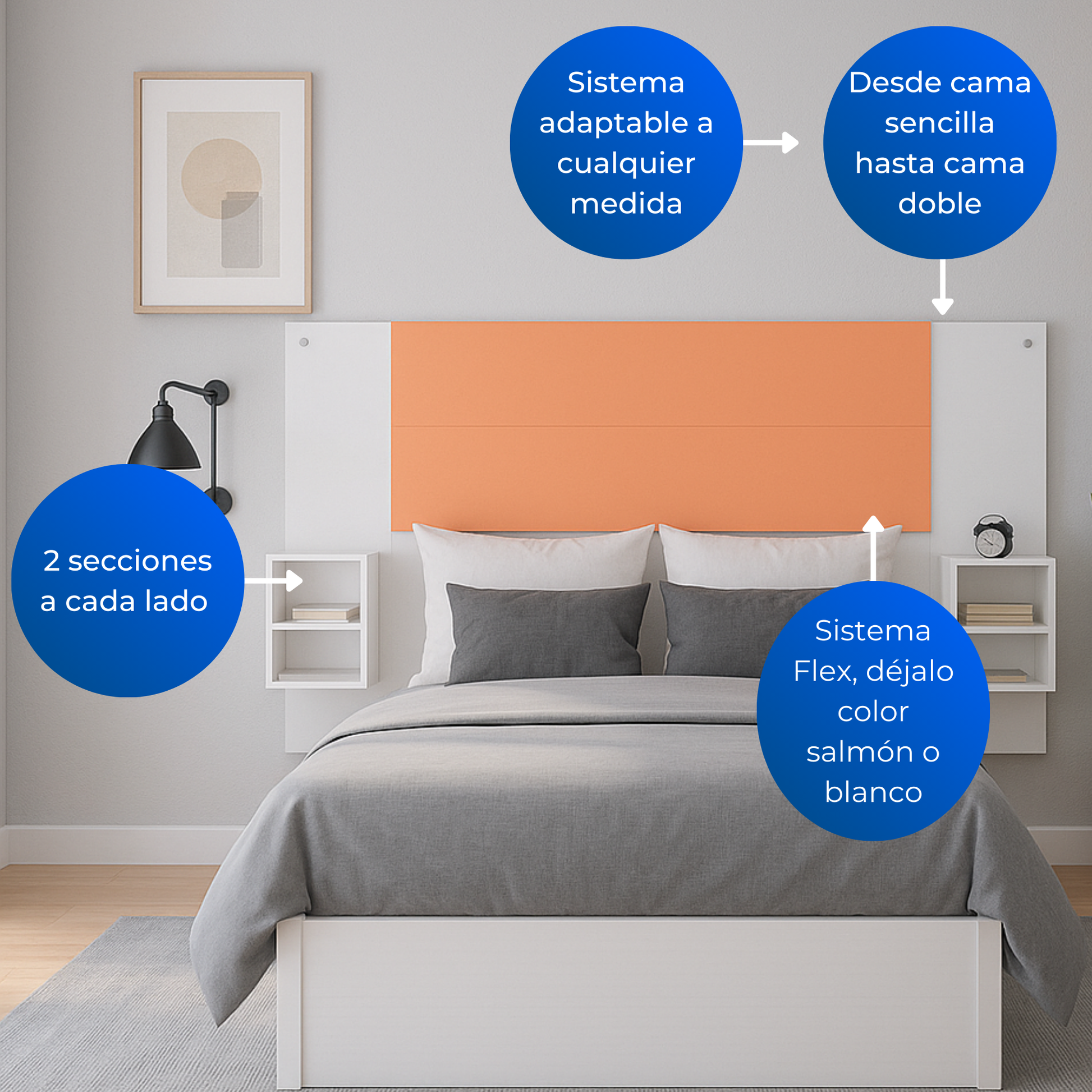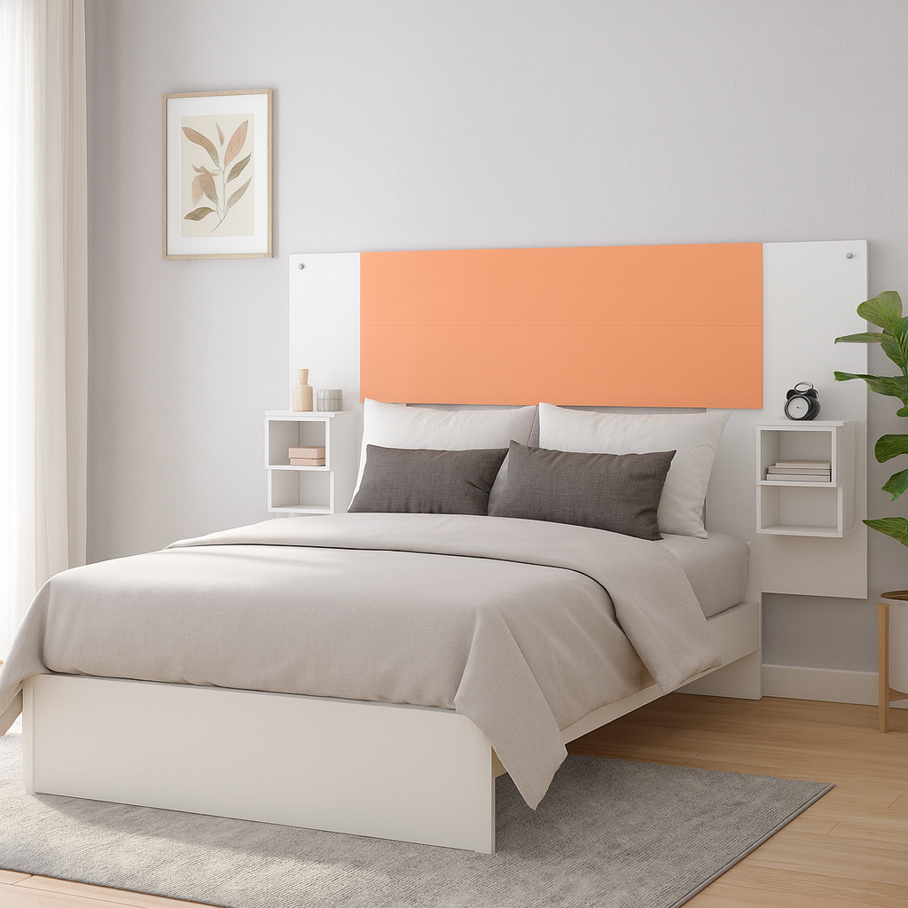 Gracias a su sistema flex, este mueble se transforma según tu gusto: completamente blanco para un ambiente puro y minimalista, o en una combinación blanco/salmón que añade un toque cálido y sofisticado. Una pieza inteligente que redefine la decoración contemporánea y convierte cada descanso en una experiencia de diseño.