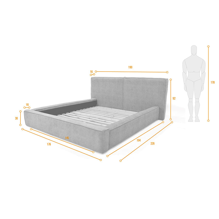 Aporta comodidad con un estilo original y moderno. Está fabricada en estructura de madera pino inmunizada naturalmente tapizada en tela poliéster de excelente calidad politex en la parte interna.Dimensiones: 190 cm ancho x 226 cm largo x 92 cm alto.Peso: 75 kg - Peso que soporta: 250 kg.Incluye: 1 Cama.No incluye elementos decorativos.Ensamble: Requiere ajustar el herraje de cama con tuerca hexagonal.El color del mobiliario en la fotografía es una aproximación al color real puede variar por la luz ambiente y la diferencia en la resolución de la pantalla del computador o dispositivo móvil.