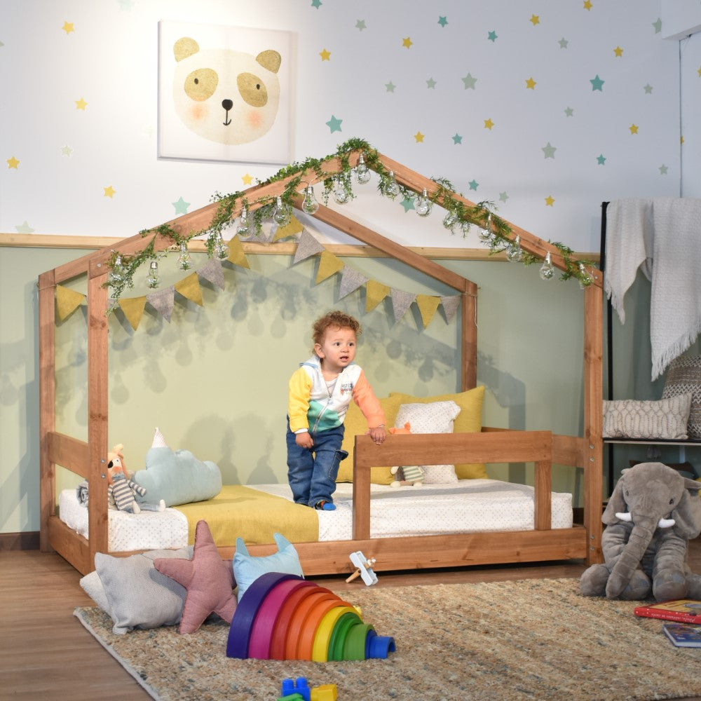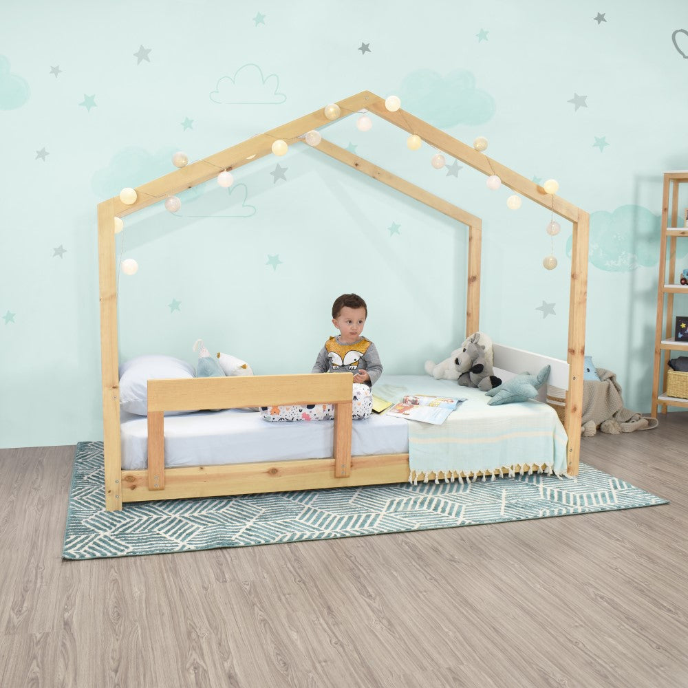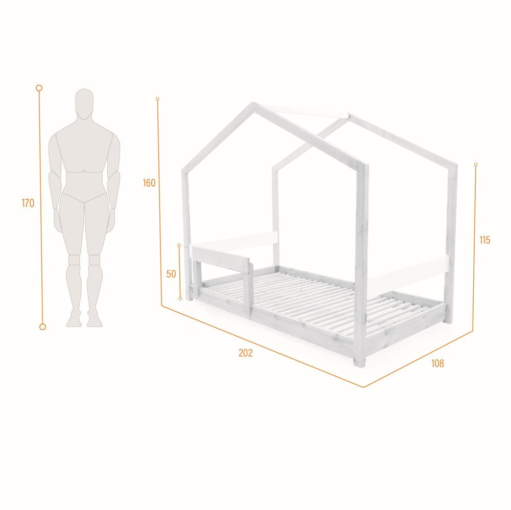 La Cama infantil Lazio ofrece independencia y seguridad por su baja altura al piso. Cuenta con un diseño moderno en forma de casa y baranda removible para brindar mayor seguridad. Está fabricada en madera pino con acabados en laca natural y laca blanca ajustes con caja y tornillo bristol de cabeza avellanada. Las medidas ideales para un colchón que encaje en la cama son 100 cm ancho x 190 cm profundidad x 15 cm alto.Dimensiones: 108 cm ancho x 202 cm largo x 160 cm altoPeso del Producto: 40 kg - Peso que soporta: 150 kg