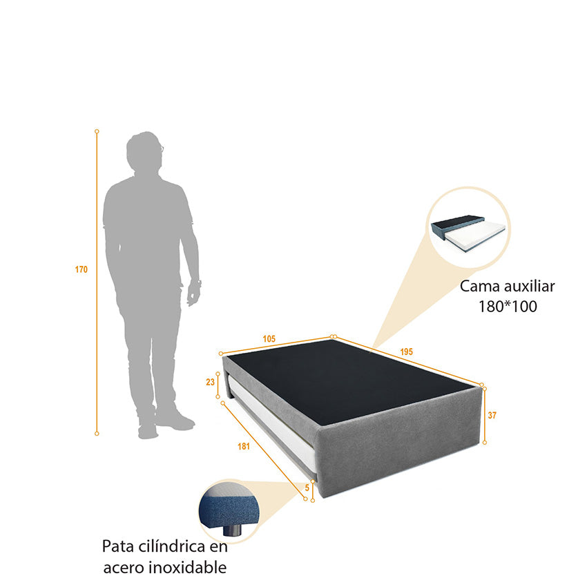 Es una opción ideal para quienes buscan funcionalidad y estilo en el mobiliario de los más pequeños. Esta cama cuenta con una estructura fabricada en madera pino está tapizada en tela poliéster en su parte superior no deja deslizar el colchón tiene politex en la parte inferior relleno con espuma de alta densidad. El relleno de la cama es de espuma de alta densidad y cuenta con patas cilíndricas en acero inoxidable. Además incluye una cama auxiliar que tiene unas medidas de 100 cm de ancho 180 cm de largo y 23 cm de alto es muy práctica ya que se puede guardar fácilmente debajo de la cama principal cuando no se está utilizando optimizando así el espacio disponible en la habitación. La cama auxiliar también incluye una colchoneta de 10 cm de grosor.Dimensiones: 105 cm ancho x 195 cm largo x 37 cm alto.Peso: 48 kg - Soporta: 180 kg.Incluye: 1 Cama NidoNo incluye elementos decorativos.No requiere ensamble por parte del cliente.El color del mobiliario en la fotografía es una aproximación al color real puede variar por la luz ambiente y la diferencia en la resolución de la pantalla del computador o dispositivo móvil.