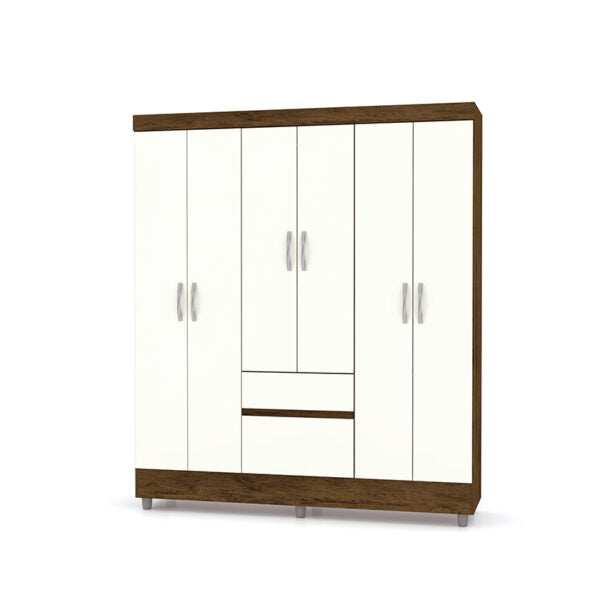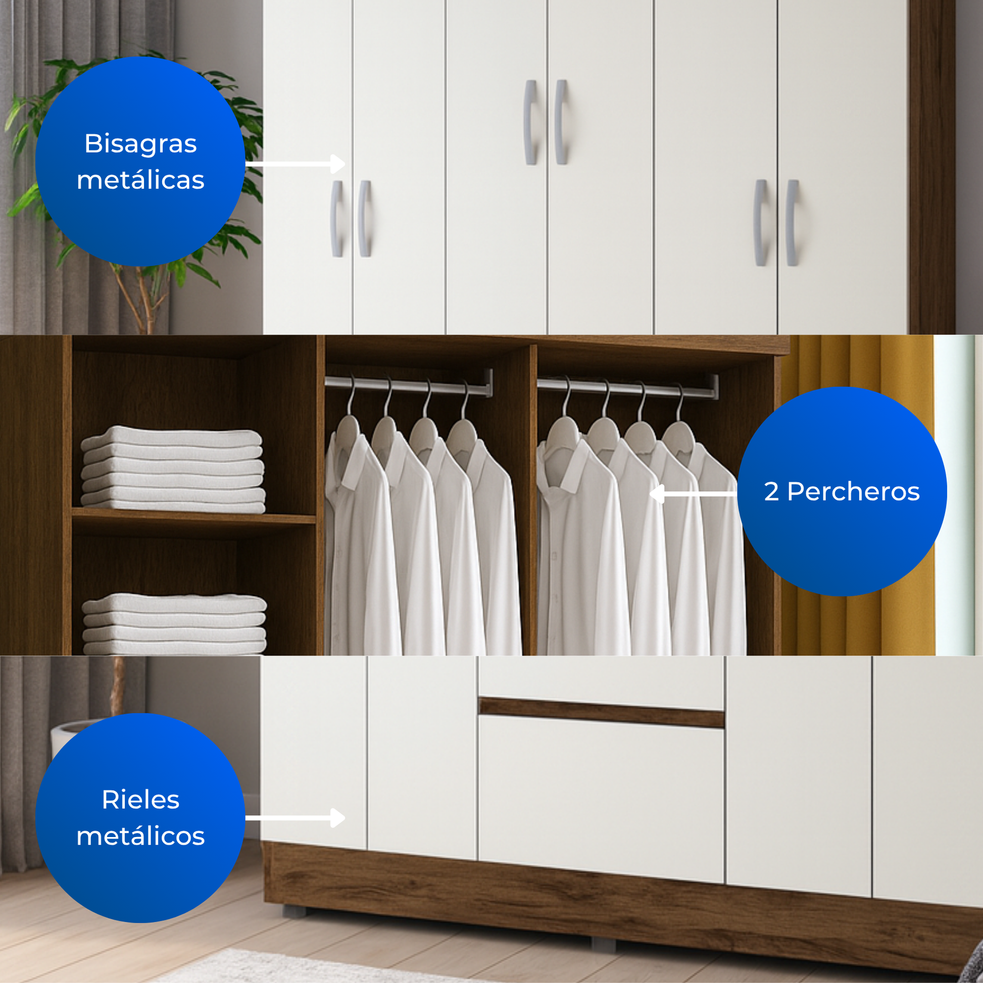 El Clóset Valent es una excelente opción para quienes necesitan amplio espacio de almacenamiento en el hogar. Gracias a su diseño de 6 puertas, 2 cajones y 5 compartimientos internos, permite organizar fácilmente ropa, calzado y accesorios. Además, su perchero metálico con dos opciones de montaje (horizontal o vertical) maximiza la distribución interna, adaptándose a tus necesidades.