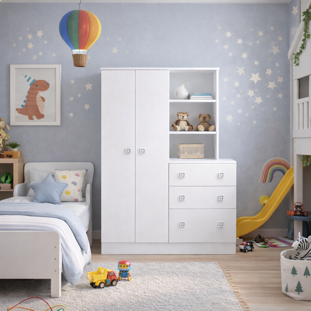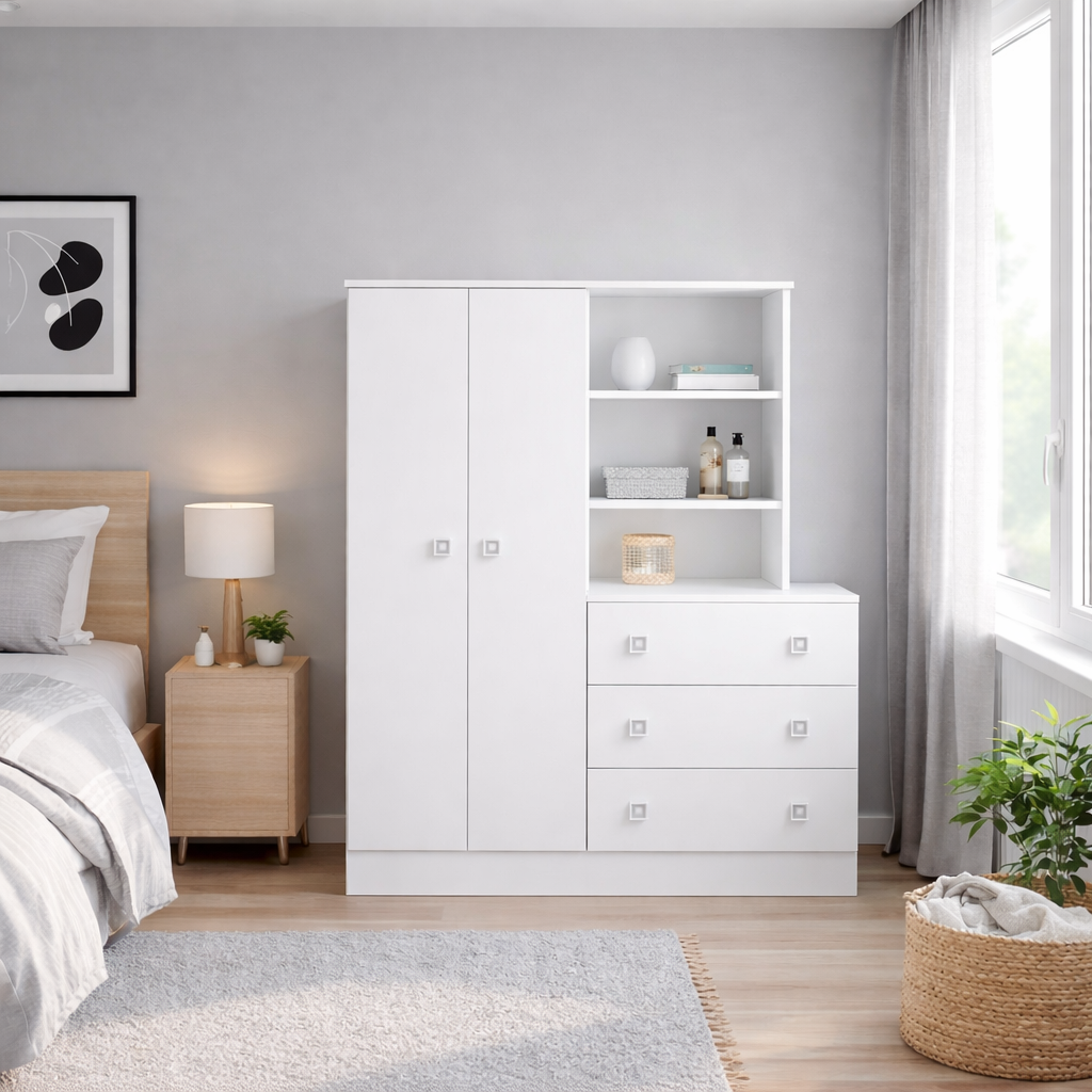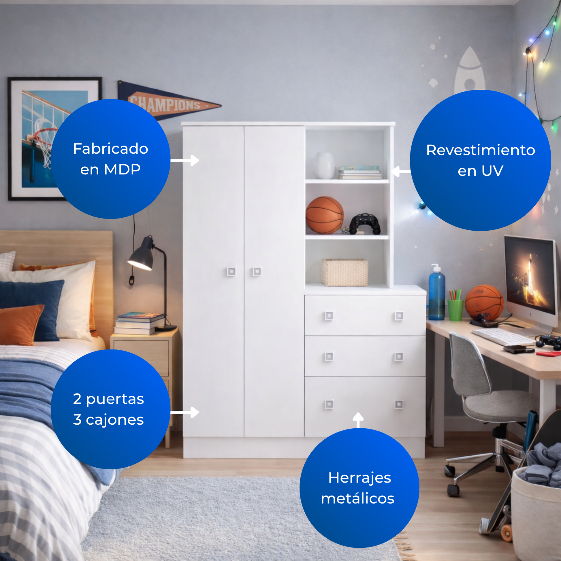 Este clóset con cómoda integrada, es ideal para mantener la habitación organizada con un diseño moderno, práctico y funcional. Su acabado en color blanco aporta amplitud visual y combina fácilmente con cualquier estilo, mientras su distribución con puertas, cajones, repisas y espacio para colgar permite guardar ropa, accesorios y objetos del día a día de forma cómoda y ordenada.