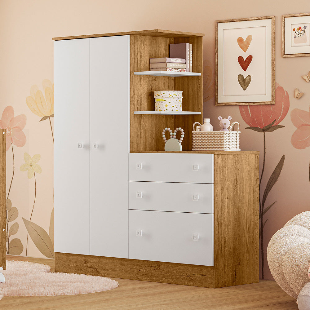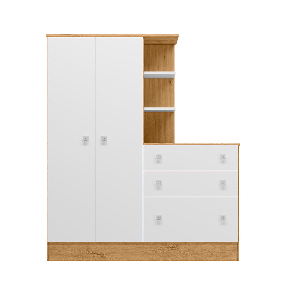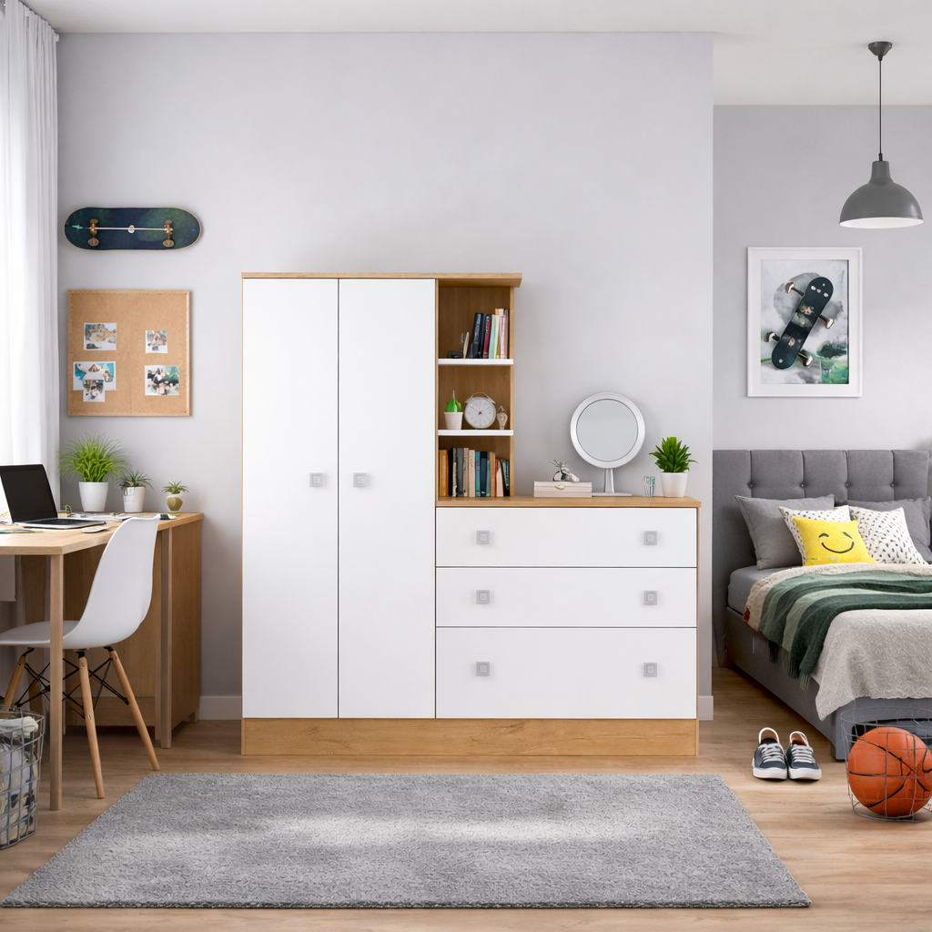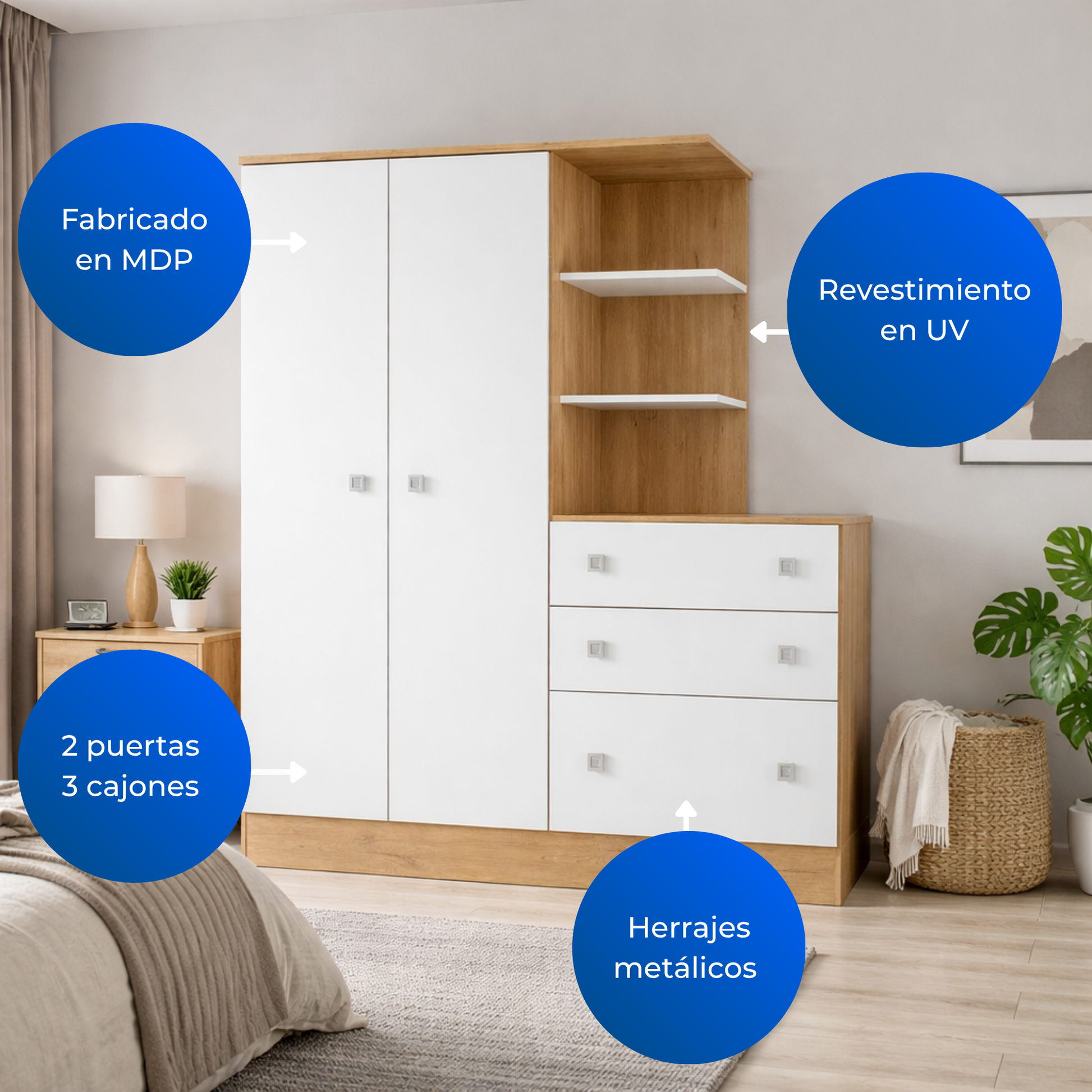 Este clóset con cómoda integrada, es ideal para mantener la habitación organizada con un diseño moderno, práctico y funcional. Su combinación de colores aporta diseño y se adapta fácilmente a cualquier estilo, mientras su distribución con puertas, cajones, repisas y espacio para colgar permite guardar ropa, accesorios y objetos del día a día de forma cómoda y ordenada.