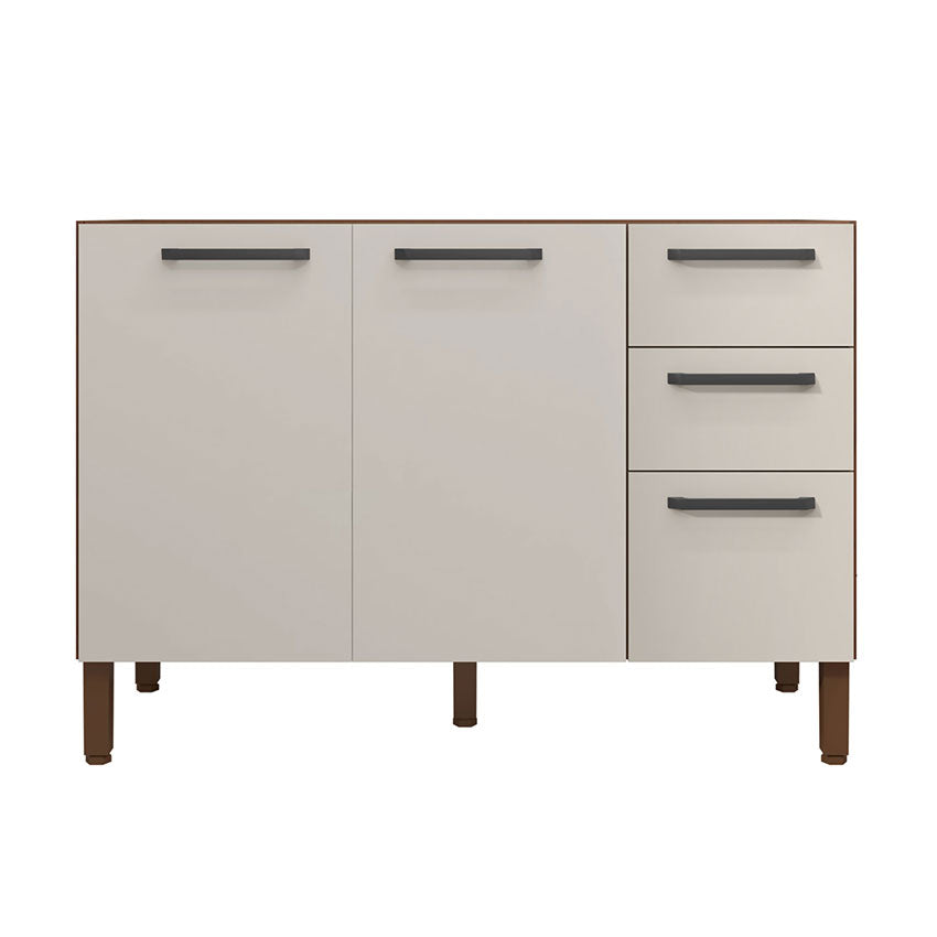 Mueble bajo: Tres (3) puertas, Dos (2) cajones, Cinco (5) manijas, Un (1) estante interno, Cinco (5) patas plásticas, Rieles metálicos, Bisagras metálicas, Kit de herraje, Manual de armado