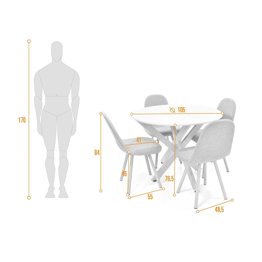 Diseño original que resalta en los espacios.La Mesa de Comedor Luxor 4 puestos está elaborada en una fuerte estructura de madera aglomerada cuenta con soportes en madera pino en forma de X lacados con acabado brillante y una superficie en MDF. La Silla Matiz es fabricada en una fuerte estructura metálica relleno en espuma de alta densidad y es tapizada en tela poliéster. Cuenta con patas metálicas pintadas con acabado simulando la madera.Dimensiones y peso:Mesa De Comedor: 105 cm ancho x 105 cm largo x 76 5 cm alto Peso del Producto: 18 kg - Peso que soporta: 70 kgSilla: 48 5 cm ancho x 55 cm largo x 84 cm altoPeso del Producto: 5 kg - Peso que soporta: 150 kgIncluye: 1 Mesa De Comedor 4 Sillas.No incluye elementos decorativos.Ensamble:Mesa De Comedor: Requiere ajustar la pata con tornillos bristolSilla: Requiere ajustar la base con tornillos bristolEl color del mobiliario en la fotografía es una aproximación al color real puede variar por la luz ambiente y la diferencia en la resolución de la pantalla del computador o dispositivo móvil.