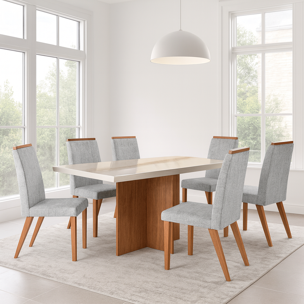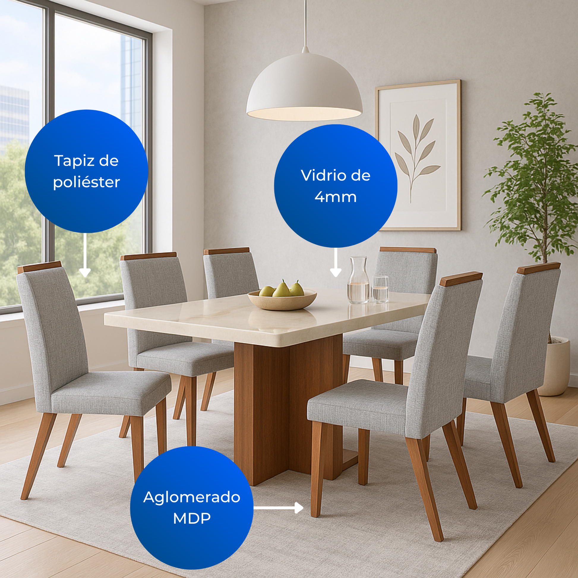 El Comedor Aurora de 6 Puestos combina materiales de alta calidad y un diseño contemporáneo que eleva la elegancia de cualquier ambiente. Su amplia superficie en MDP de 25 mm con cubierta de vidrio de 4 mm aporta un toque de distinción y resistencia, mientras que su base en MDP de 15 mm garantiza estabilidad y durabilidad. Las sillas, con estructura de madera maciza, tapizadas en suave poliéster y apoyadas sobre patas de 30 mm, ofrecen confort y estilo en cada detalle. Una pieza que transforma las reuniones cotidianas en experiencias llenas de diseño, confort y buen gusto.