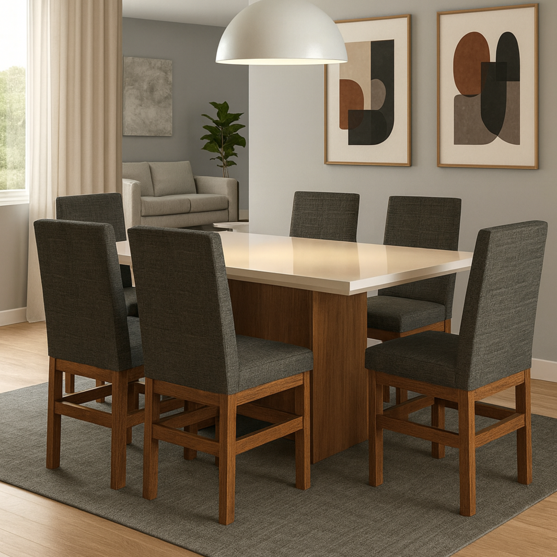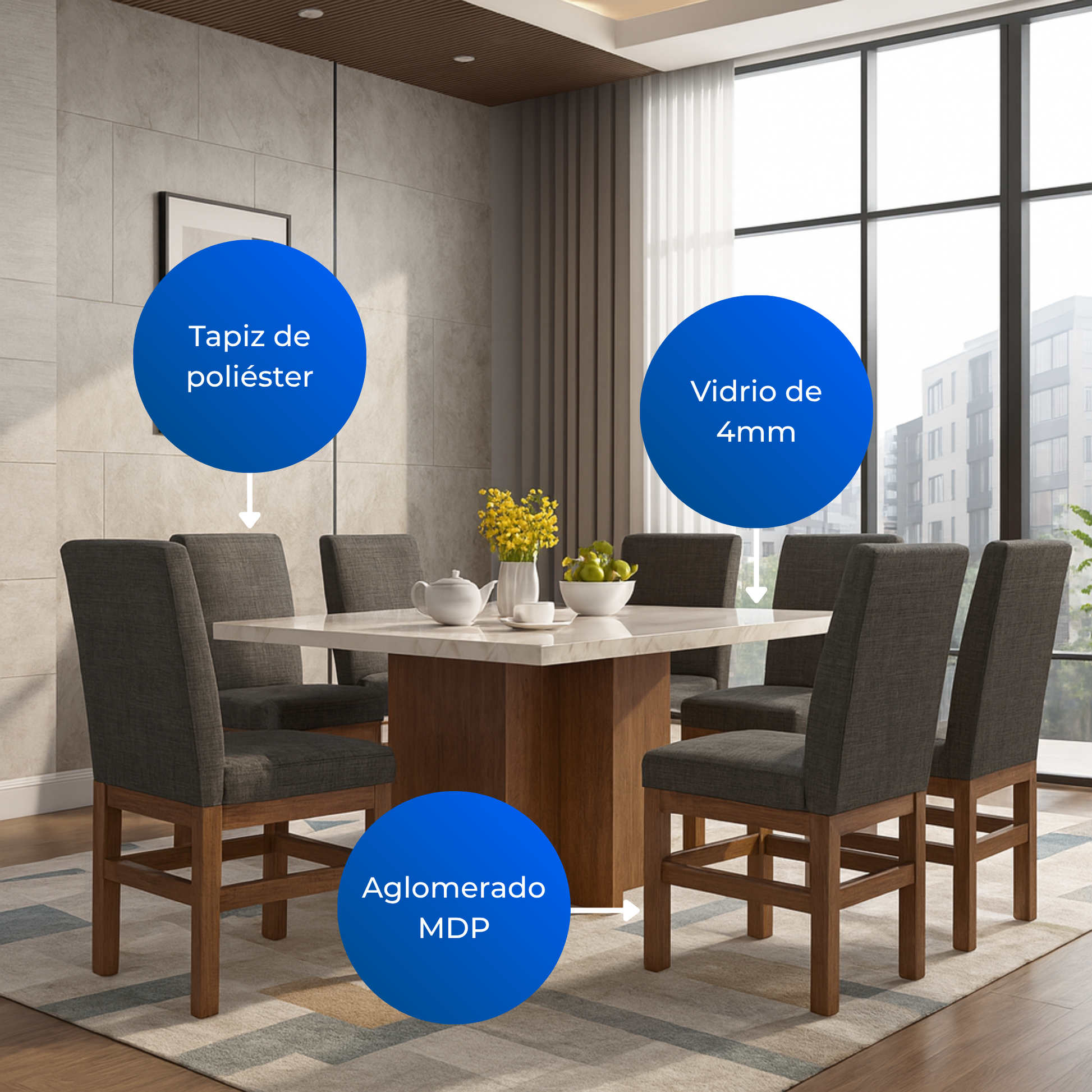 El Comedor Madison de 6 Puestos es la fusión perfecta entre diseño contemporáneo y materiales de alta resistencia. Su imponente superficie en MDP de 25 mm con vidrio de 4 mm refleja sofisticación y durabilidad, mientras que su base sólida en MDP de 15 mm garantiza estabilidad y firmeza en cada uso. Las sillas, diseñadas con estructura de madera de 20 mm, tapizadas en suave poliéster y apoyadas sobre patas de 30 mm, ofrecen comodidad y elegancia en cada detalle. Más que un comedor, es un espacio donde el diseño se encuentra con la calidez de cada encuentro.