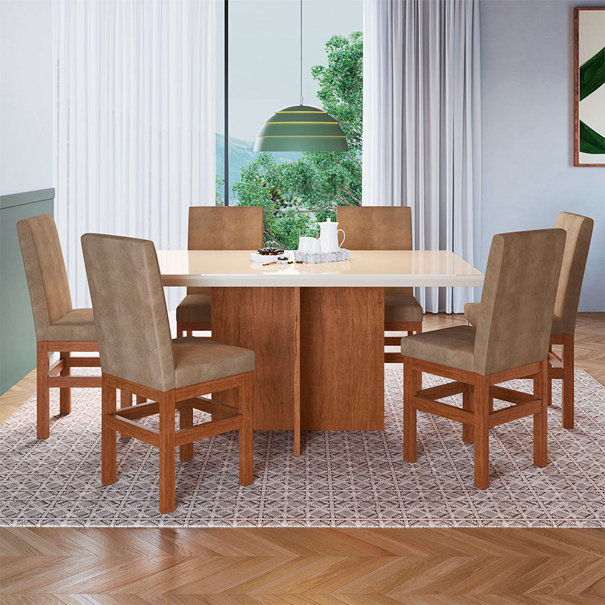 El comedor 6 puestos Tucson cuenta con una superficie en MDP de 25 mm y vidrio 4 mm y su base es de MDP de 15 mm. Las sillas están fabricadas con estructura de madera de 20 mm tapiz de poliéster y asientos de MDP de 12 mm con patas de madera de 30 mm.