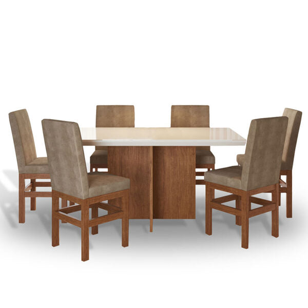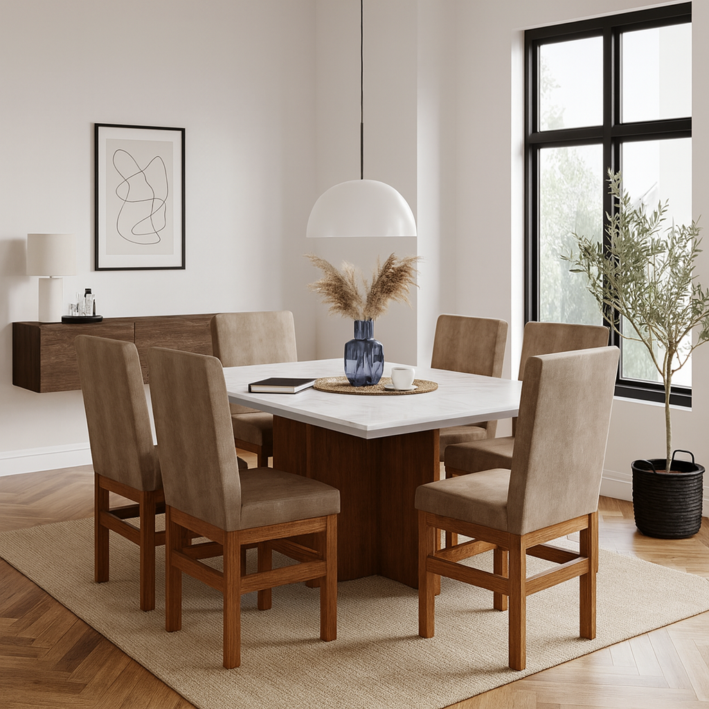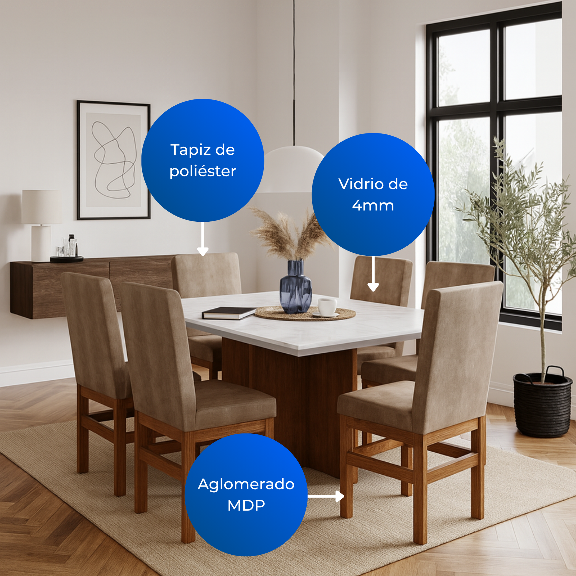 El Comedor Tucson de 6 Puestos combina diseño contemporáneo, materiales de alta calidad y una presencia imponente que realza cualquier ambiente. Su superficie en MDP de 25 mm con vidrio de 4 mm ofrece resistencia y un acabado refinado, mientras que su base en MDP de 15 mm brinda firmeza y durabilidad. Las sillas, elaboradas con estructura de madera de 20 mm, tapizadas en poliéster y apoyadas sobre patas de 30 mm, garantizan comodidad y elegancia en cada detalle. Un comedor pensado para disfrutar los momentos más importantes con estilo, confort y distinción.