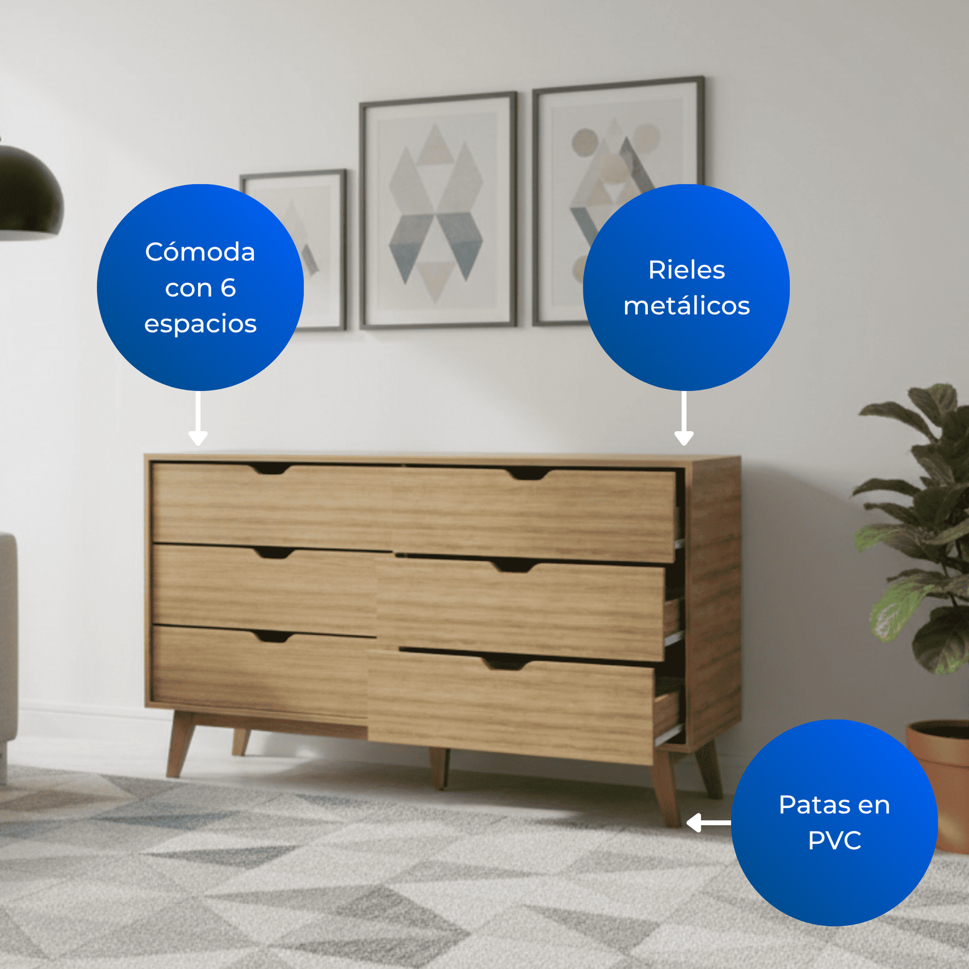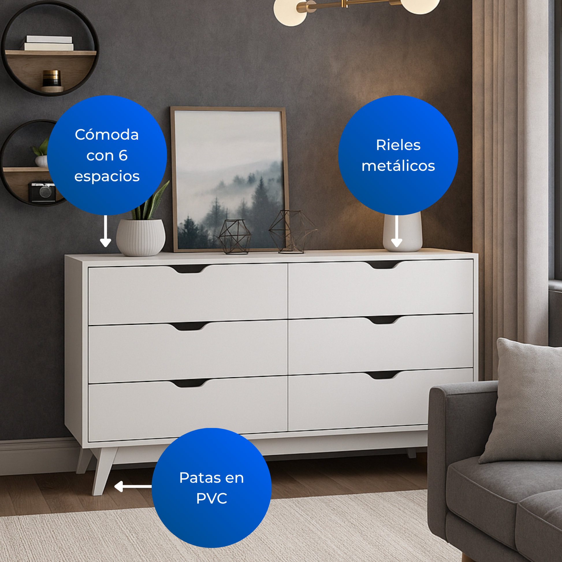 La cómoda moderna es el equilibrio perfecto entre elegancia y funcionalidad. Fabricada en MDP con recubrimiento BP, ofrece una estructura resistente y duradera que mantiene su belleza intacta con el paso del tiempo.