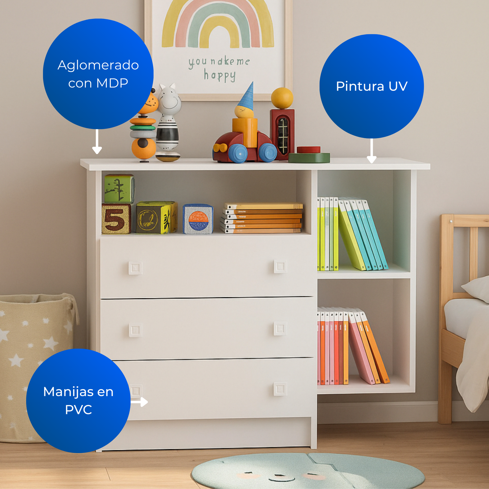 Fabricada en MDP de 15 mm con acabado resistente, ofrece durabilidad y facilidad de limpieza. Es perfecta para dormitorios, salas o estudios gracias a su tamaño compacto y capacidad de almacenamiento.