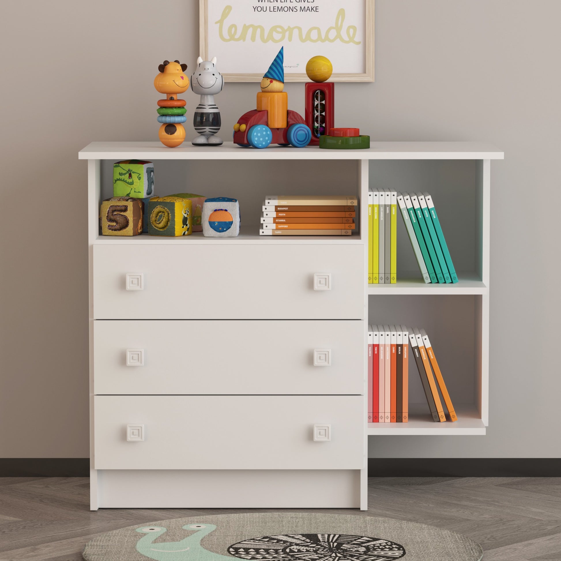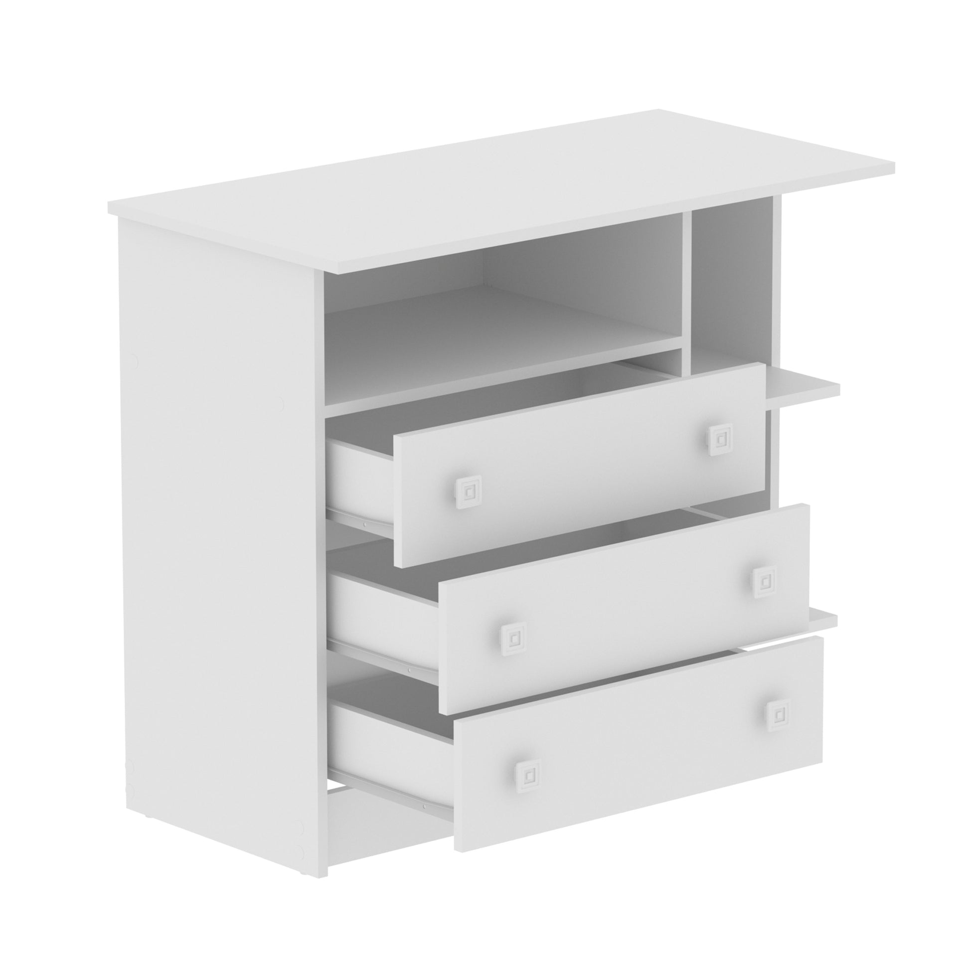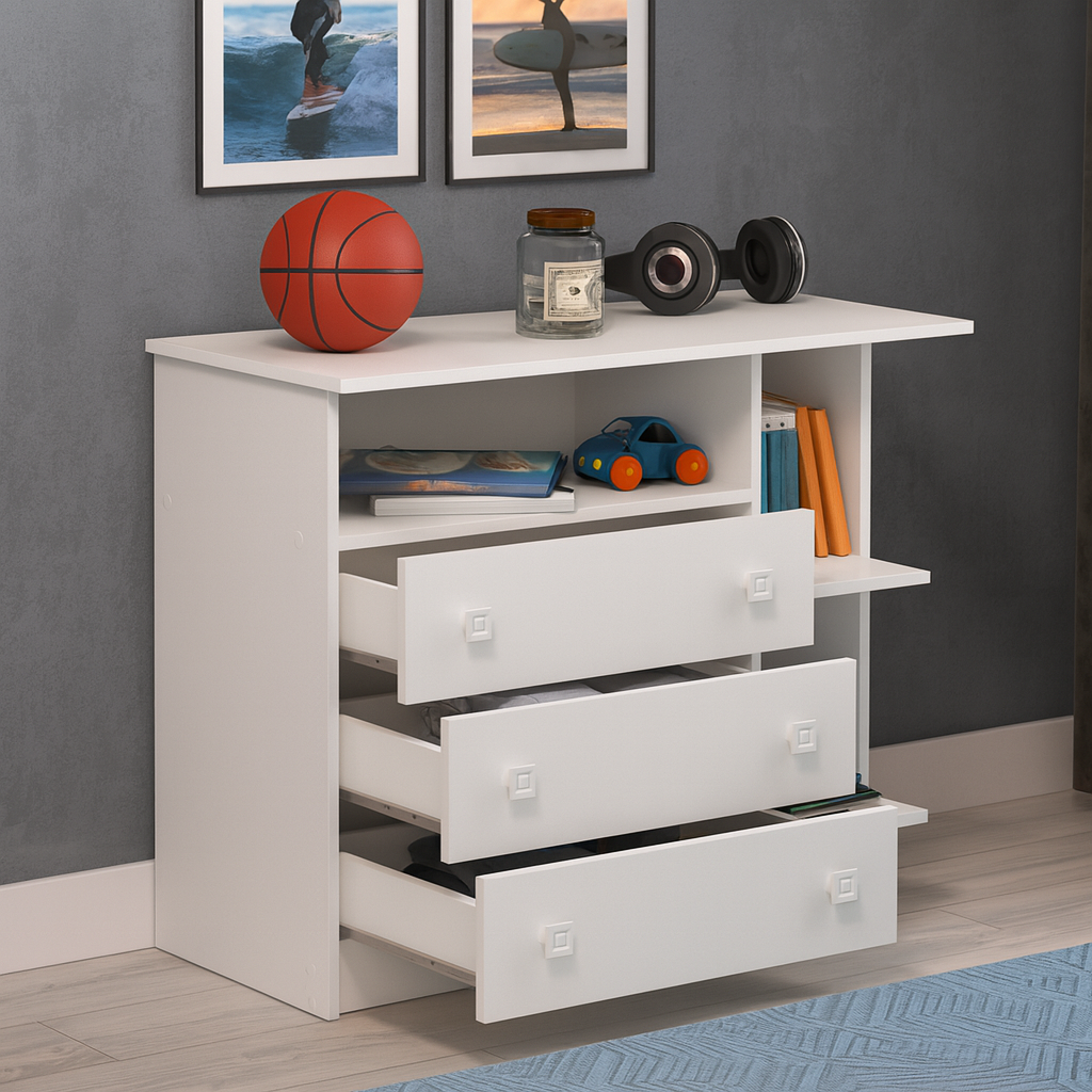 La Cómoda Manaos es una pieza funcional y elegante que se adapta fácilmente a diferentes estilos de decoración. Su diseño combina tres cajones espaciosos y dos compartimientos abiertos, ideales para organizar ropa, accesorios, documentos u objetos decorativos, manteniendo el orden y el estilo en tu hogar.
