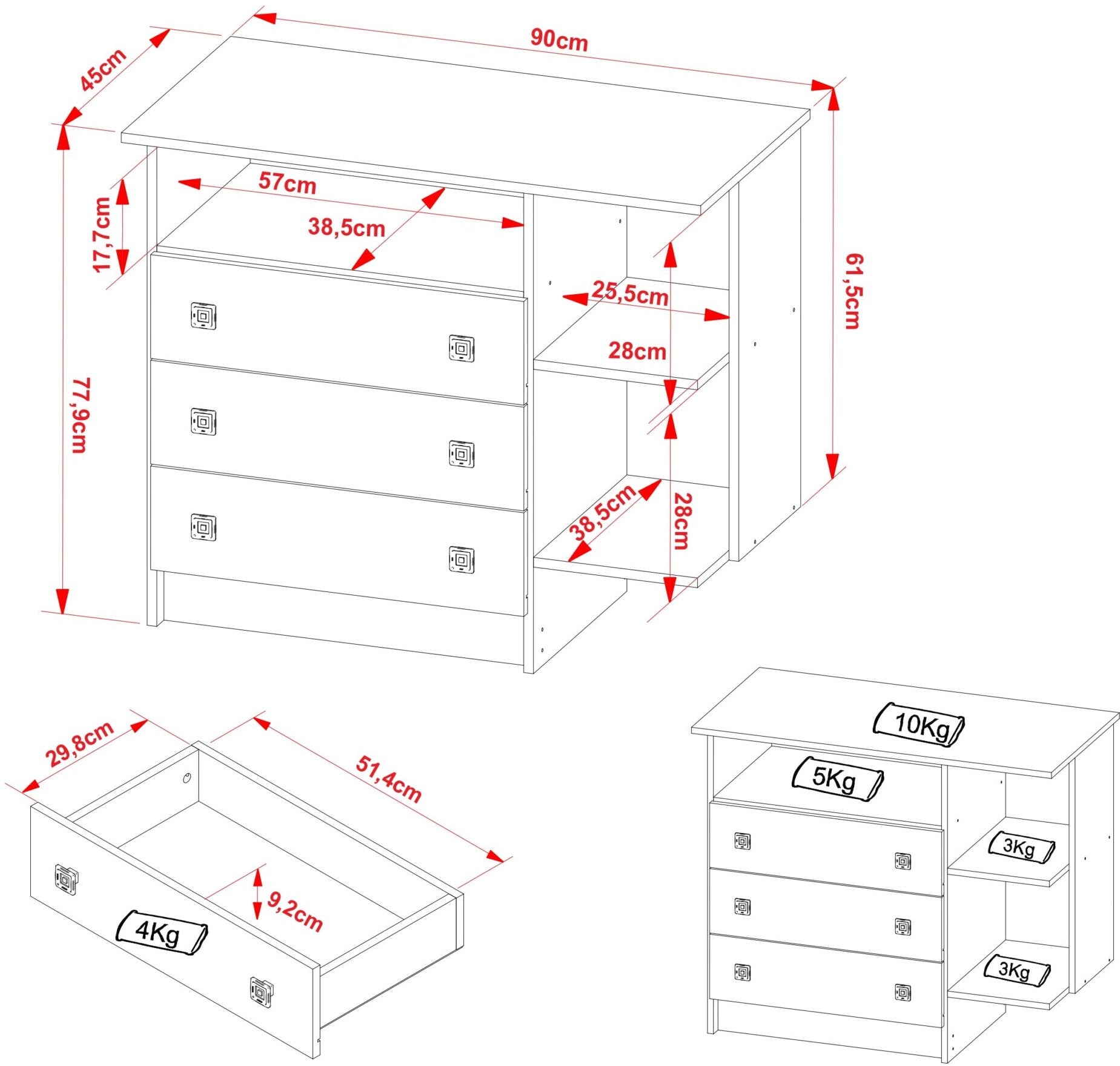 Peso recomendado 10 kg en tabla superior, 4 kg en cada cajón y 3 kg en los compartimientos.