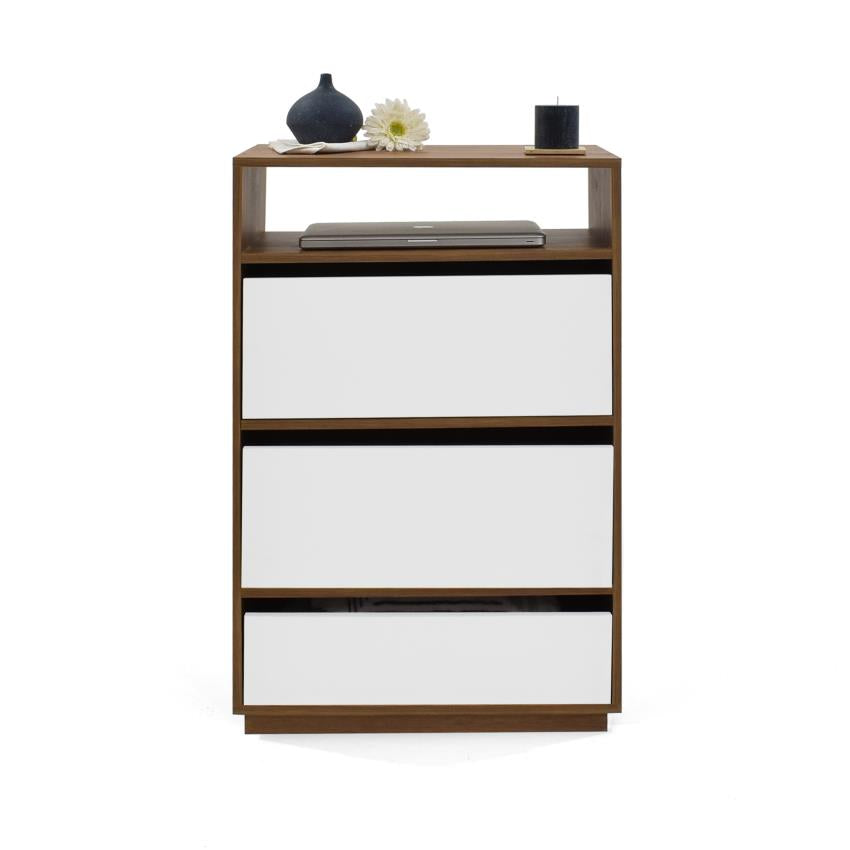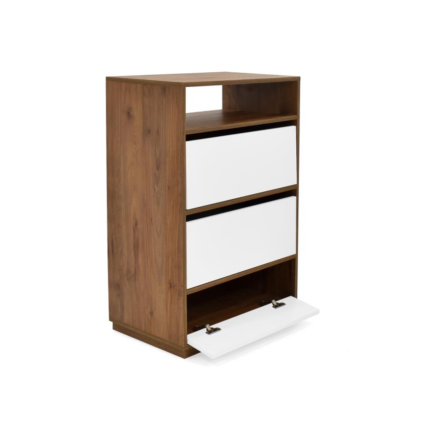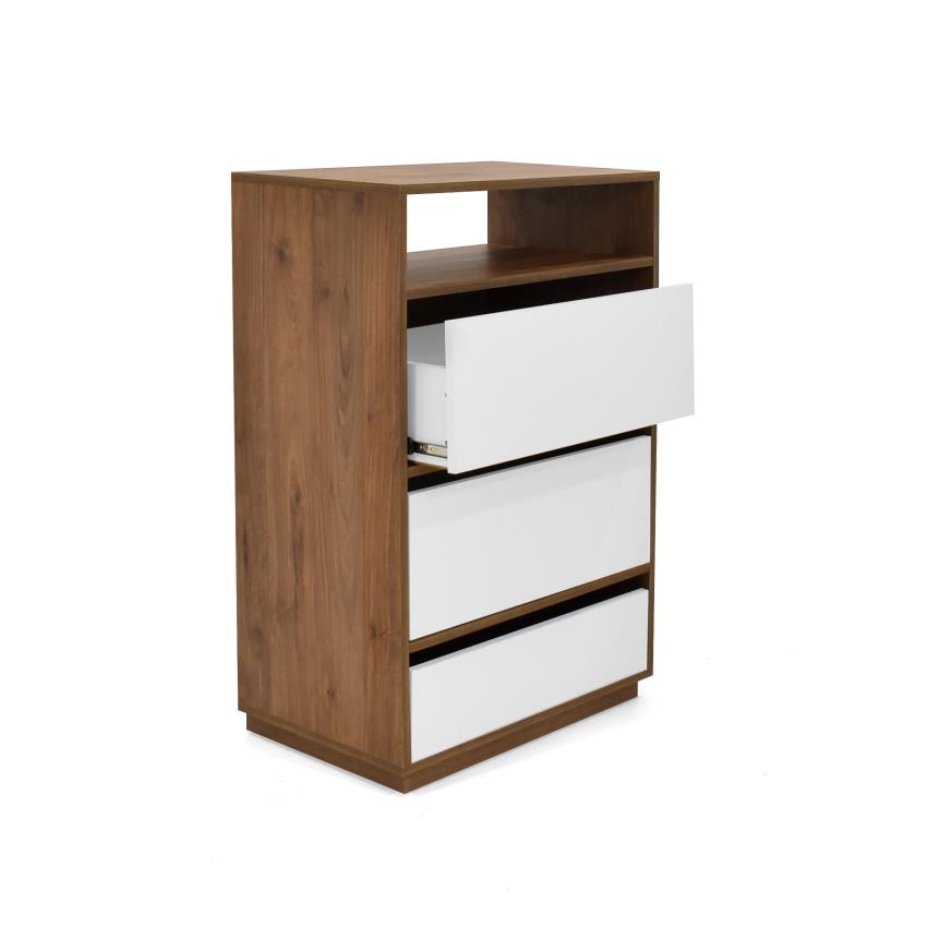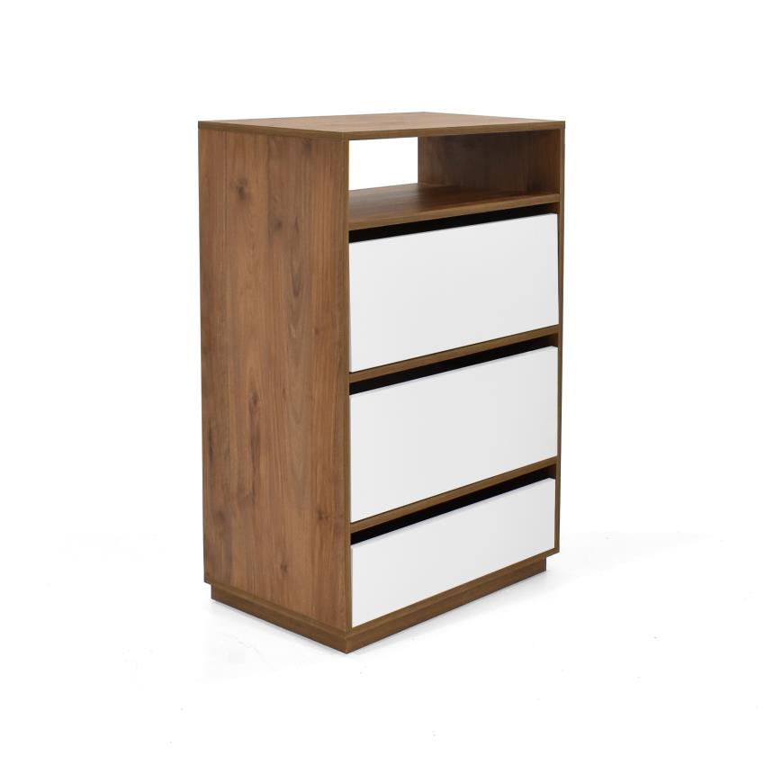 La Cómoda Rambla cuenta con una fuerte estructura en madera MDP de 15 mm enchape en canto flexible. Cuenta con 4 compartimentos: 1 zapatero inferior con puerta batiente 2 cajones con corredera full extensión sin manijas y 1 espacio abierto en la parte superior.