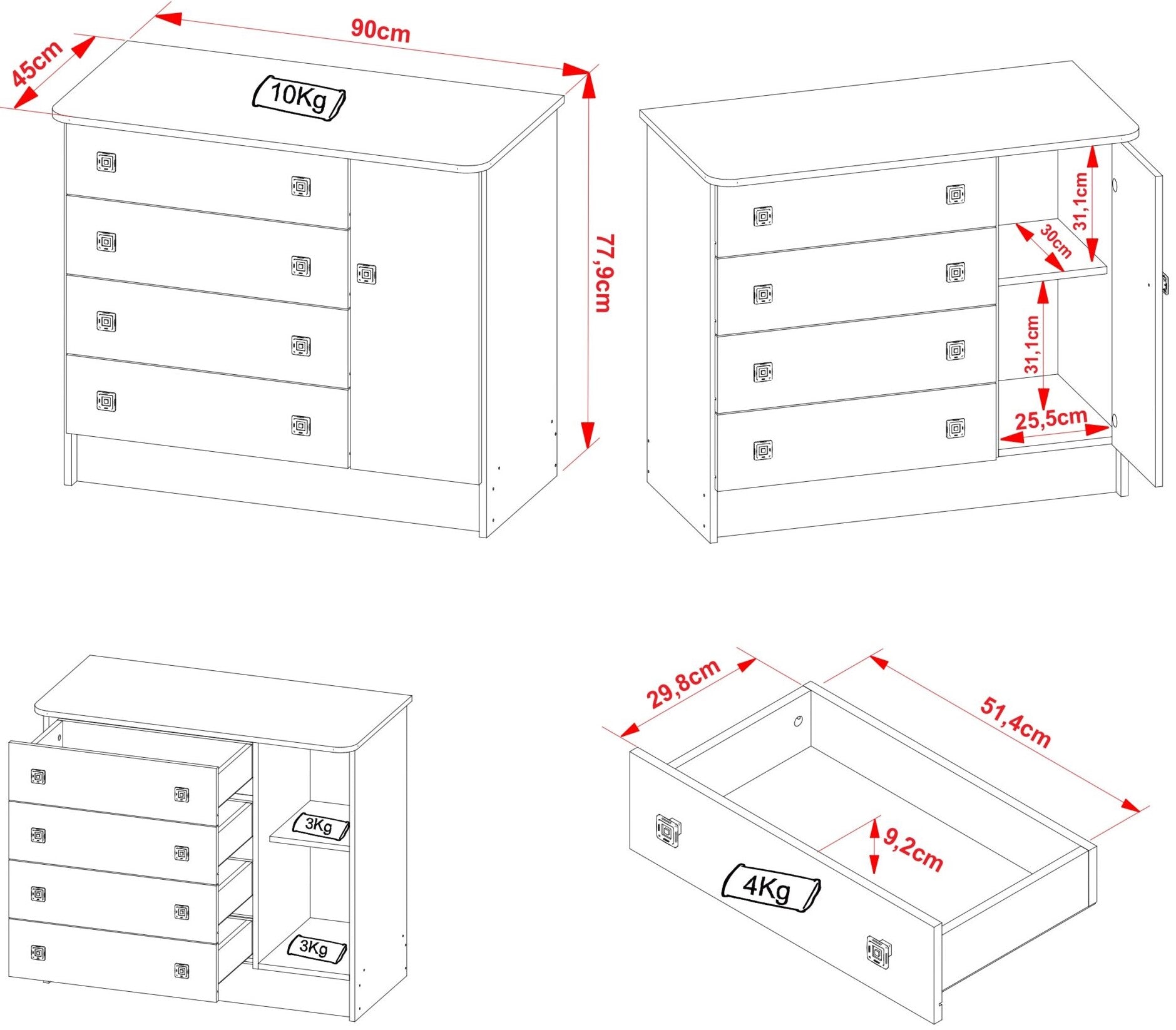 Peso recomendado 10 kg en la parte superior, 4kg en cada cajón y 3kg en compartimiento interno.