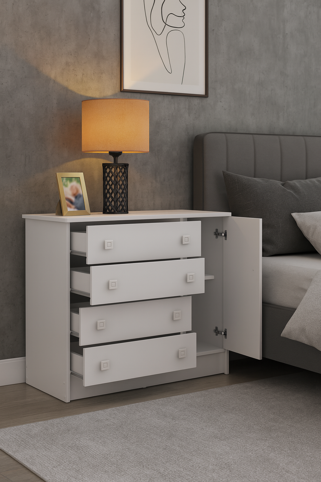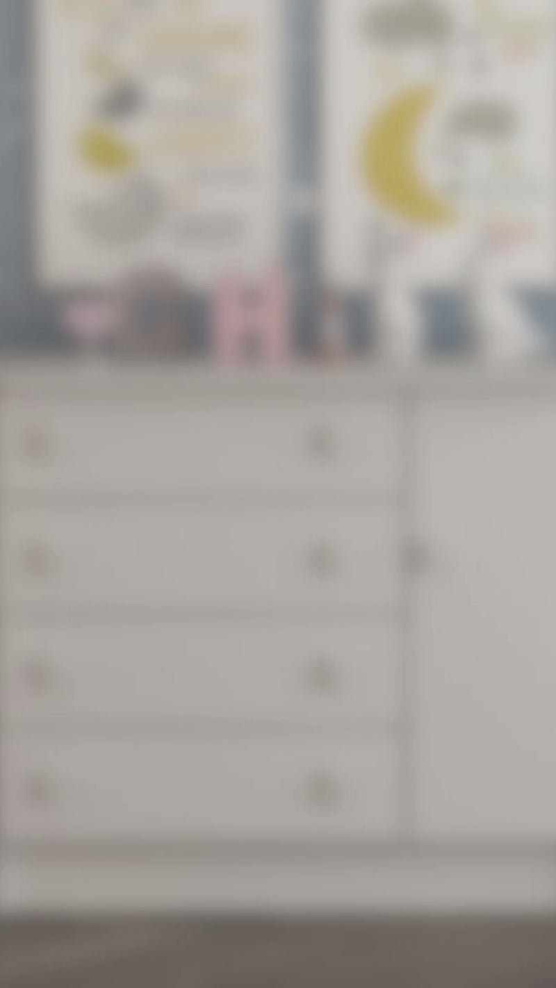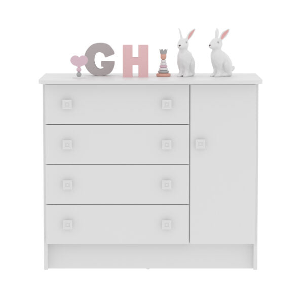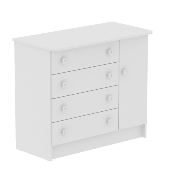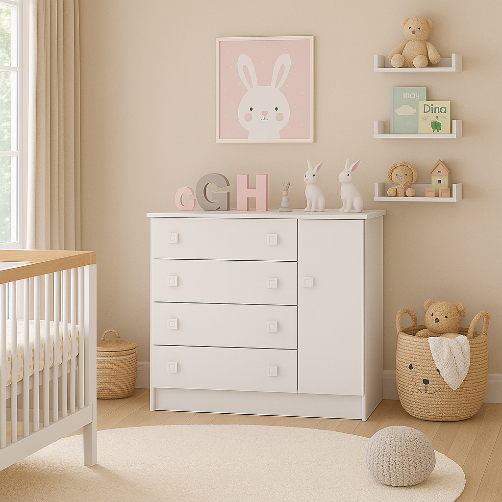 La Cómoda San Pablo combina estilo y funcionalidad para adaptarse a distintos espacios del hogar como habitaciones infantiles. Su diseño cuenta con cuatro cajones amplios y una puerta con compartimiento interno, perfectos para almacenar ropa, accesorios, documentos o elementos decorativos, manteniendo el orden sin sacrificar la estética.