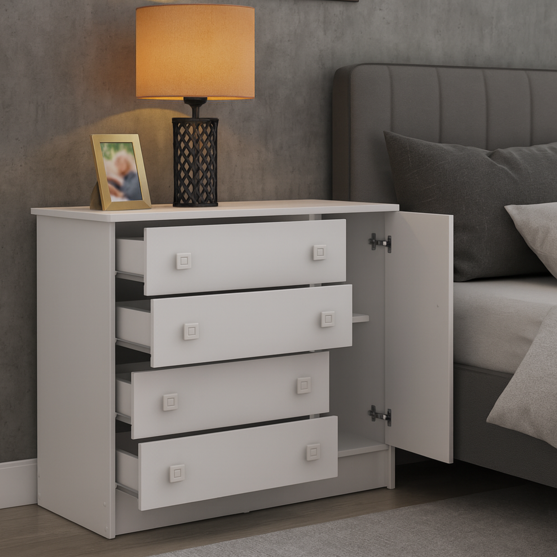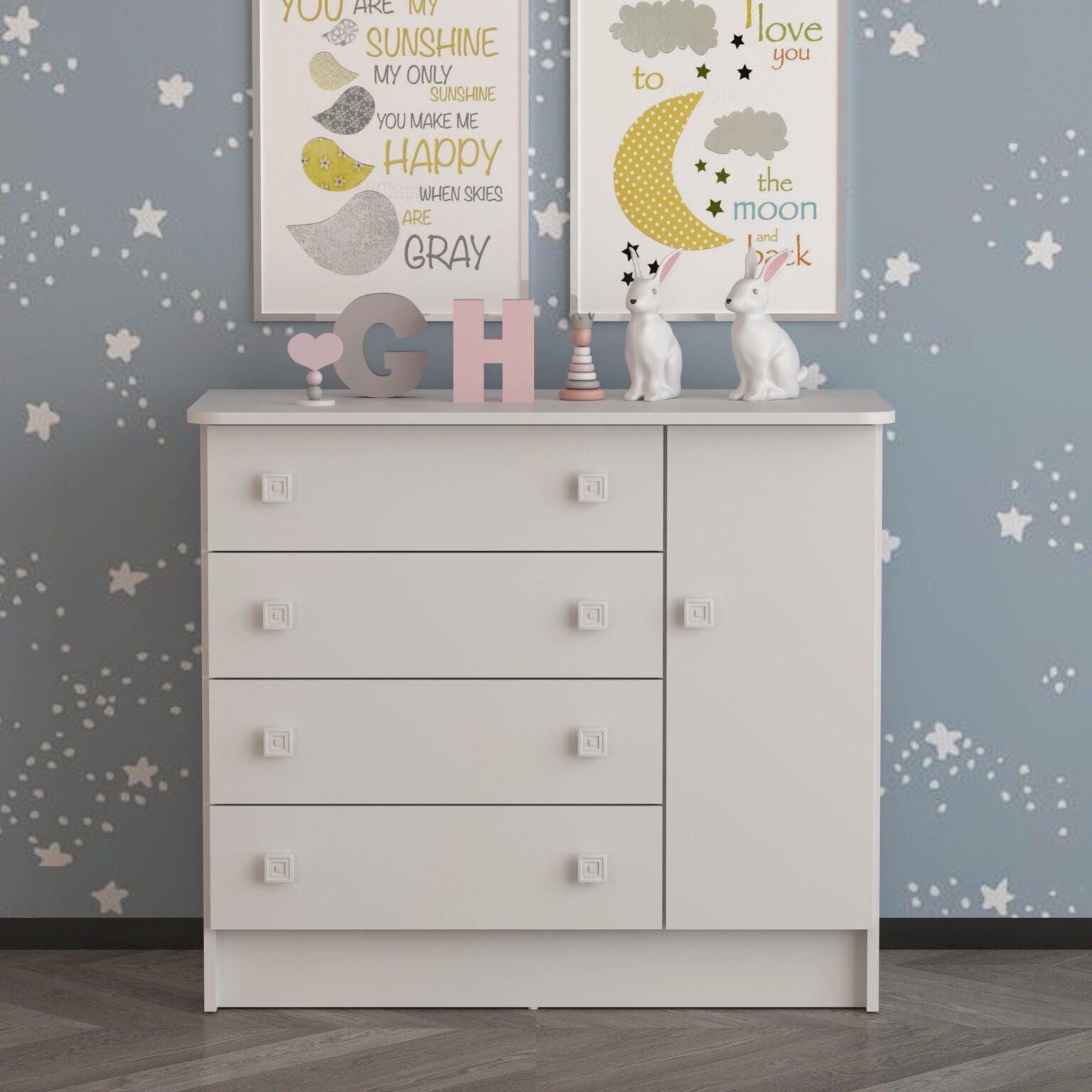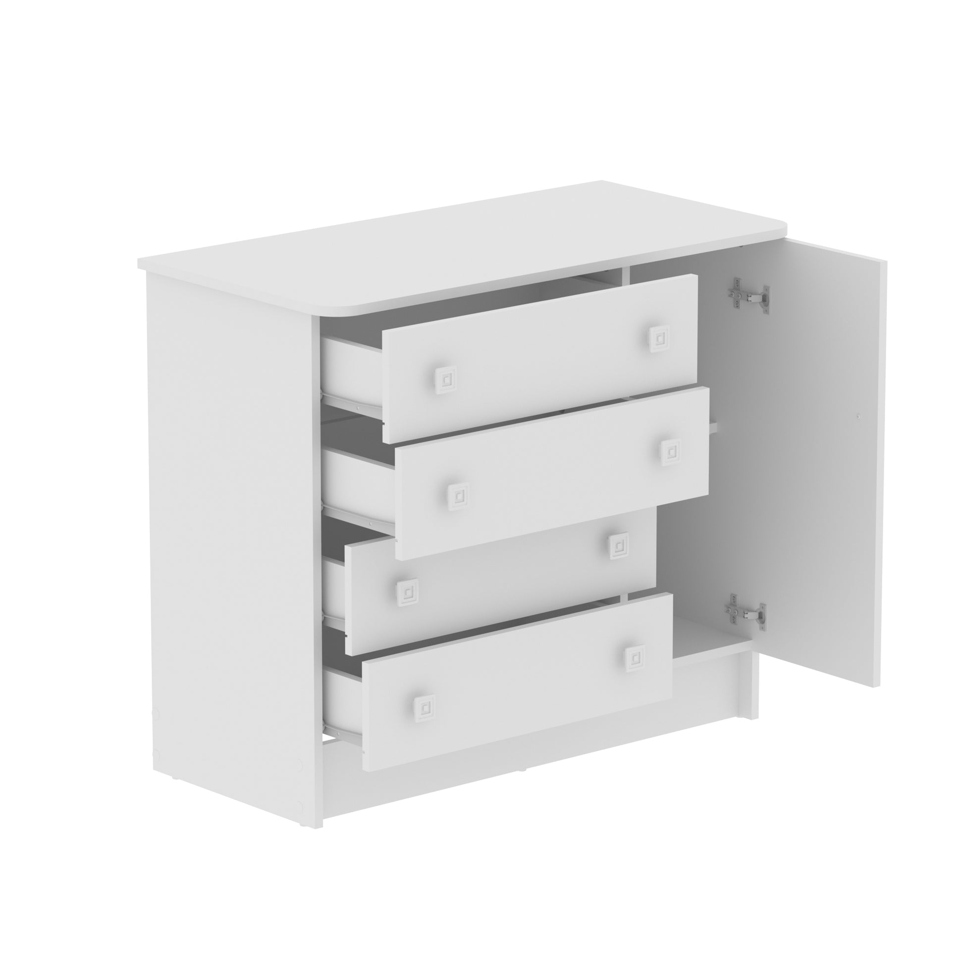 La Cómoda San Pablo combina estilo y funcionalidad para adaptarse a distintos espacios del hogar como habitaciones infantiles. Su diseño cuenta con cuatro cajones amplios y una puerta con compartimiento interno, perfectos para almacenar ropa, accesorios, documentos o elementos decorativos, manteniendo el orden sin sacrificar la estética.