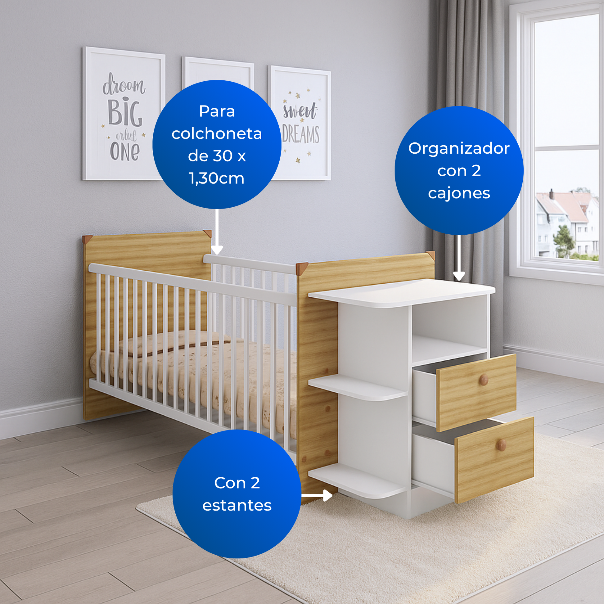 La comodidad y el orden se encuentran en esta cuna multifuncional, diseñada para acompañar cada etapa del crecimiento de tu bebé. Fabricada en MDP de alta densidad, garantiza resistencia, estabilidad y un acabado suave que aporta calidez al ambiente infantil.