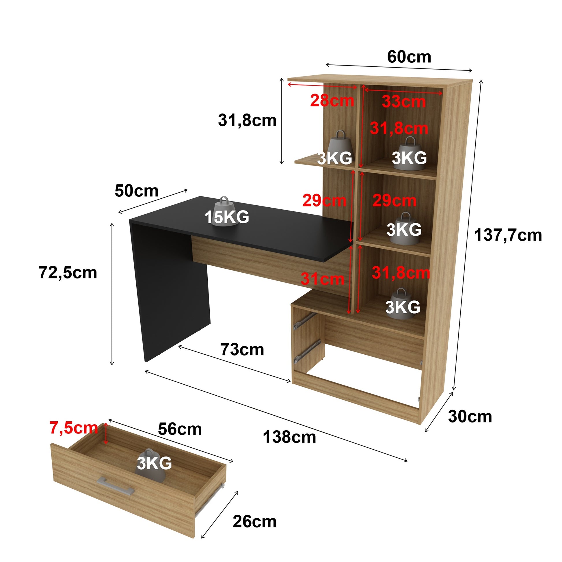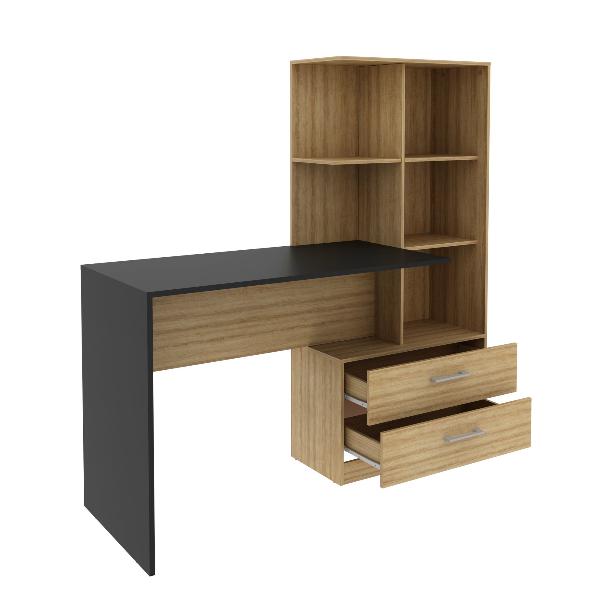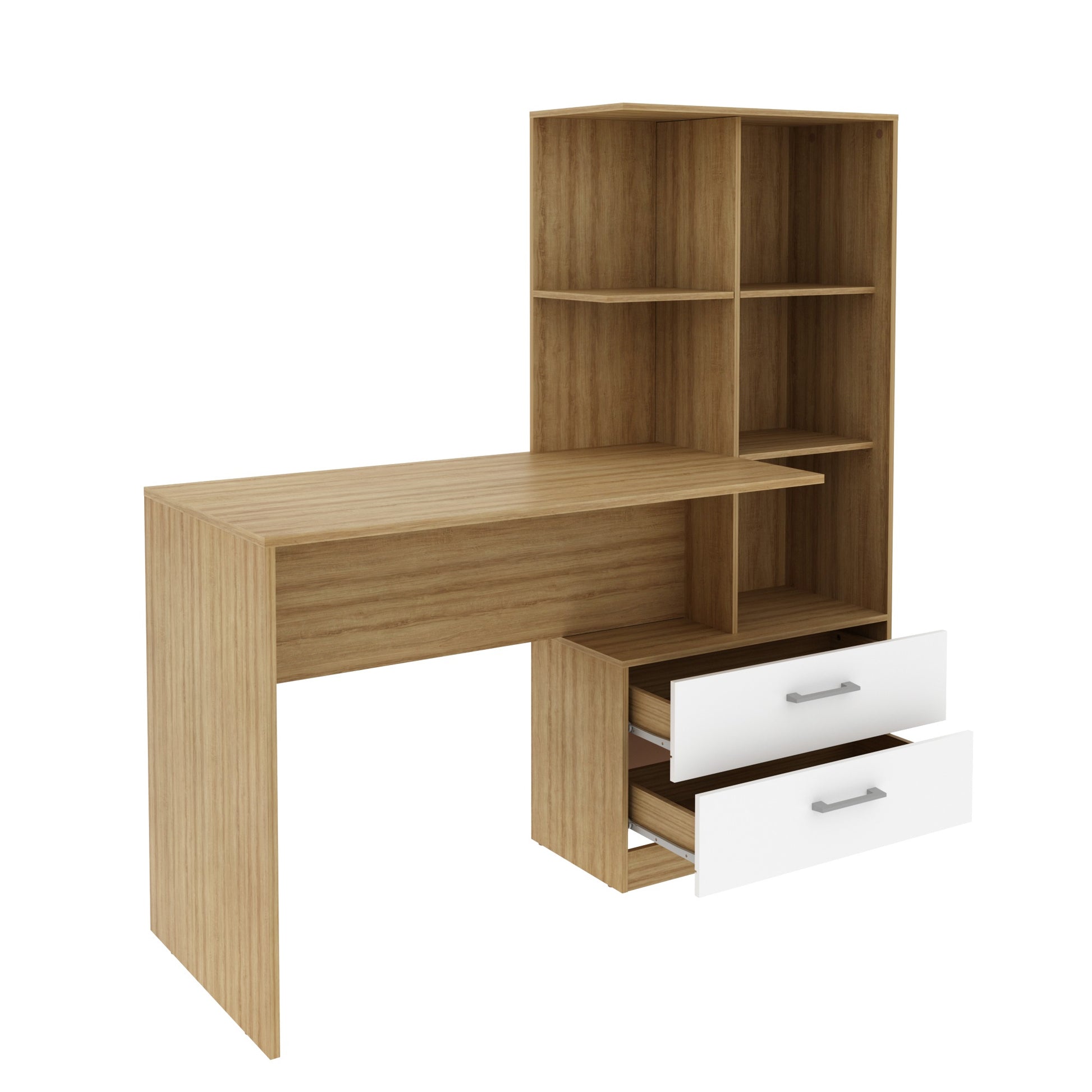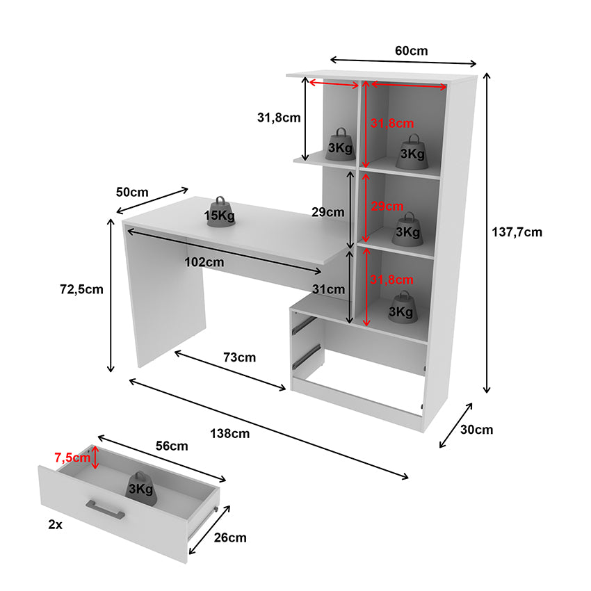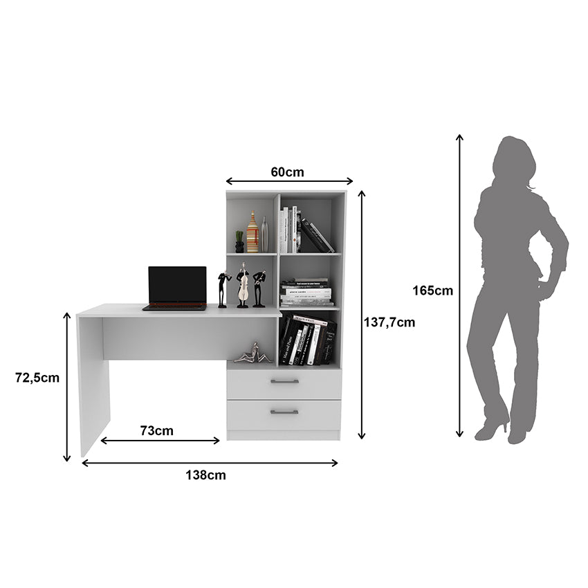 Fabricado en aglomerado de madera MDP de alta resistencia con cubierta superior de 25 mm, este escritorio ofrece durabilidad, estabilidad y estilo moderno, perfecto para oficinas en casa, habitaciones juveniles o zonas de estudio. Sus estantes y cajones facilitan la organización de libros, documentos, accesorios y elementos decorativos.