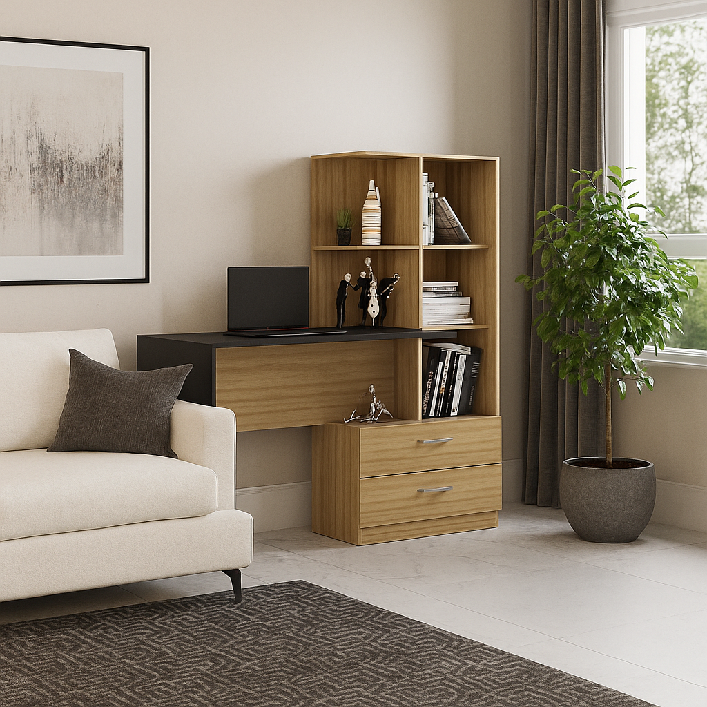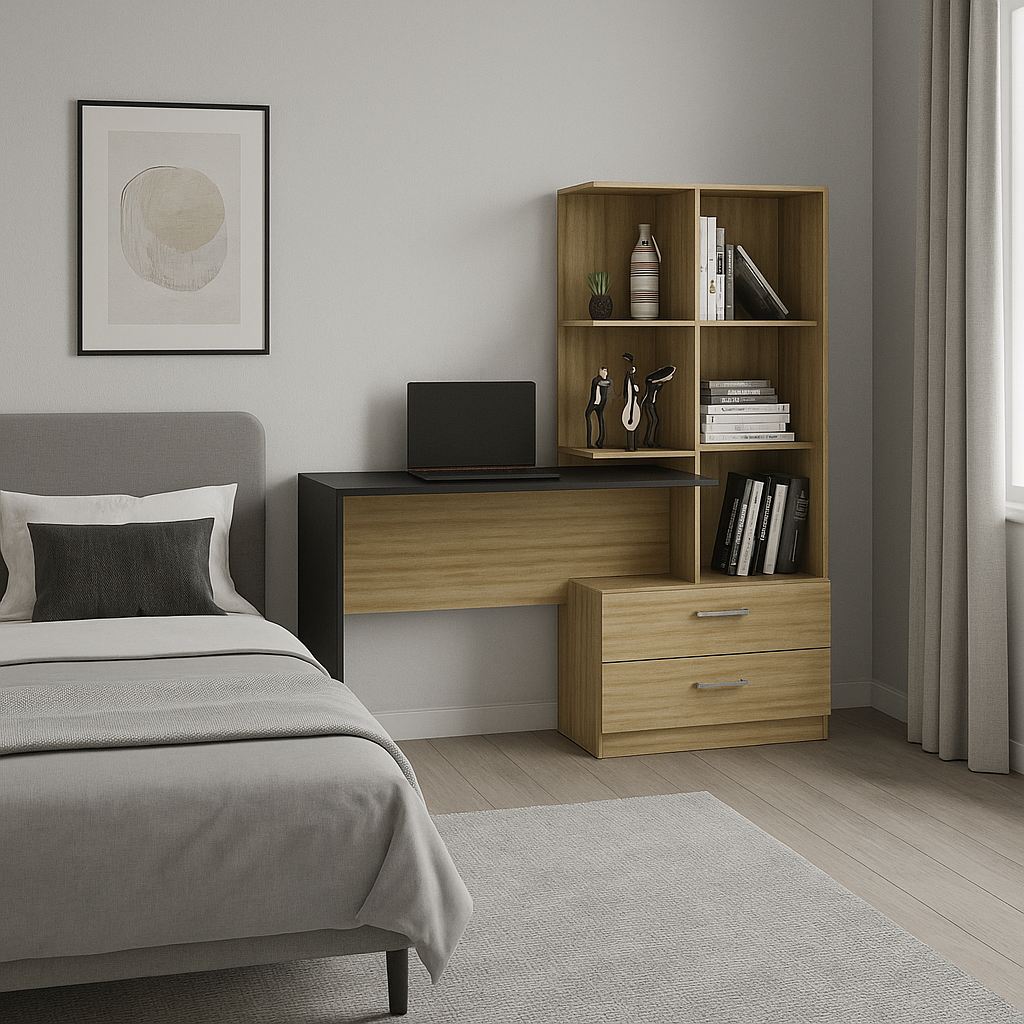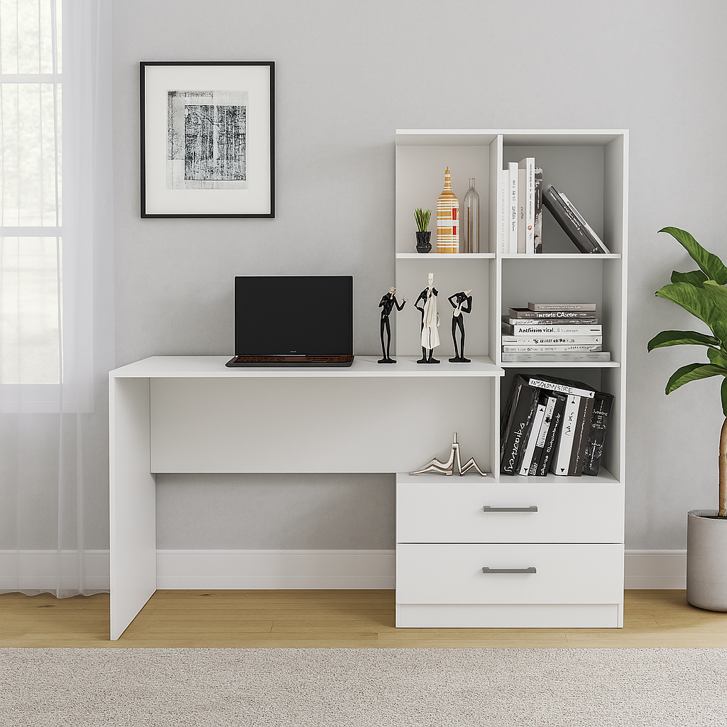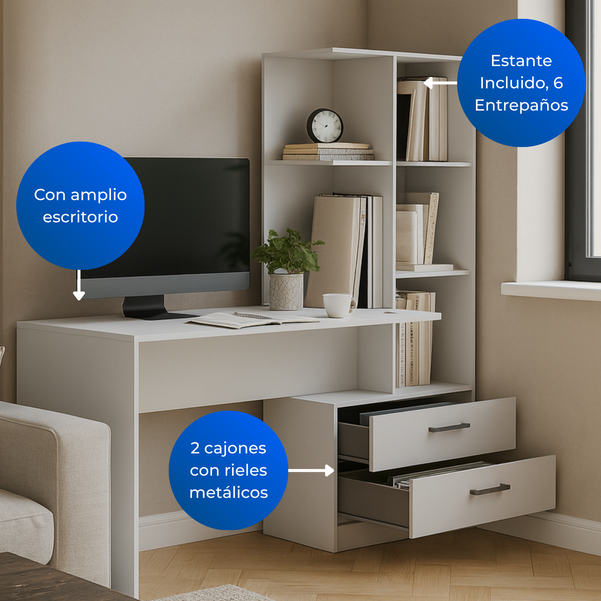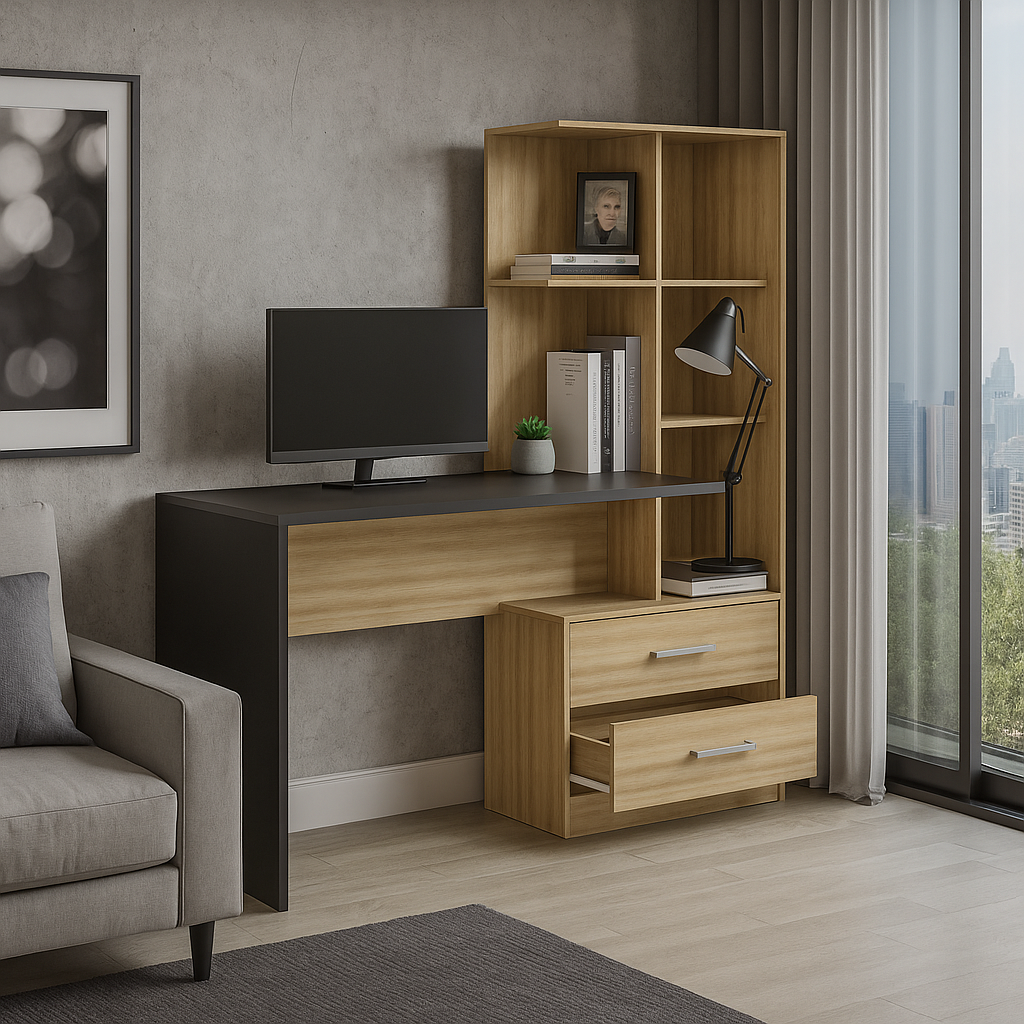 El Escritorio con Biblioteca Poli es la opción ideal para quienes buscan optimizar, decorar y ambientar su espacio de trabajo o estudio. Gracias a su diseño innovador y multifuncional, este mueble combina en una sola pieza un escritorio amplio y una biblioteca con estantes, lo que permite mantener todo en orden mientras aprovechas mejor el espacio disponible.