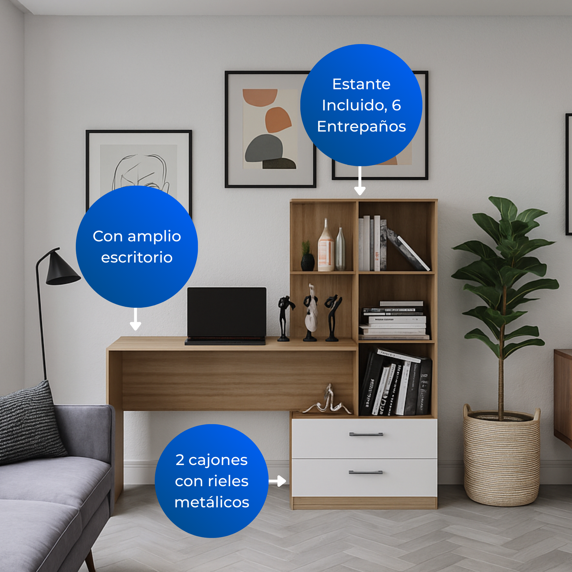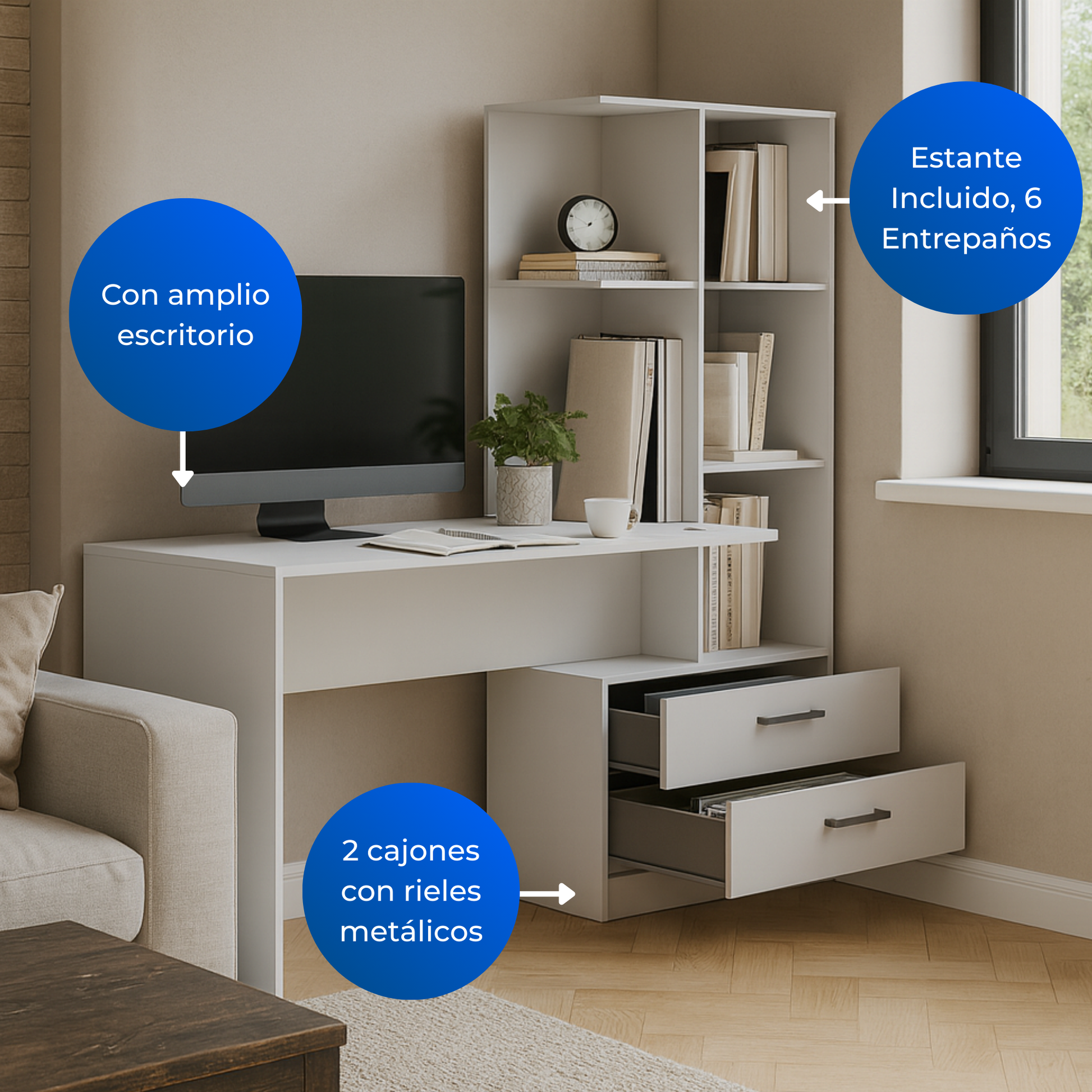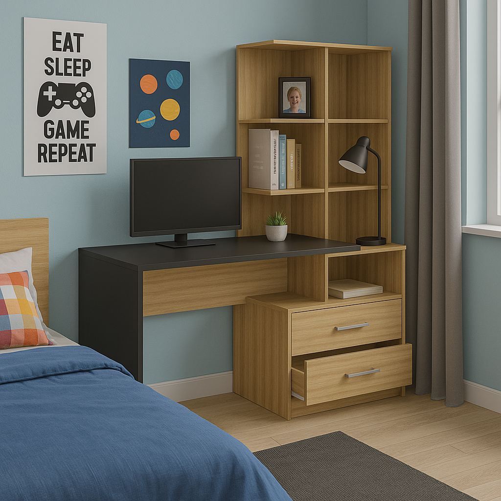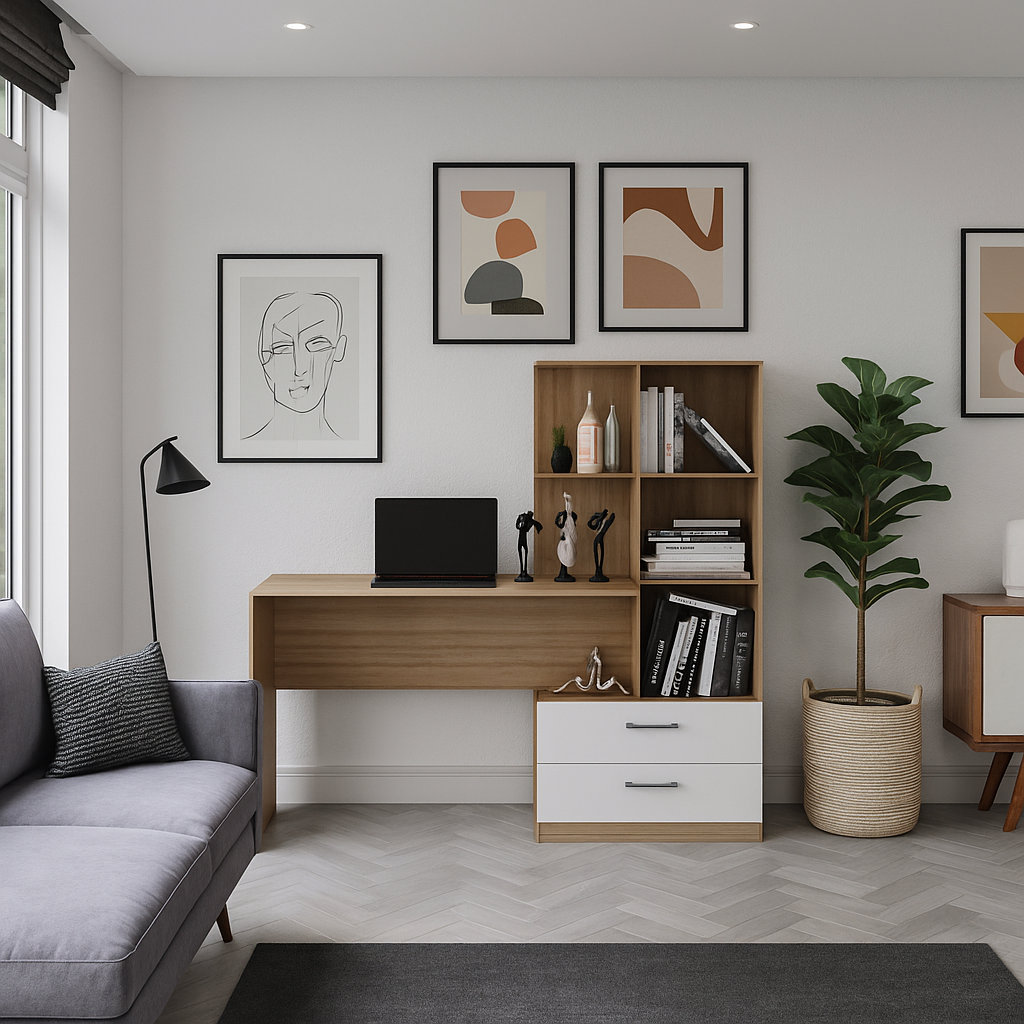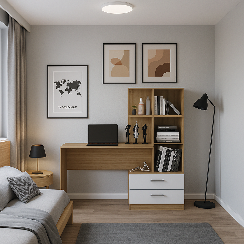 El Escritorio con Biblioteca Poli es la opción ideal para quienes buscan optimizar, decorar y ambientar su espacio de trabajo o estudio. Gracias a su diseño innovador y multifuncional, este mueble combina en una sola pieza un escritorio amplio y una biblioteca con estantes, lo que permite mantener todo en orden mientras aprovechas mejor el espacio disponible.