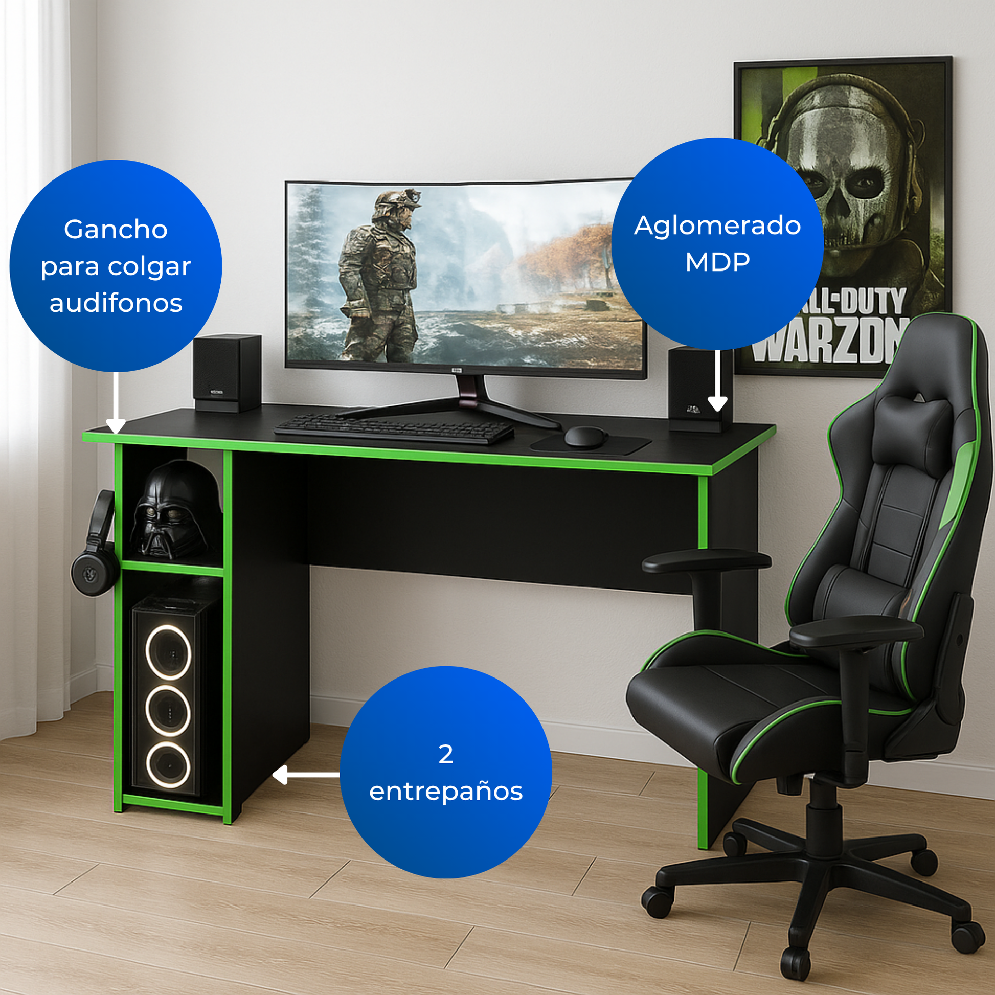 Su superficie ergonómica crea el entorno perfecto para largas sesiones frente a la pantalla, mientras su gancho lateral para audífonos y el espacio destinado a accesorios de sonido elevan la experiencia gamer a otro nivel.