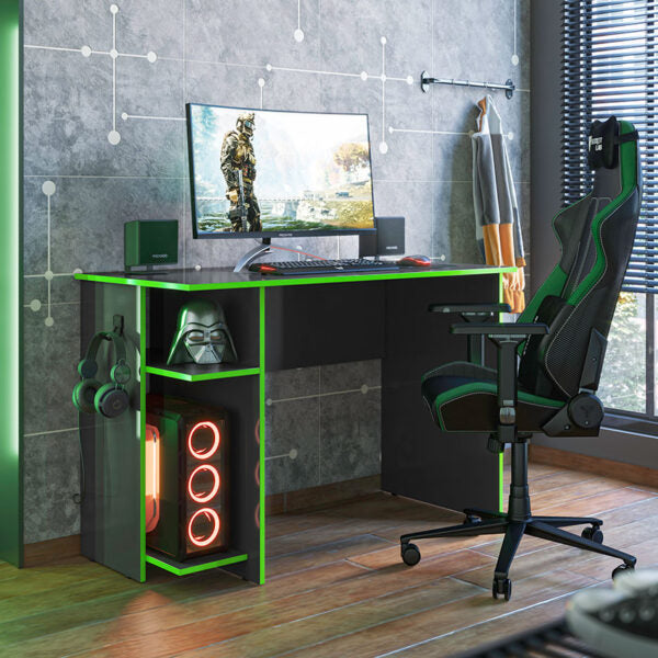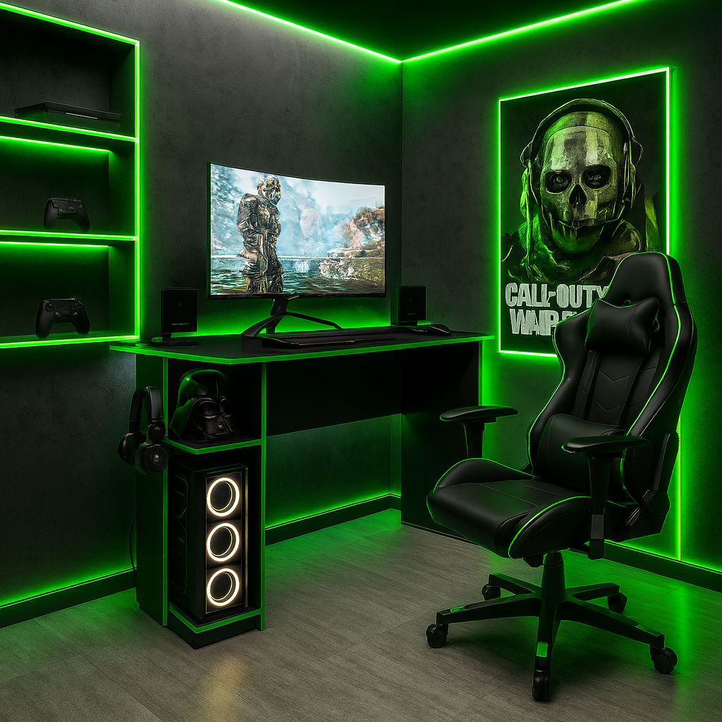 El Escritorio Gamer Lyon ha sido diseñado para los que entienden que cada detalle importa. Su estructura combina funcionalidad y estilo contemporáneo, ofreciendo dos amplios compartimientos para mantener el espacio siempre organizado y listo para la acción.