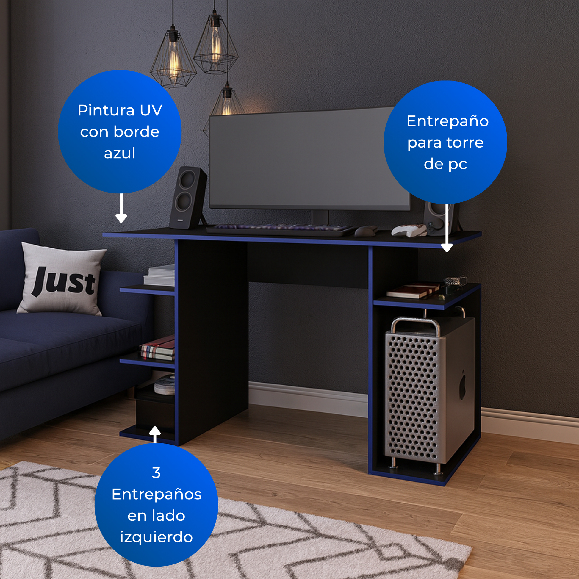 El Escritorio Gamer Osaka es perfecto para quienes buscan un mueble práctico, compacto y con estilo moderno. Su diseño exclusivo en colores negro y azul lo hace ideal para gamers, jóvenes estudiantes o espacios de trabajo con personalidad. Incorpora cuatro compartimientos abiertos que facilitan el orden de periféricos, consolas, libros o elementos decorativos.