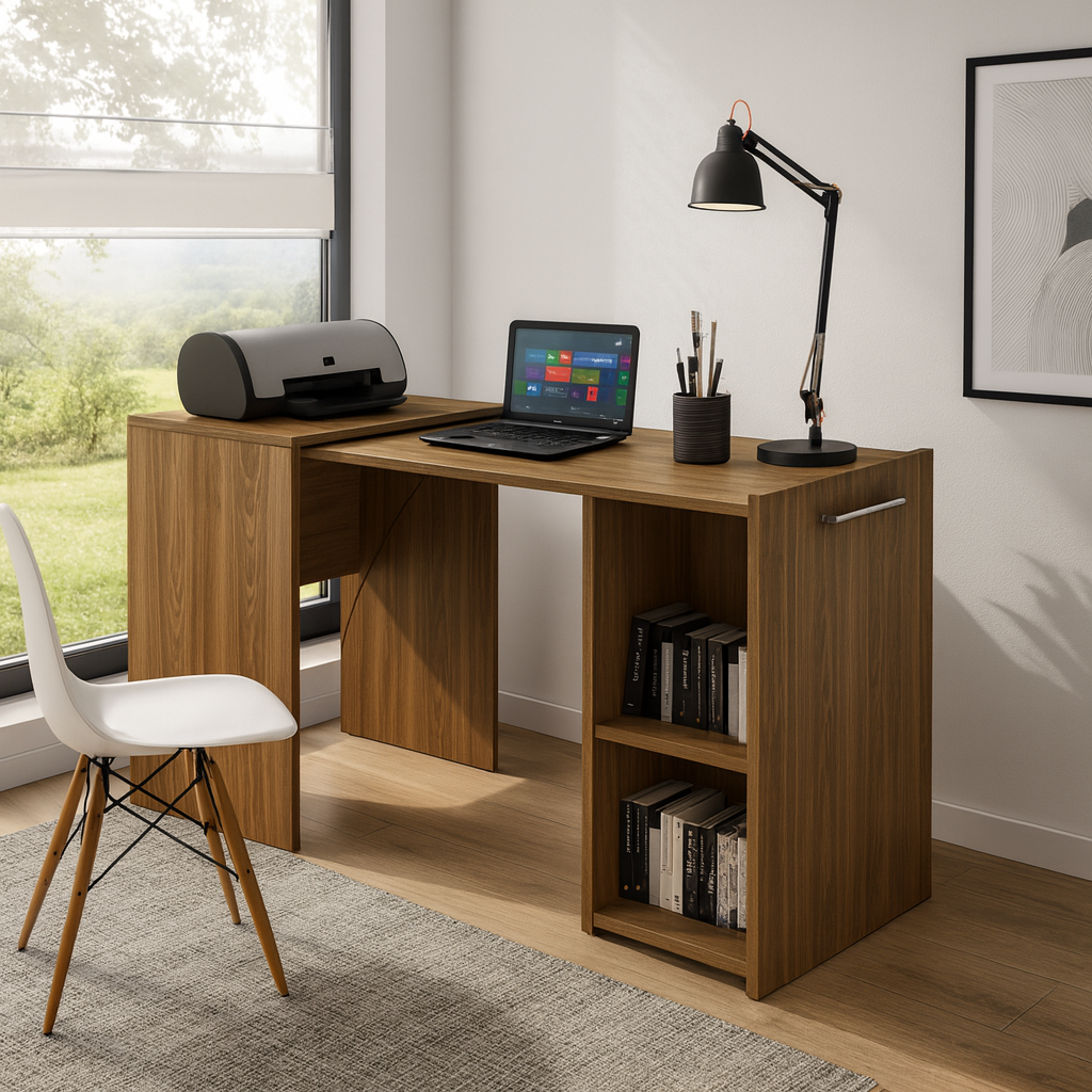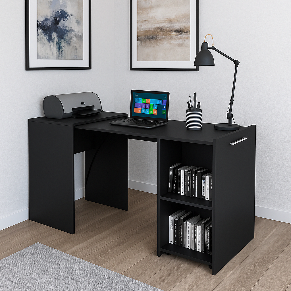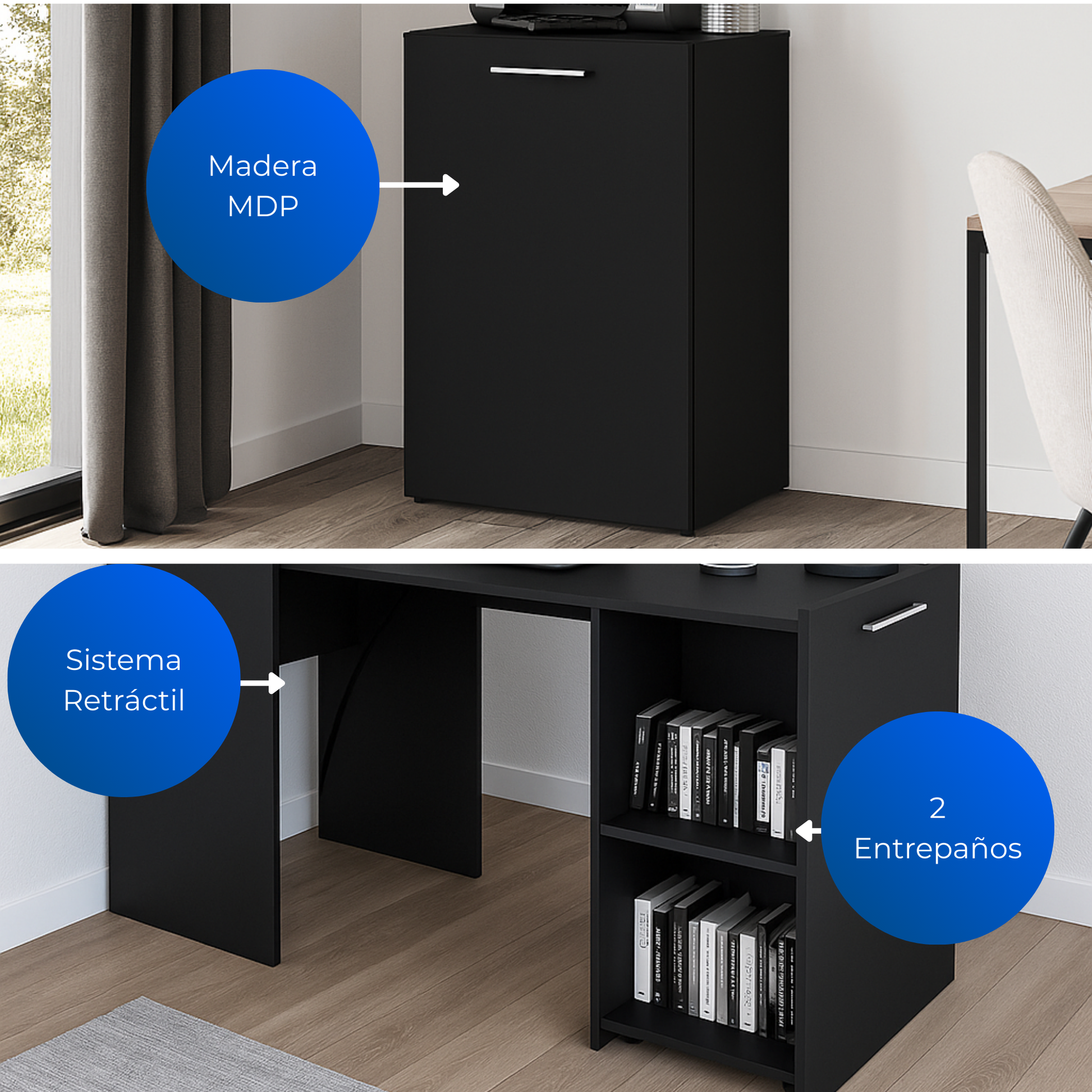El Escritorio Multifuncional Cádiz ofrece practicidad y diseño en un solo mueble. Su sistema retráctil permite guardar la superficie principal cuando no se utiliza, reduciendo su tamaño y optimizando el espacio disponible. Además, cuenta con dos compartimientos con cierre suave, ideales para almacenar elementos de uso diario manteniendo el orden y la estética del ambiente.