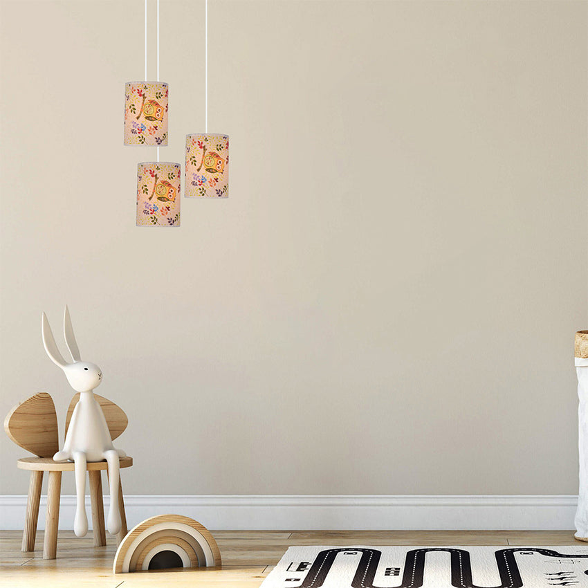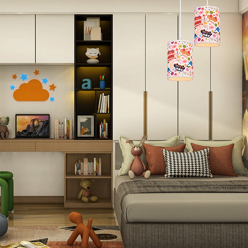Divertido diseño de lámpara infantil perfecta para iluminar y decorar las habitaciones de los más pequeños de casa. Aplicación colgante en forma cilíndrica con un hermosos dibujos en colores regulable en altura tela estampada de alta definición y plastificado por dentro en acetato PVC.