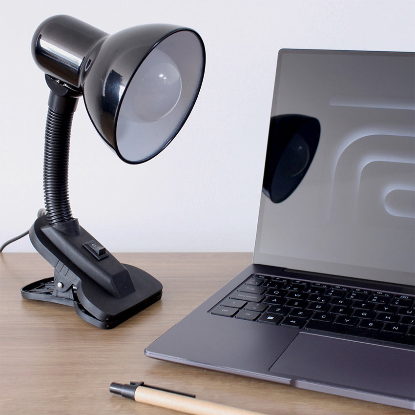 Lámpara de mesa decorativa pequeña en color negro con pinza para ubicarla en donde la necesites. Fuente de alimentación 100-240 V. No incluye bombillo