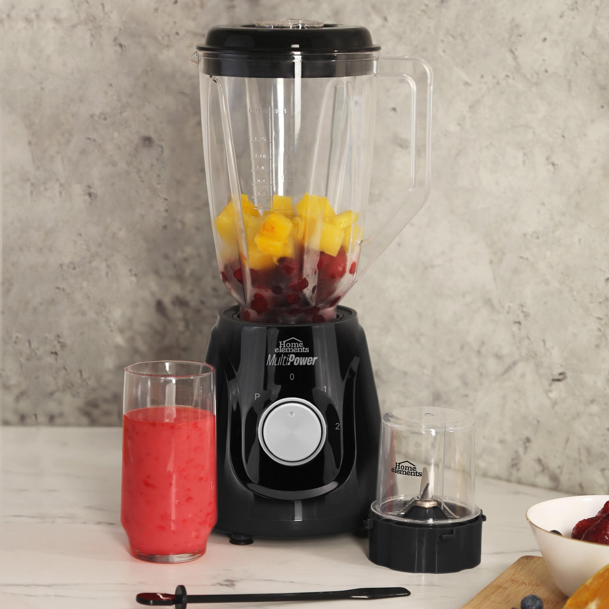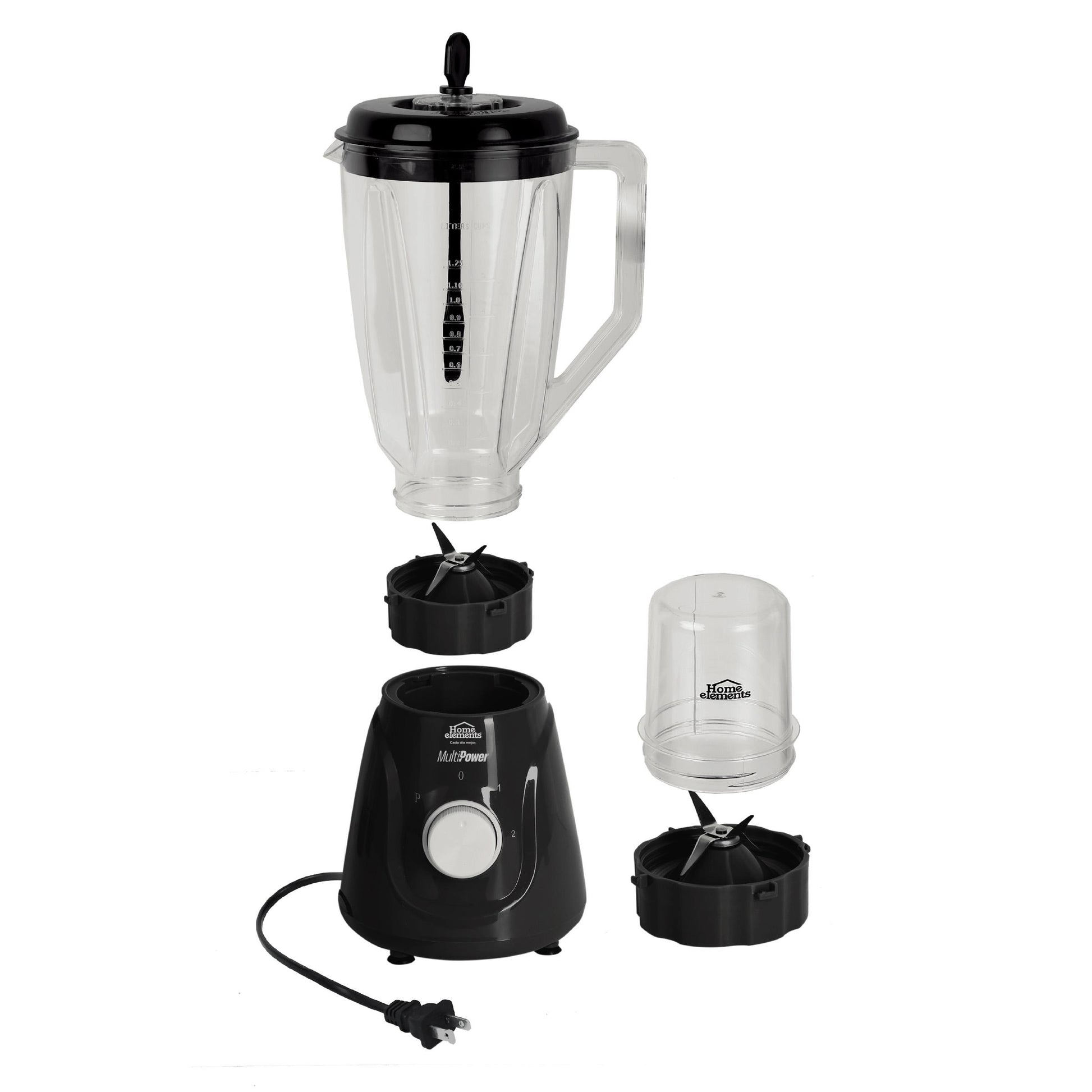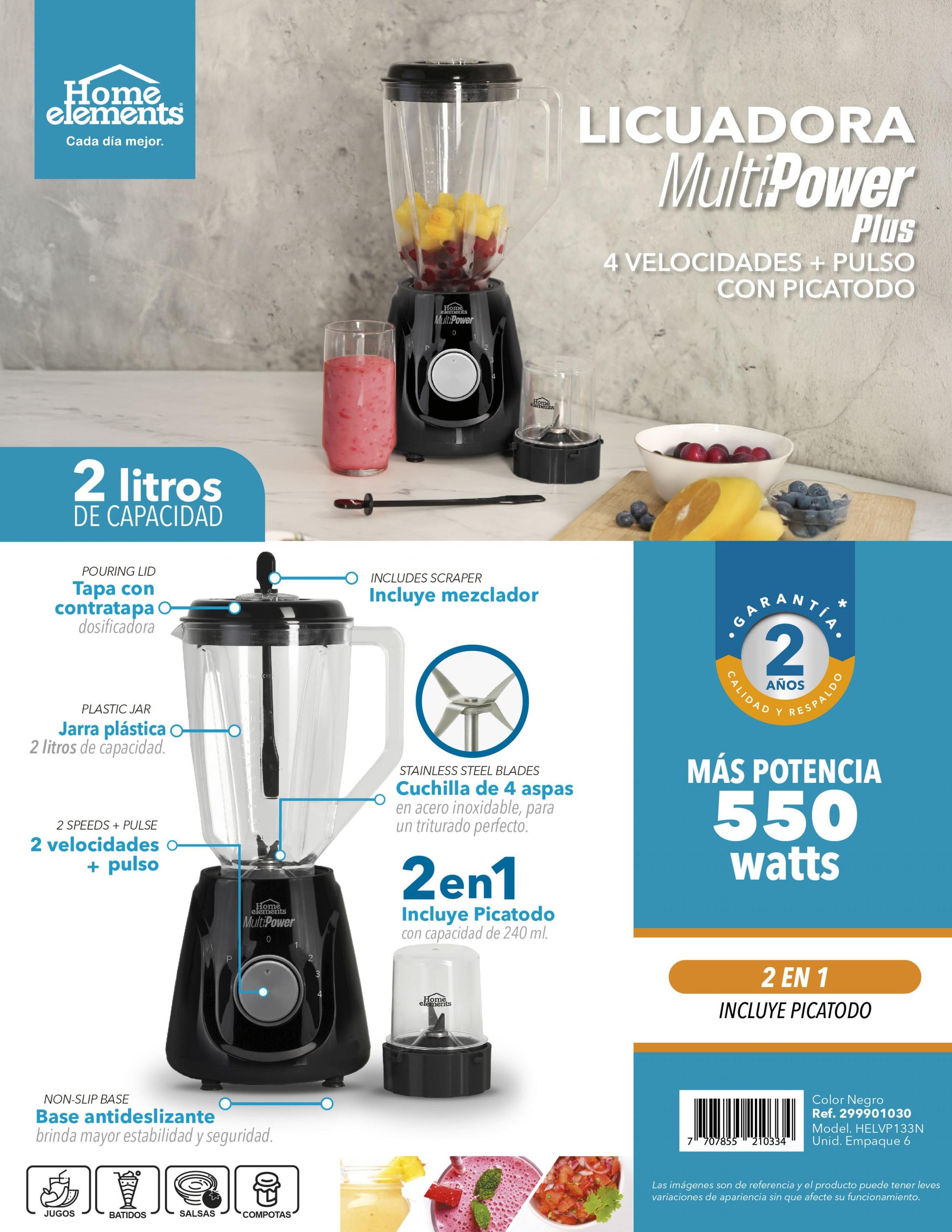 ¡Dale más poder a tus recetas con la Licuadora MultiPower Plus de Home Elements! Diseñada para quienes necesitan rendimiento y versatilidad, esta potente licuadora de 550 watts incluye 4 velocidades + función pulso para adaptarse a todo tipo de preparaciones. Con su jarra plástica de 2 litros, cuchilla de 4 aspas en acero inoxidable y mezclador incorporado, garantiza resultados perfectos. Además, es 2 en 1, ya que viene con un accesorio picatodo de 240 ml, ideal para triturar ingredientes más duros o preparar pequeñas porciones. Su base antideslizante asegura estabilidad, mientras su diseño elegante y compacto se adapta a cualquier cocina. ¡Haz jugos, batidos, salsas o compotas con la potencia y confianza que mereces!, Peso (Kg) 2,51, Alto 38,6, Ancho 18, Largo 17,8