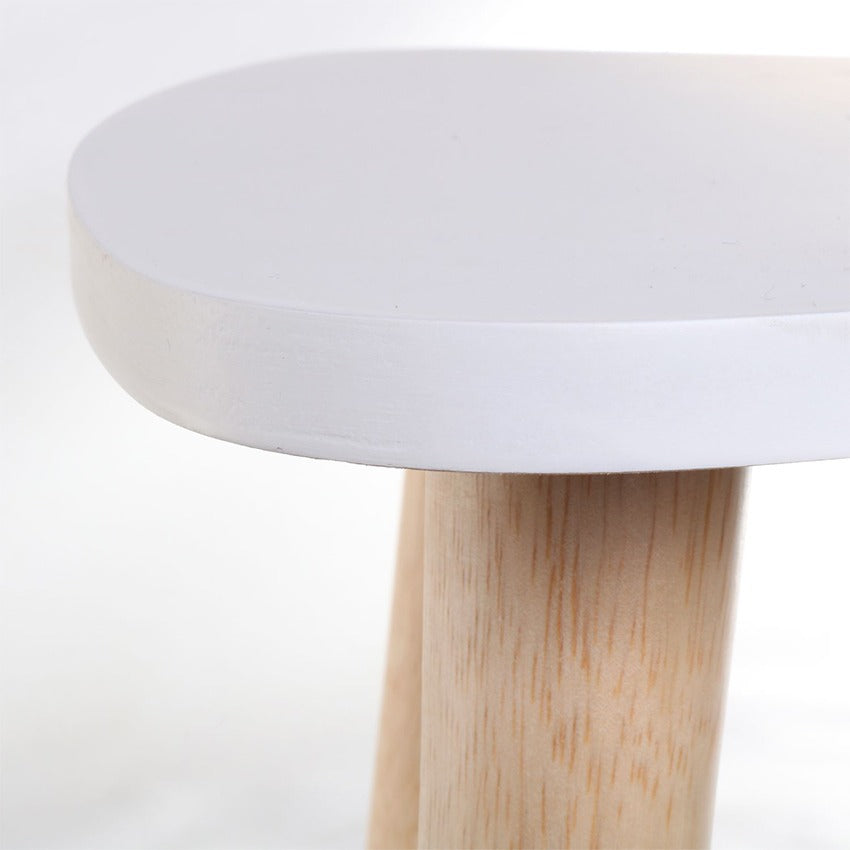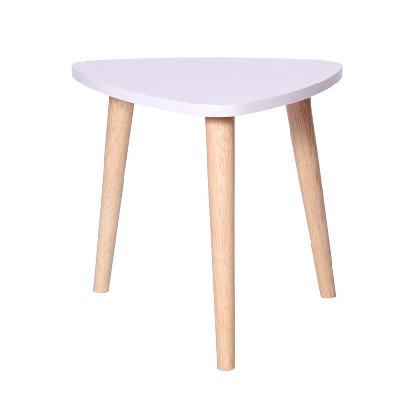Mesa Auxiliar Triangular Blanca. Fabricada en melamina con protección antimicrobiana al 99.9 % y patas torneadas en madera.