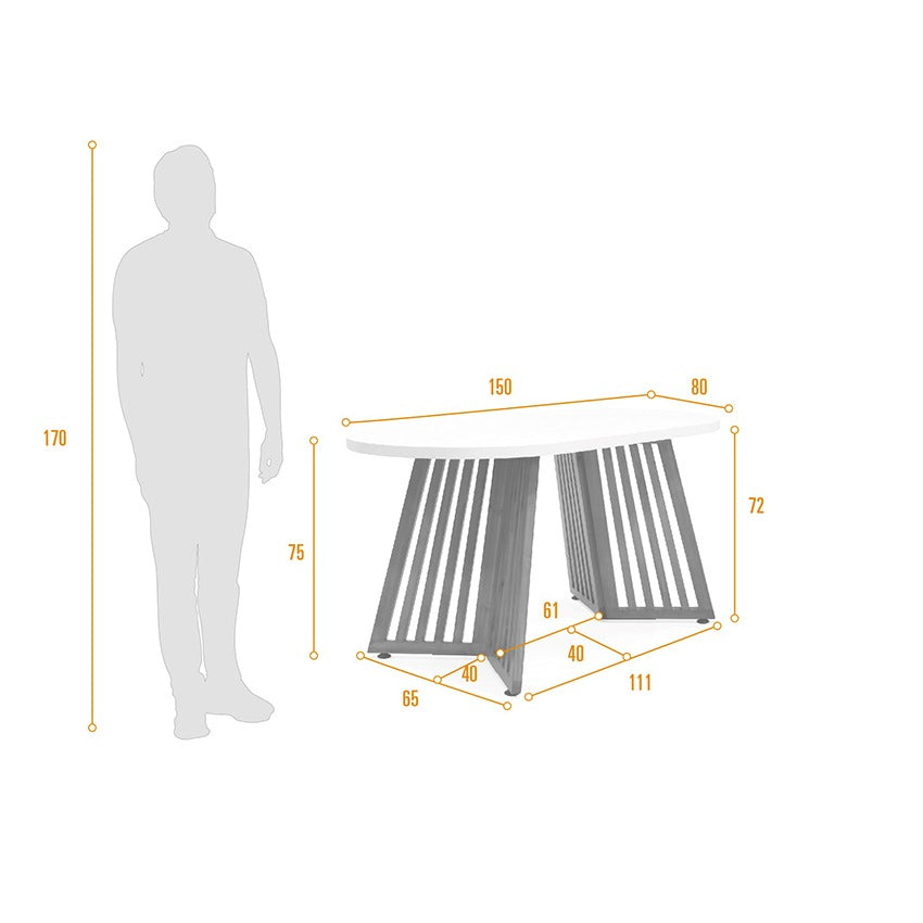 Elegancia y modernidad. Cuenta con una tapa ovalada fabricada en madecor de 15 mm de espesor con reengruese en MDF de 18 mm para mayor resistencia y durabilidad. El acabado del borde es canto flexible. Las patas de la mesa están elaboradas en pino con un estilo de rejilla que le otorga un toque distintivo y moderno. Además cuenta con niveladores en la parte inferior garantizando así una superficie estable y equilibrada.Dimensiones: 150 cm ancho x 80 cm largo x 75 cm alto.Peso del Producto: 35 kg - Peso que soporta: 110 kg.Incluye: 1 Mesa de Comedor.No incluye elementos decorativos.Ensamble: Requiere ajustar el herraje con tornillo bristol y tuerca de uña.El color del mobiliario en la fotografía es una aproximación al color real puede variar por la luz ambiente y la diferencia en la resolución de la pantalla del computador o dispositivo móvil.