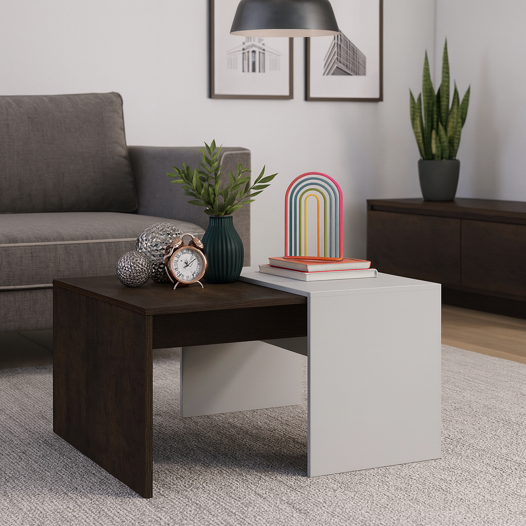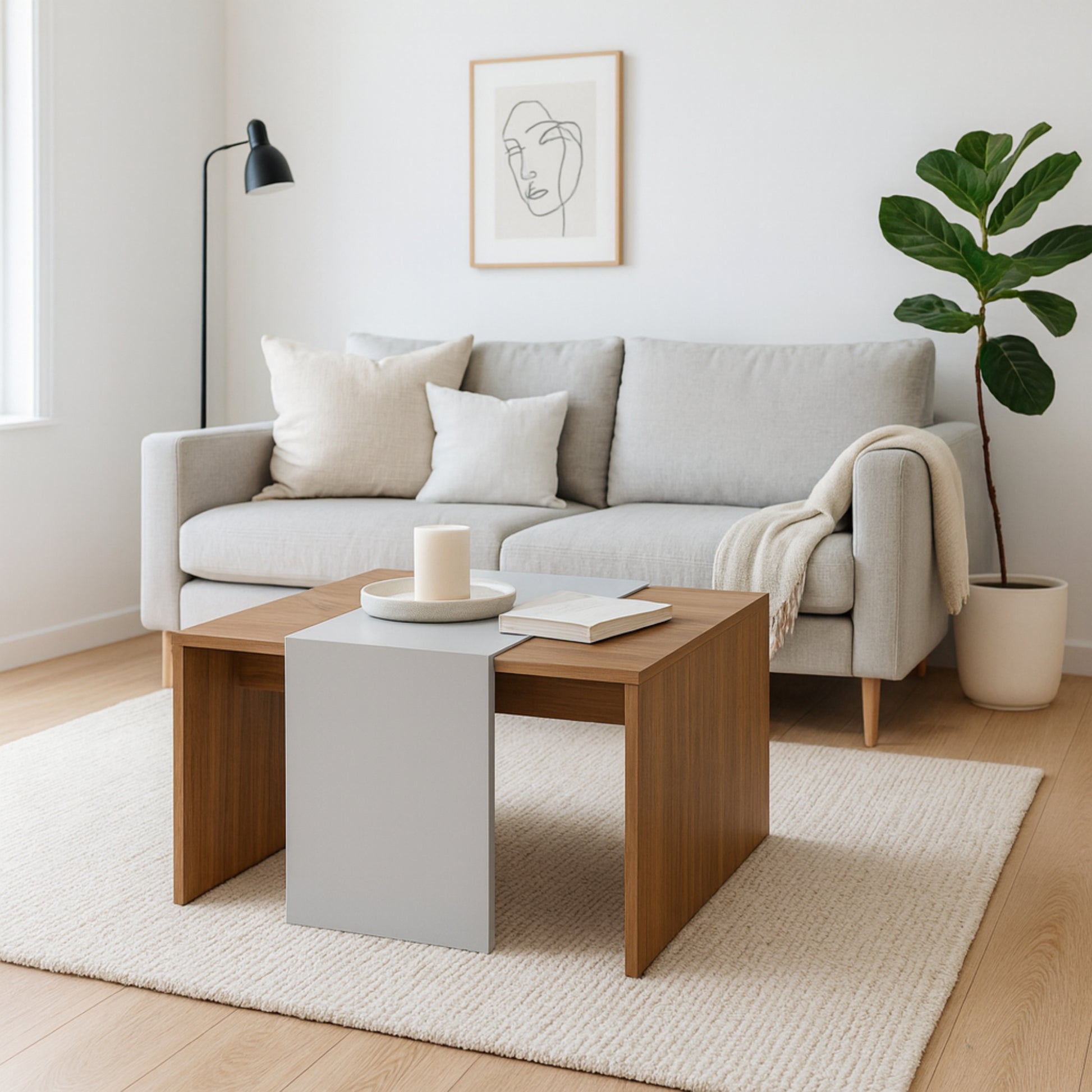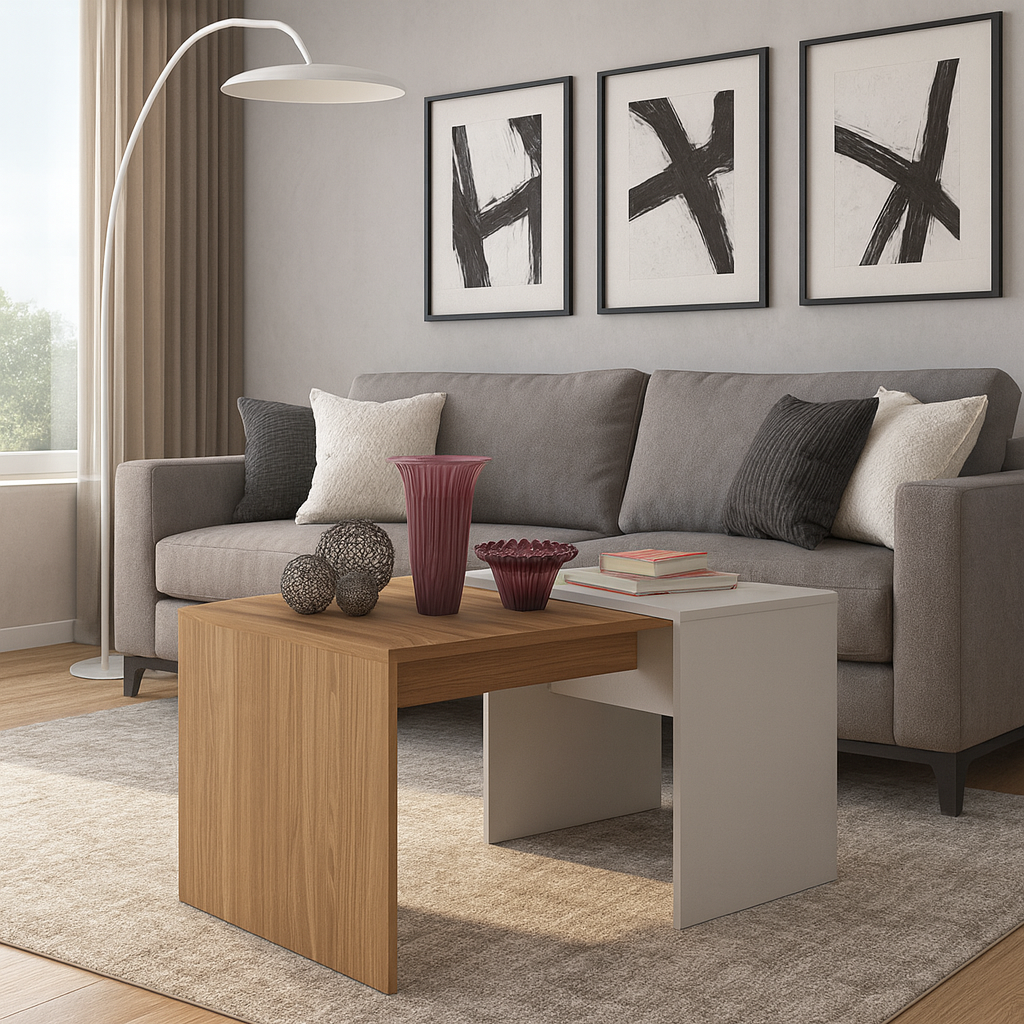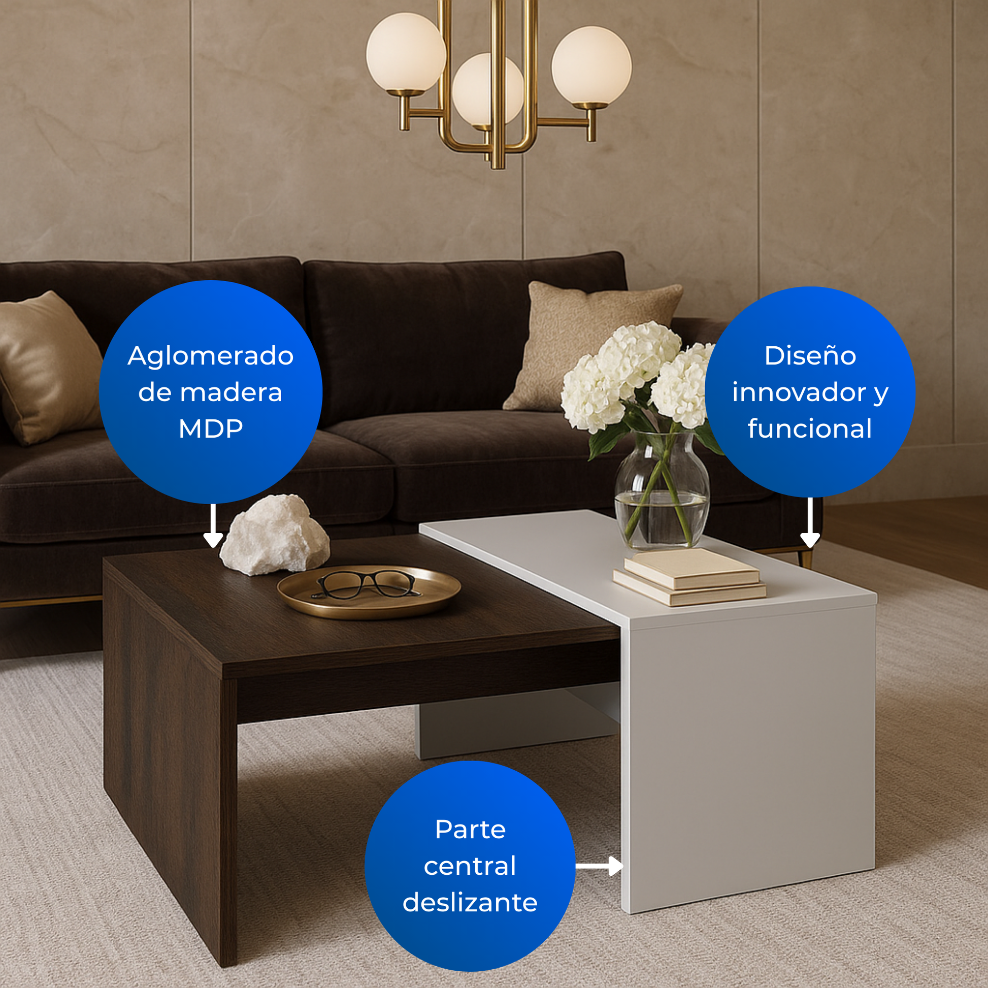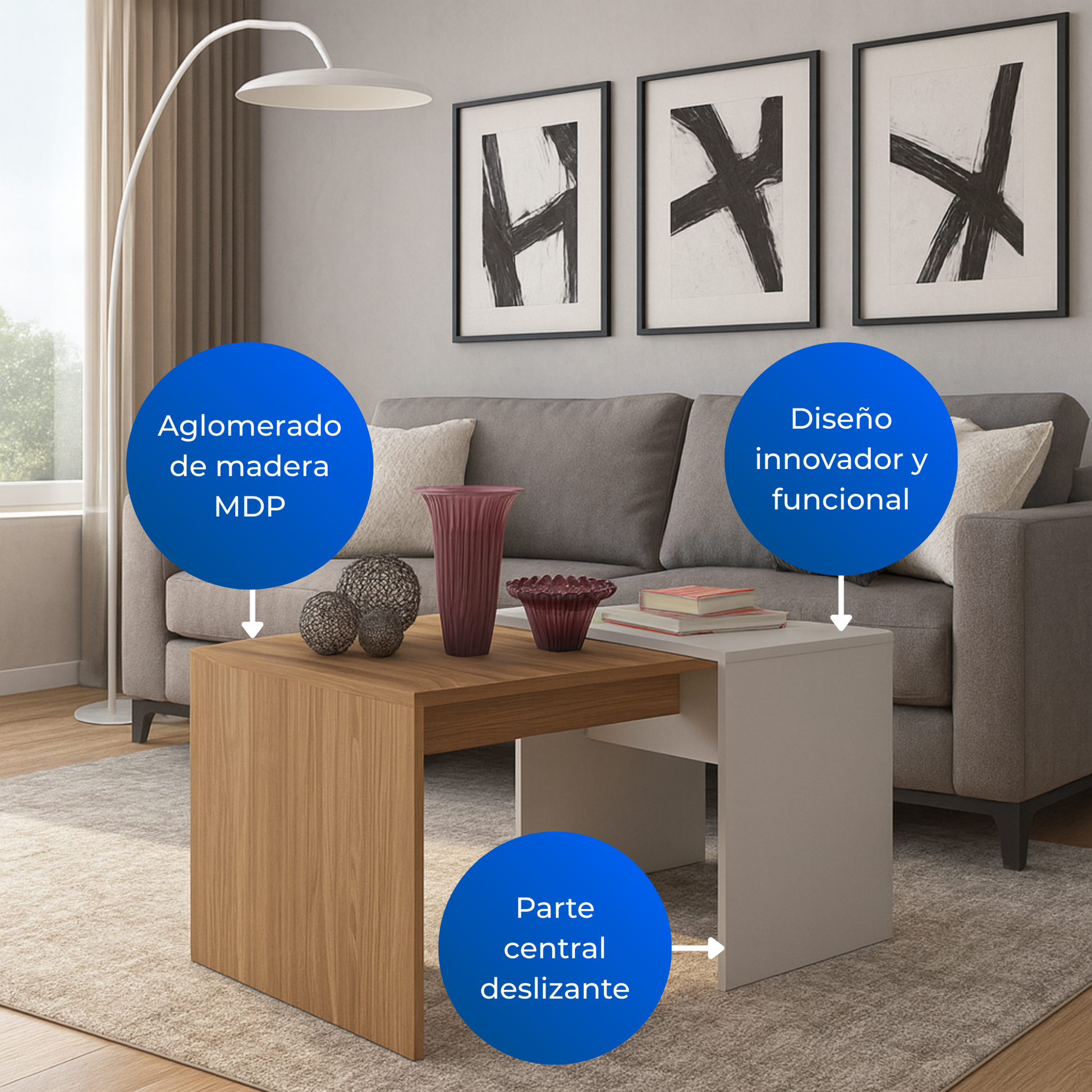 La Mesa de Centro Cobeña destaca por su diseño versátil, con una parte central que se desliza lateralmente para adaptarse a diferentes necesidades y estilos de uso. Es ideal para salas, oficinas y espacios sociales, aportando modernidad y practicidad a la decoración.