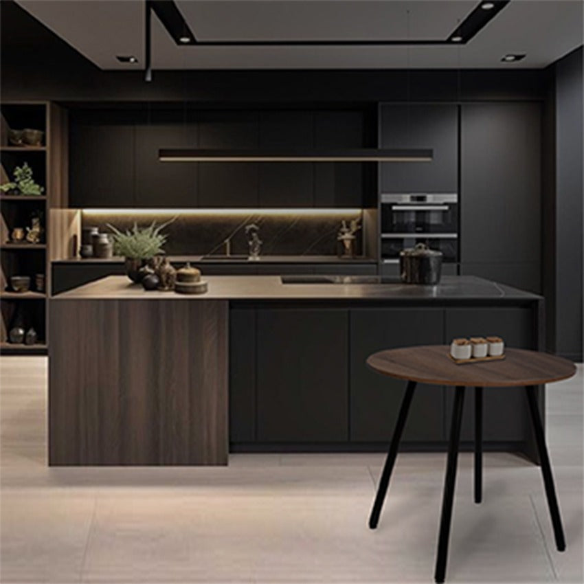 Mesa de Comedor Redondo Amaretto. Fabricado en melamina con protección antimicrobiana al 99.9 % y patas metalicas blancas con niveladores y con pintura electroestatica.