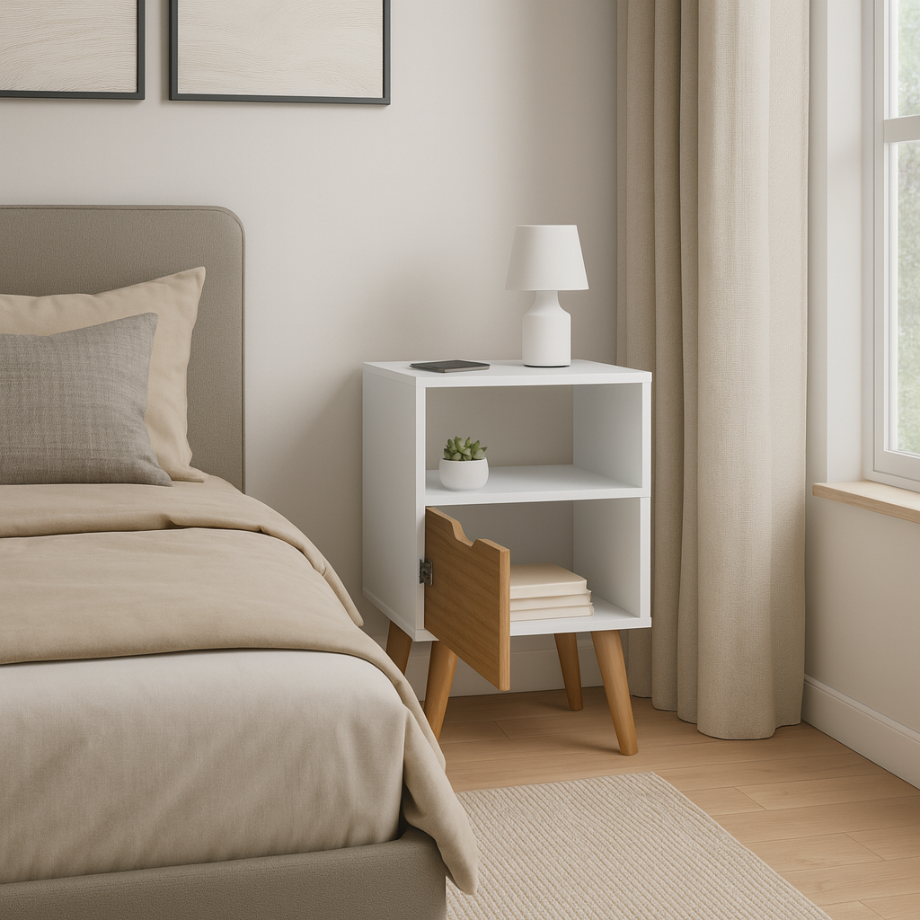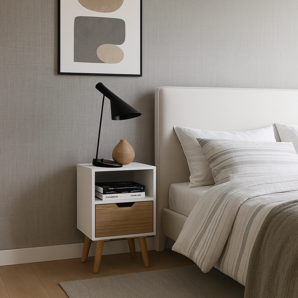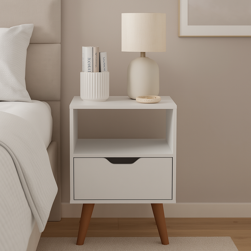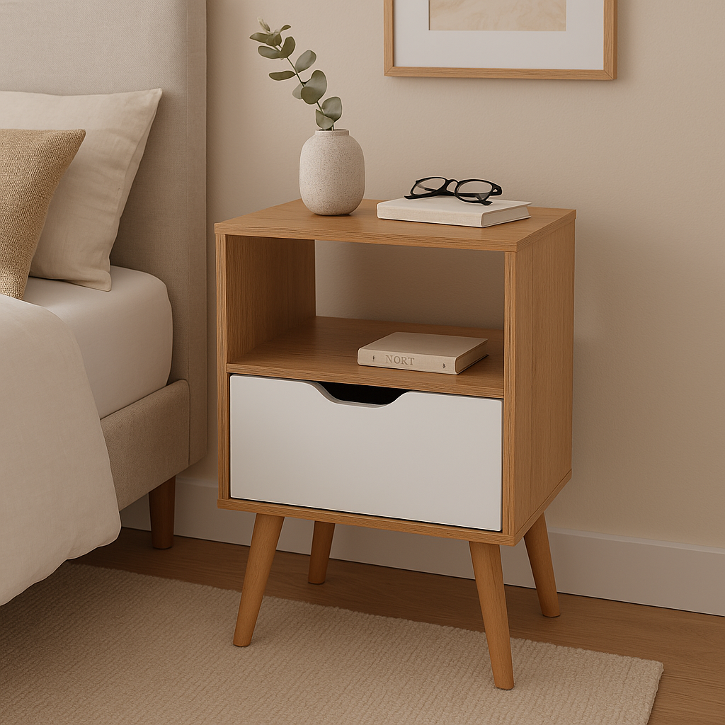 La Mesa de noche Essen es de diseño minimalista, limpio, y sencillo gracias a los cajones y entrepaños que mantendrán la habitación ordenada.