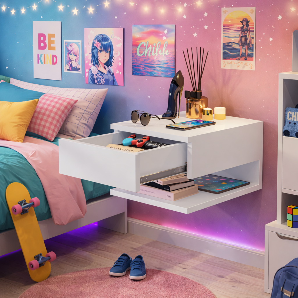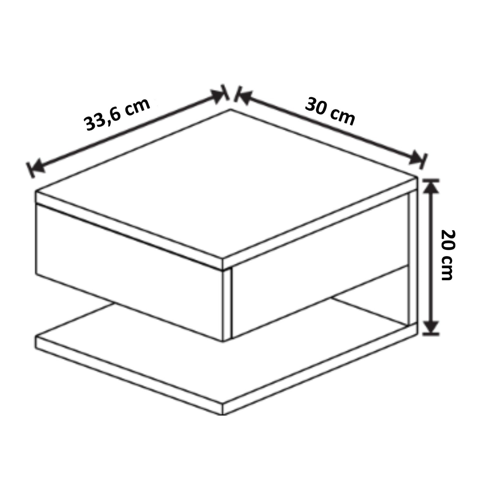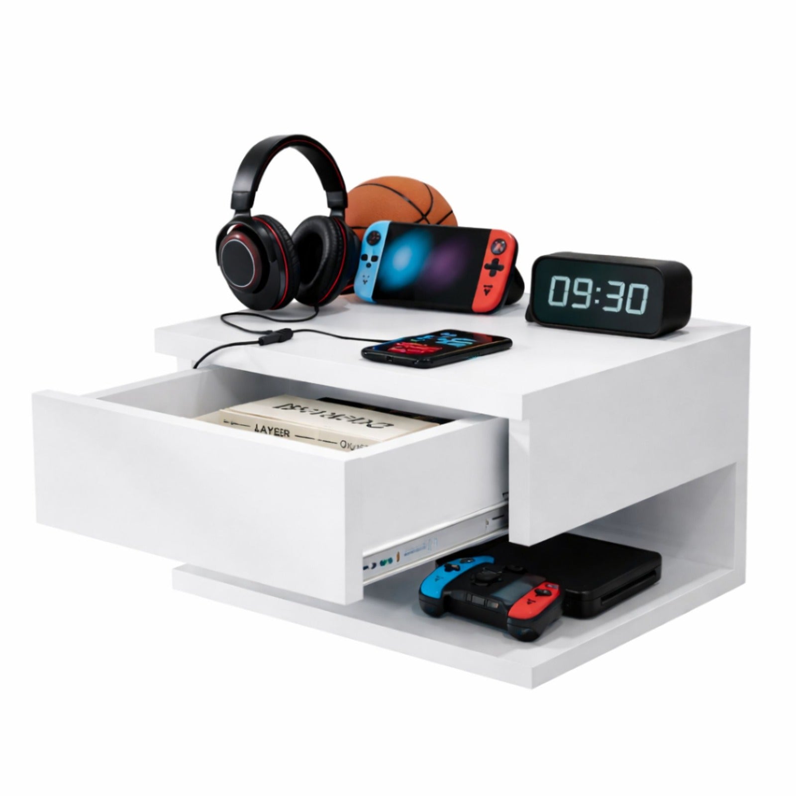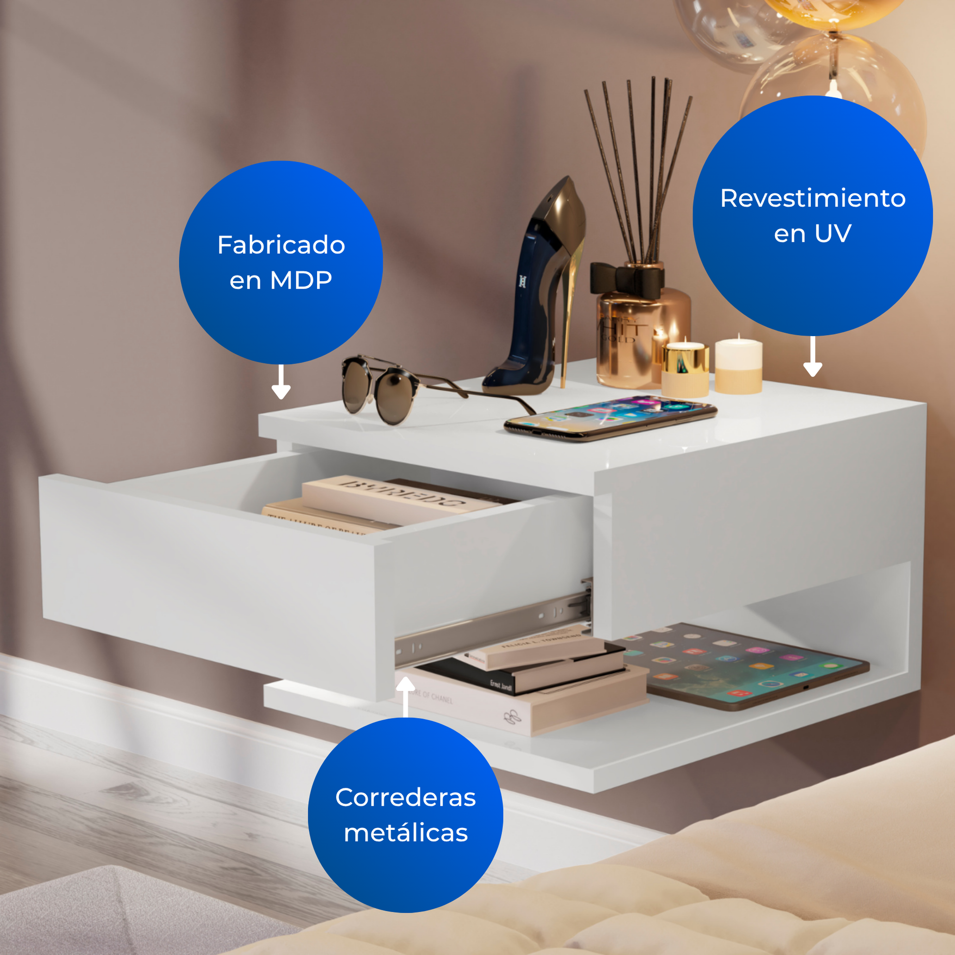 Esta mesa de noche flotante es una excelente opción para quienes buscan practicidad en habitaciones pequeñas. Cuenta con un cajón superior para guardar objetos personales y una repisa inferior abierta que permite exhibir decoración o mantener artículos de uso frecuente siempre organizados. Su diseño compacto la convierte en una pieza funcional, discreta y muy versátil.