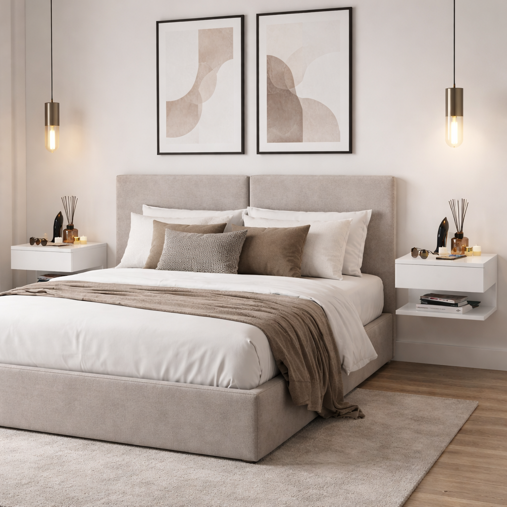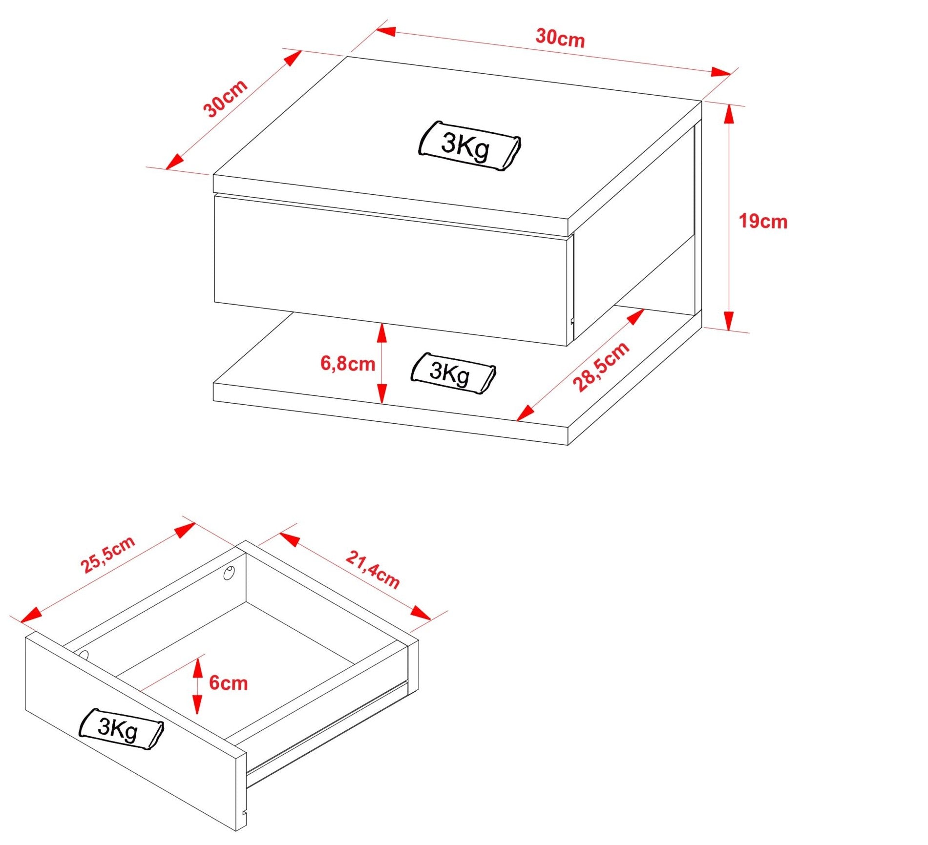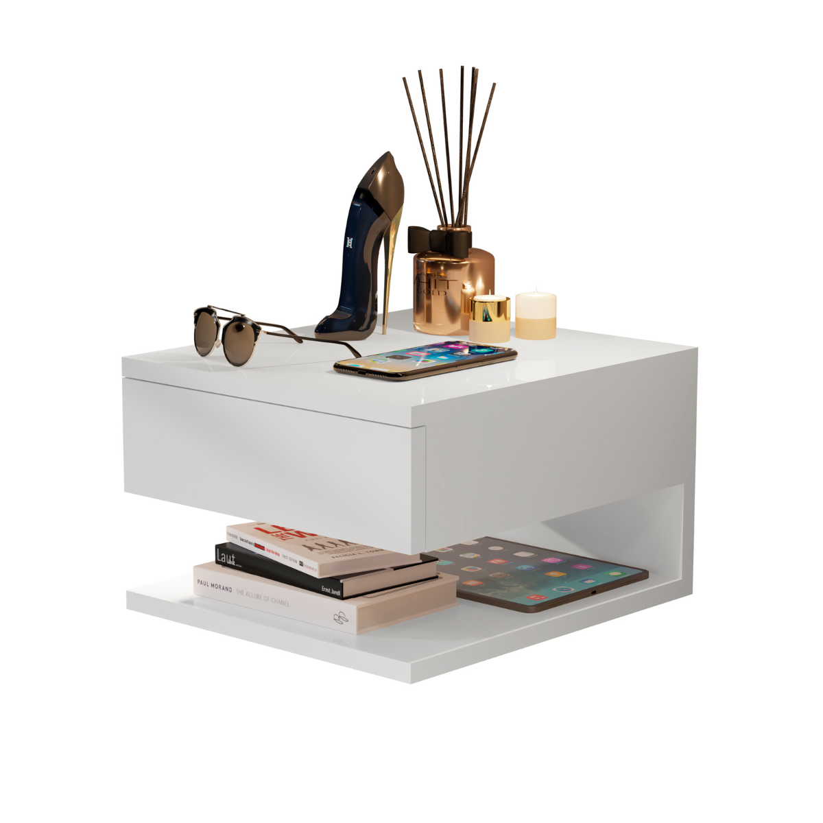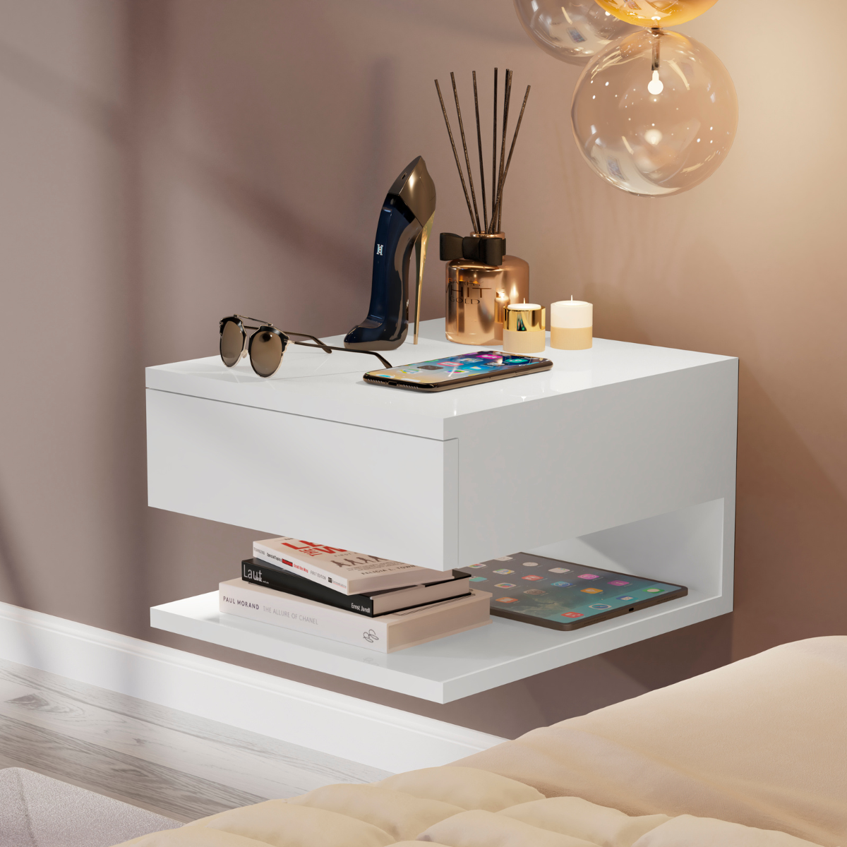 Esta mesa de noche flotante es una excelente opción para quienes buscan practicidad en habitaciones pequeñas. Cuenta con un cajón superior para guardar objetos personales y una repisa inferior abierta que permite exhibir decoración o mantener artículos de uso frecuente siempre organizados. Su diseño compacto la convierte en una pieza funcional, discreta y muy versátil.