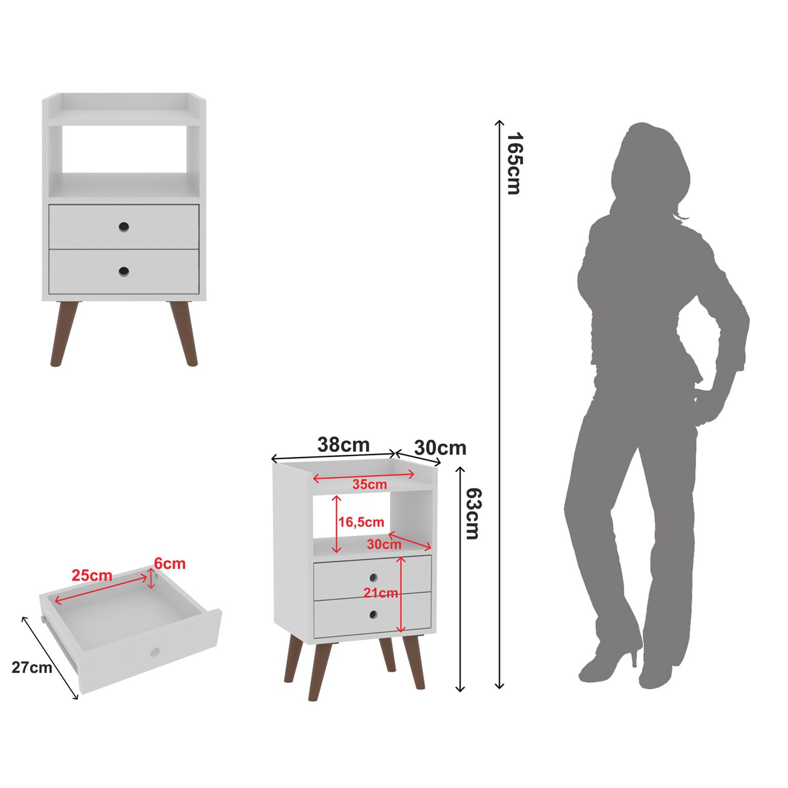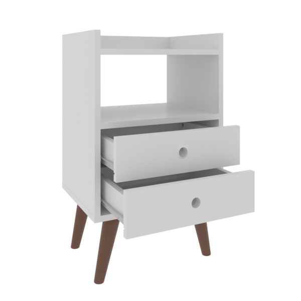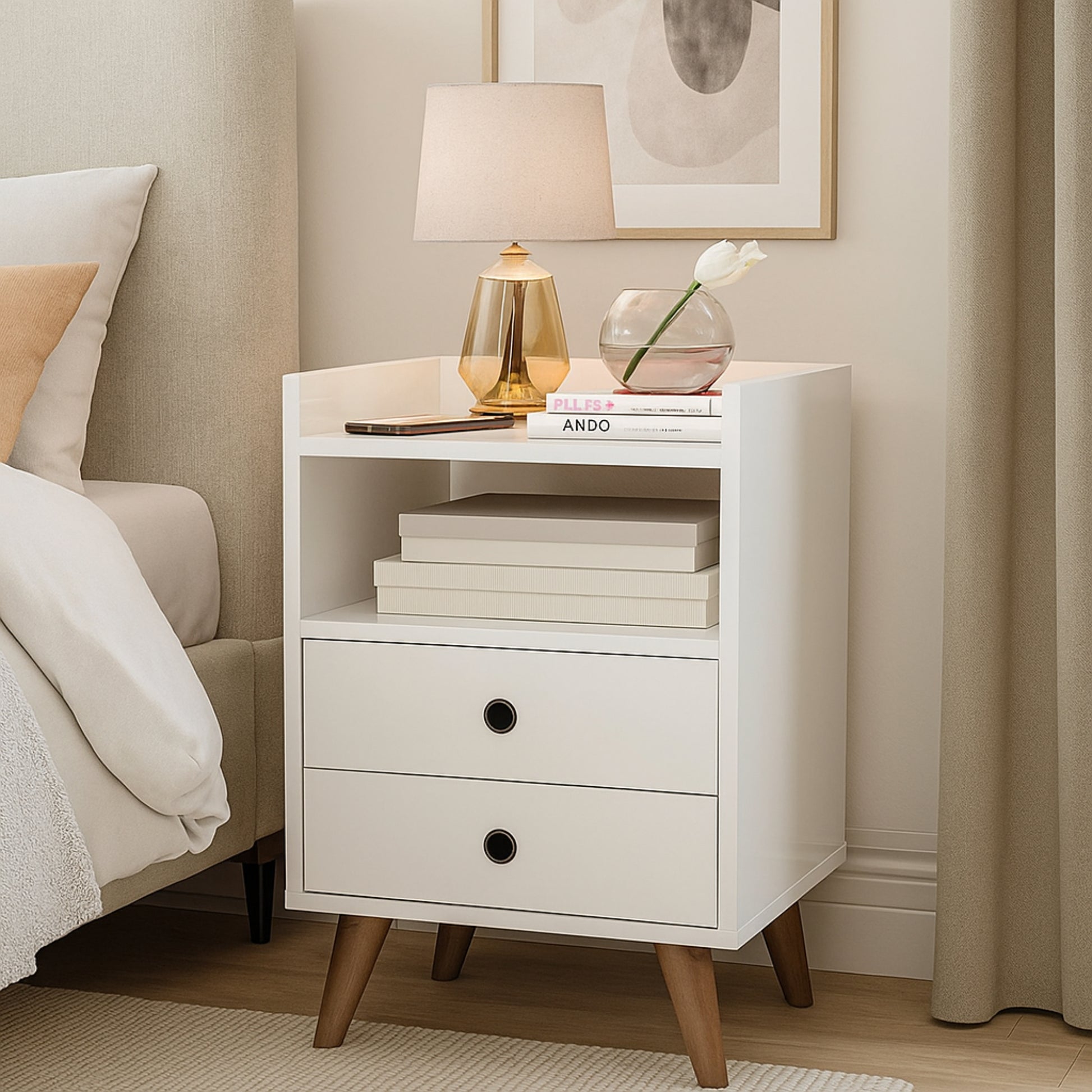 La Mesa de Noche Laos combina funcionalidad y estilo en un mueble compacto. Cuenta con dos cajones y dos compartimientos abiertos que permiten mantener organizados y a la mano los elementos de uso diario, desde libros y accesorios hasta objetos decorativos.