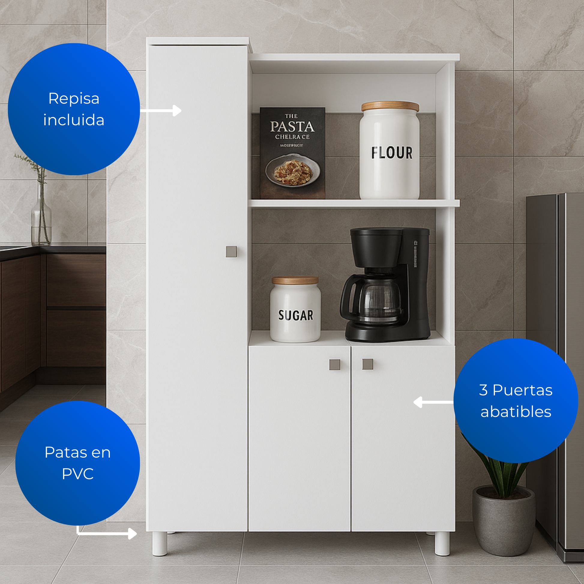 Fabricado en aglomerado de madera con acabado en melamina, ofrece una superficie resistente, estable y de fácil limpieza, pensada para soportar el uso diario en ambientes de cocina. Su distribución con seis compartimientos y tres puertas facilita la organización y protección de todo lo que necesitas tener siempre a mano.