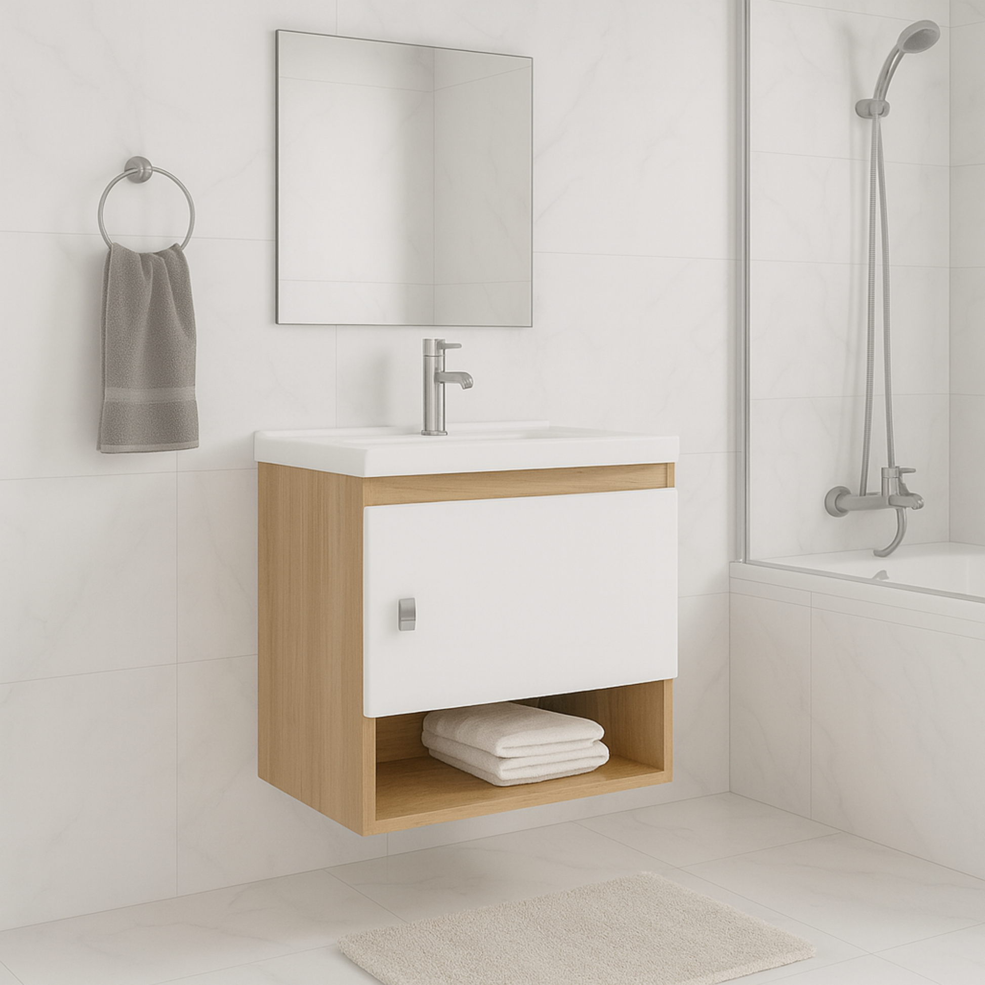 El mueble de baño Linz combina funcionalidad y estilo moderno. Su diseño con puerta, bisagras metálicas y dos entrepaños, facilita la organización y aporta estética al espacio. El lavamanos incluido está fabricado en mármol sintético de alta resistencia, un material duradero, fácil de limpiar y perfecto para el uso constante. Su superficie no porosa evita manchas y humedad, conservando su apariencia con el paso del tiempo.