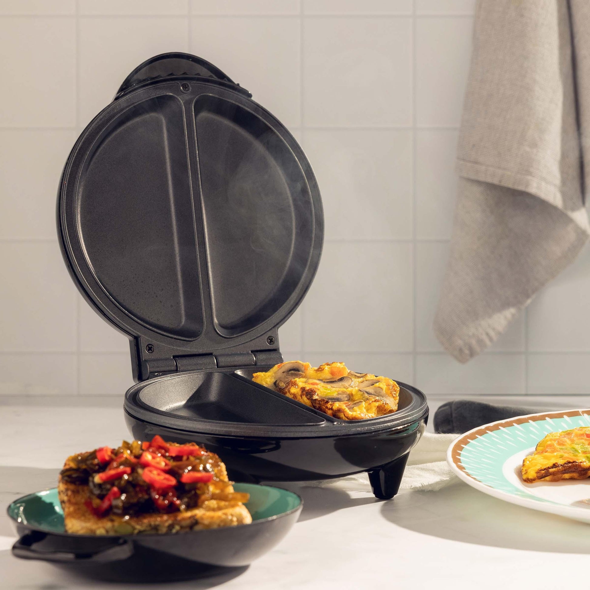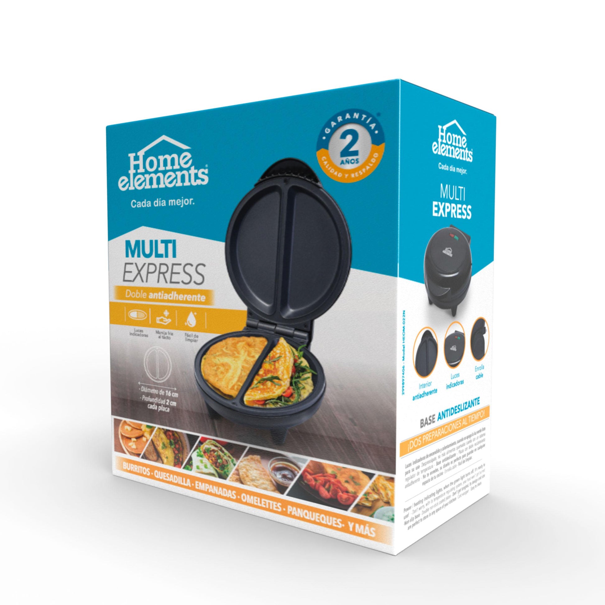 MultiExpress Home Elements ¡Cocina con rapidez y variedad sin complicaciones! La MultiExpress de Home Elements es tu aliada ideal para preparar burritos, quesadillas, empanadas, omelettes, panqueques ¡y mucho más! Sus placas dobles de 16 cm con 2 cm de profundidad están diseñadas para cocinar de forma uniforme, sin que nada se pegue gracias a su doble recubrimiento antiadherente.Además, su diseño vertical con enrolla cable y luces indicadoras de encendido hacen que usarla sea tan fácil como guardarla. Desayunos, almuerzos o snacks... ¡todo en minutos con la MultiExpress!, Peso (Kg) 0,812, Alto 24,5, Ancho 11,5, Largo 20,5