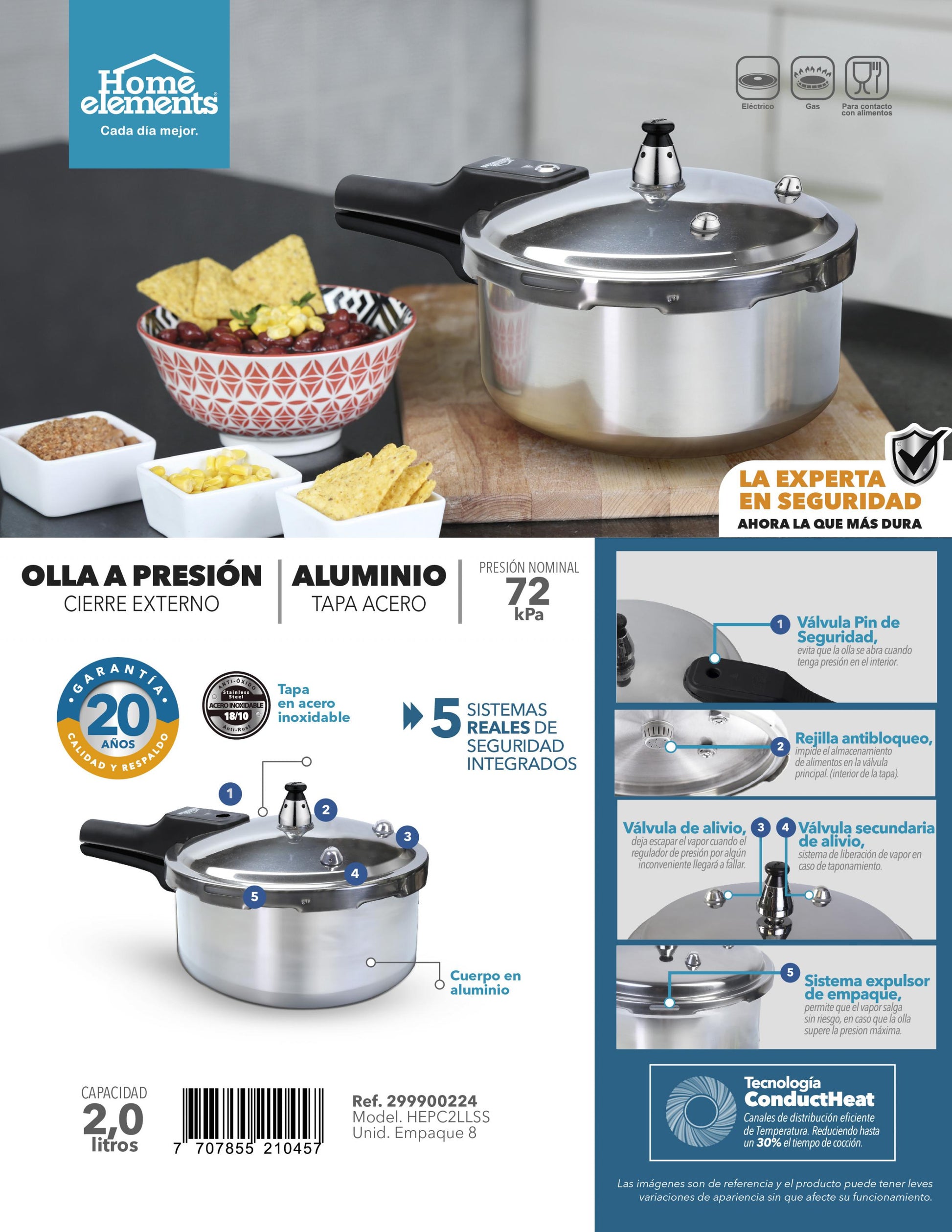 Olla a presión capacidad de 2 litros, presión nominal de 70 Kpa, cuerpo en aluminio y tapa en acero Inoxidable, cierre externo, apta para estufas eléctricas y a gas, versátil y fácil de usar., Peso (Kg) 1,11, Alto 15,3, Ancho 21, Largo 33,5