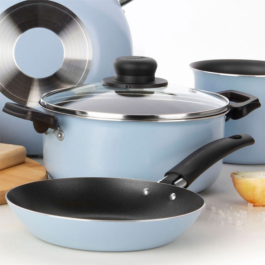 El sartén blue está compuesto con aluminio de 99 7 de pureza revestimiento interno con 7 capas antiadherentes y baquelita antitérmica de 24 cm de diámetro. Este sartén cuenta con capacidad de 1 10 litros.