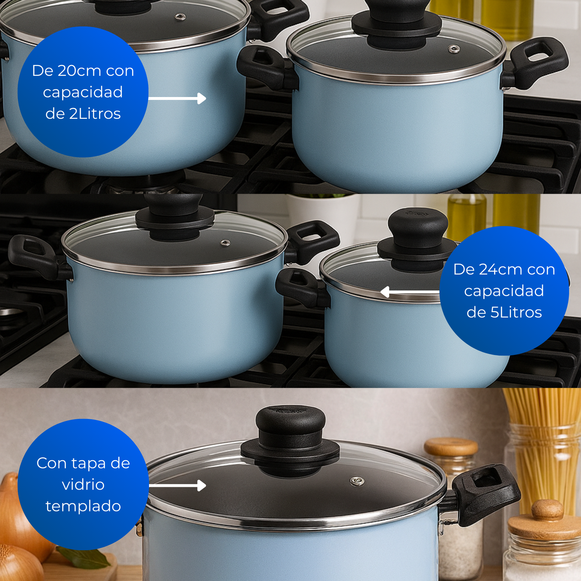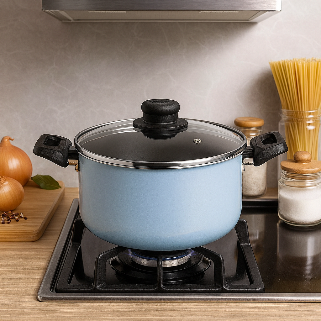 La Olla Blue con Tapa combina eficiencia, diseño y practicidad en un formato compacto. Fabricada en aluminio de alta pureza, con revestimiento interno de siete capas antiadherentes y asas en baquelita antitérmica, garantiza un desempeño confiable y seguro. Su diámetro de 18 cm y capacidad de 2 litros la hacen ideal para preparaciones diarias con precisión y control. Un básico inteligente que demuestra que el buen diseño también se mide en resultados.